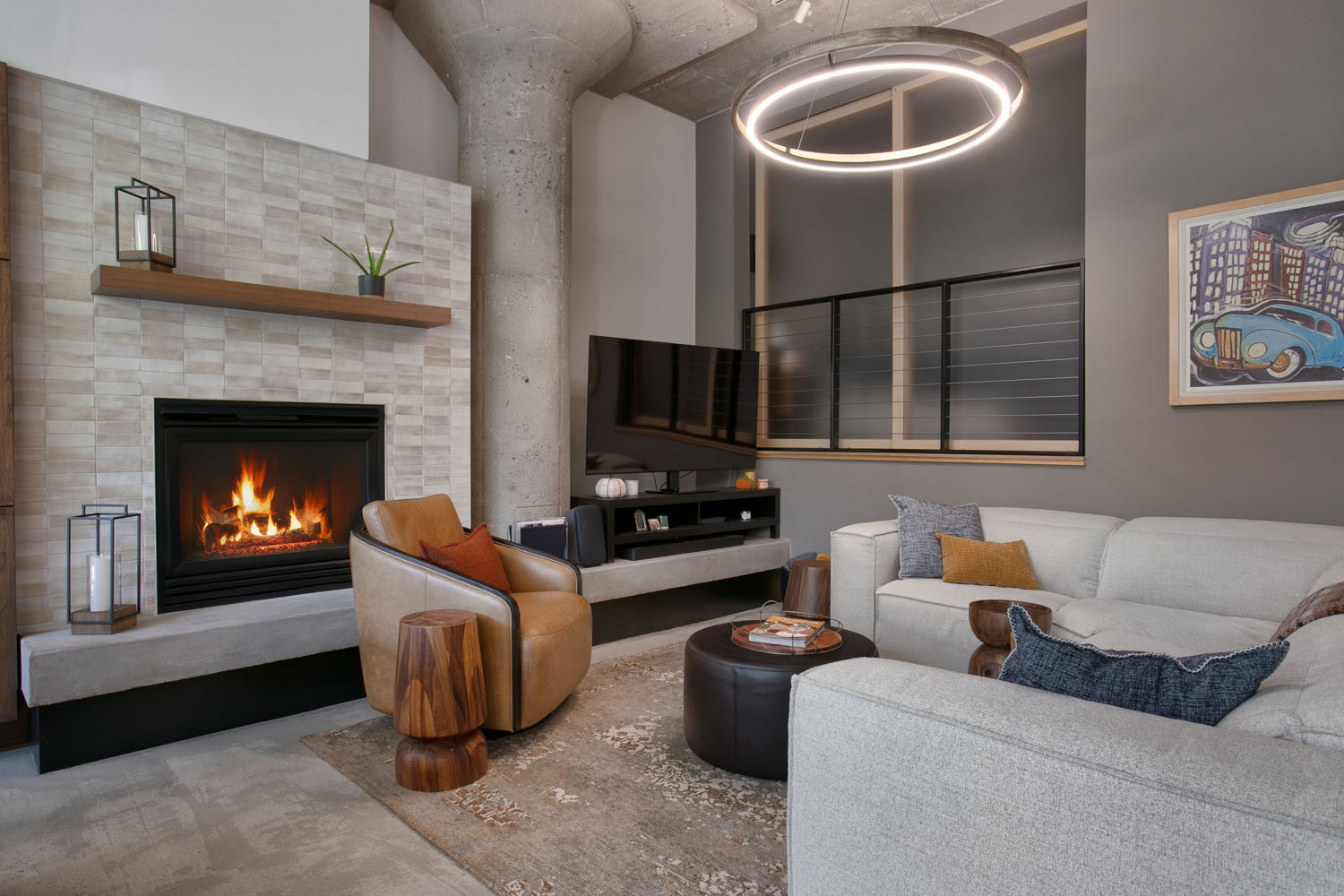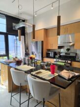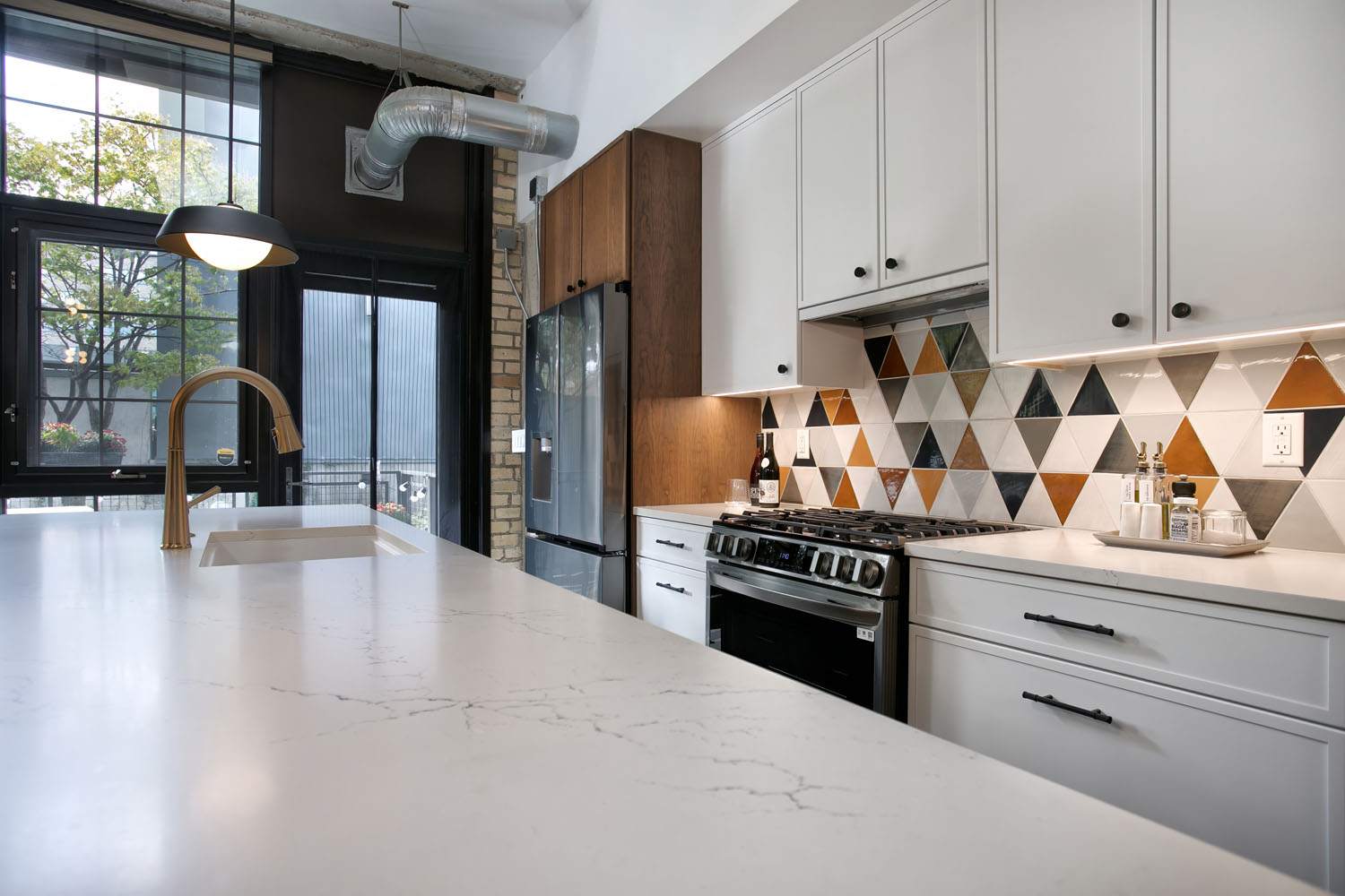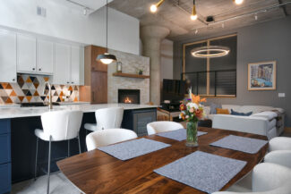This north loop industrial condo needed a refresh for our repeat clients who were used to an updated, functional and beautiful space like the kitchen we remodeled for them in the past. The dated maple cabinets were failing and unfunctional and didn’t match their design style. A new, colorful space was dreamed up creating a fun and exciting space for them to start their new chapter in life. Creative cabinetry offered them more usable storage, durable Cambria countertops add softness and character, and Mercury Mosaics tiles give the space big personality and set the color palette for the kitchen, living room and dining room. New lighting and an updated fireplace surround pull together the open concept living space and provide cohesion throughout. Warm colors and textures help balance out the industrial feel and finish of the rest of the condo, creating a new cozy, home-like feeling for the homeowners for years to come.