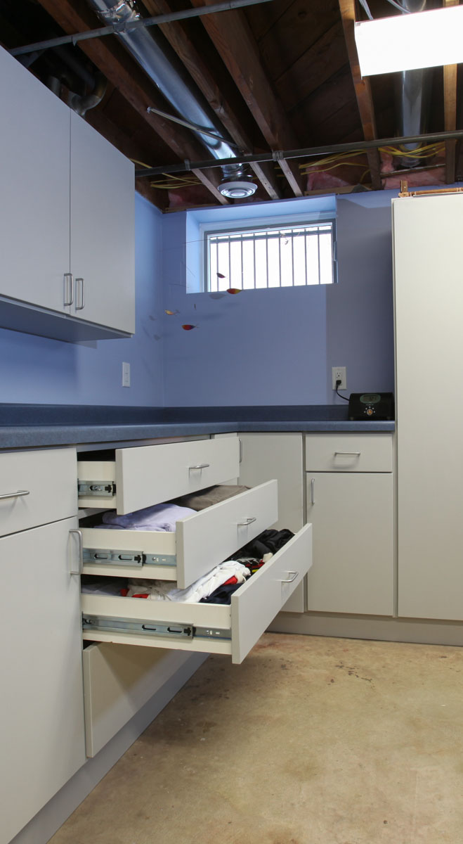 Finally, if you utilize your basement for more utilitarian purposes, consider installing custom cabinetry or built ins to fit your needs. They can be both aesthetically pleasing to the eye and functional.