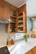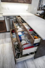 Cabinets can be more than just shelving. Roll outs, lazy susan’s, and drawer pull outs are all popular additions. Another unique option is building your spice rack right into your cabinetry. Knife blocks in drawers, pot/pan/lid storage, tray dividers, the list goes on!