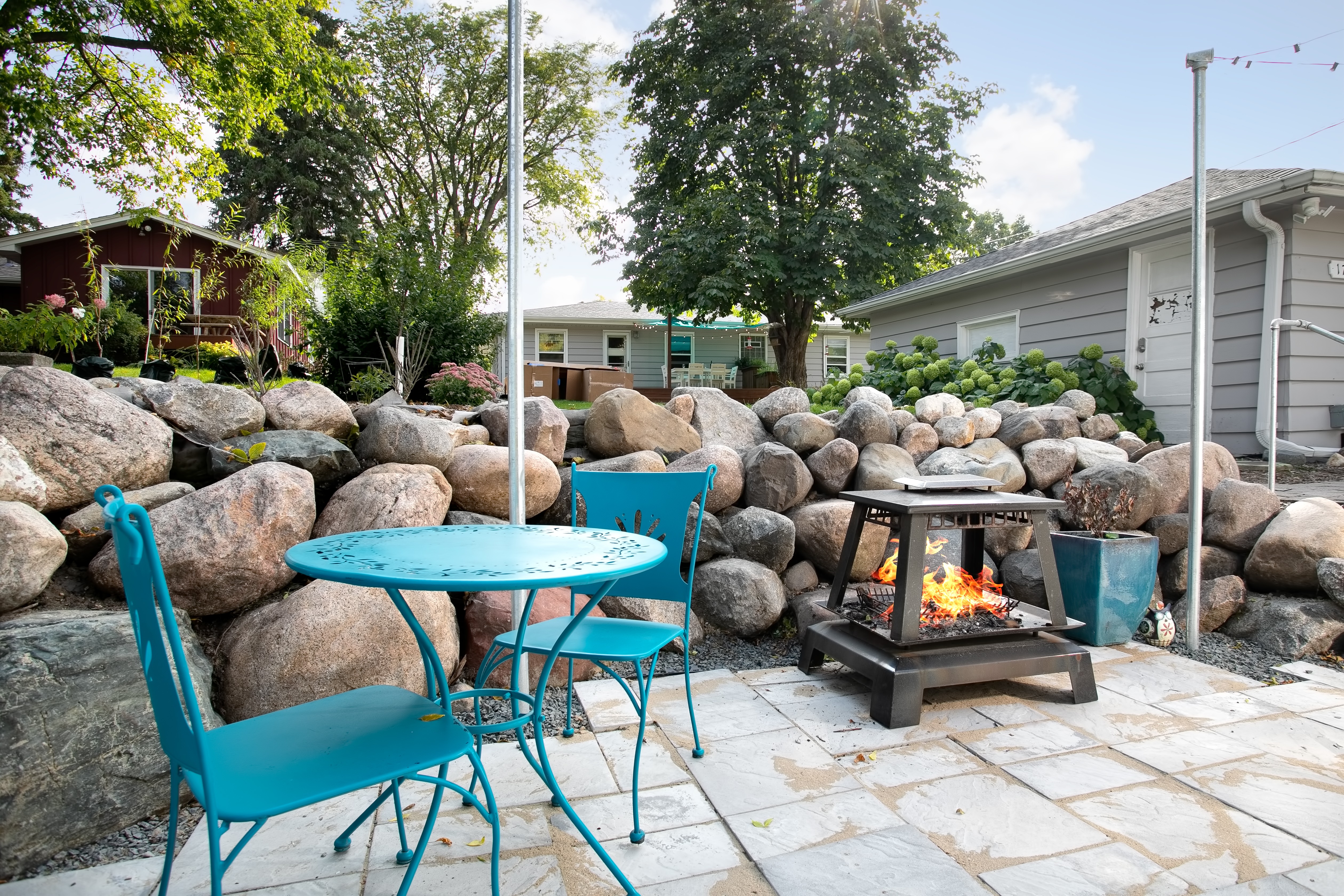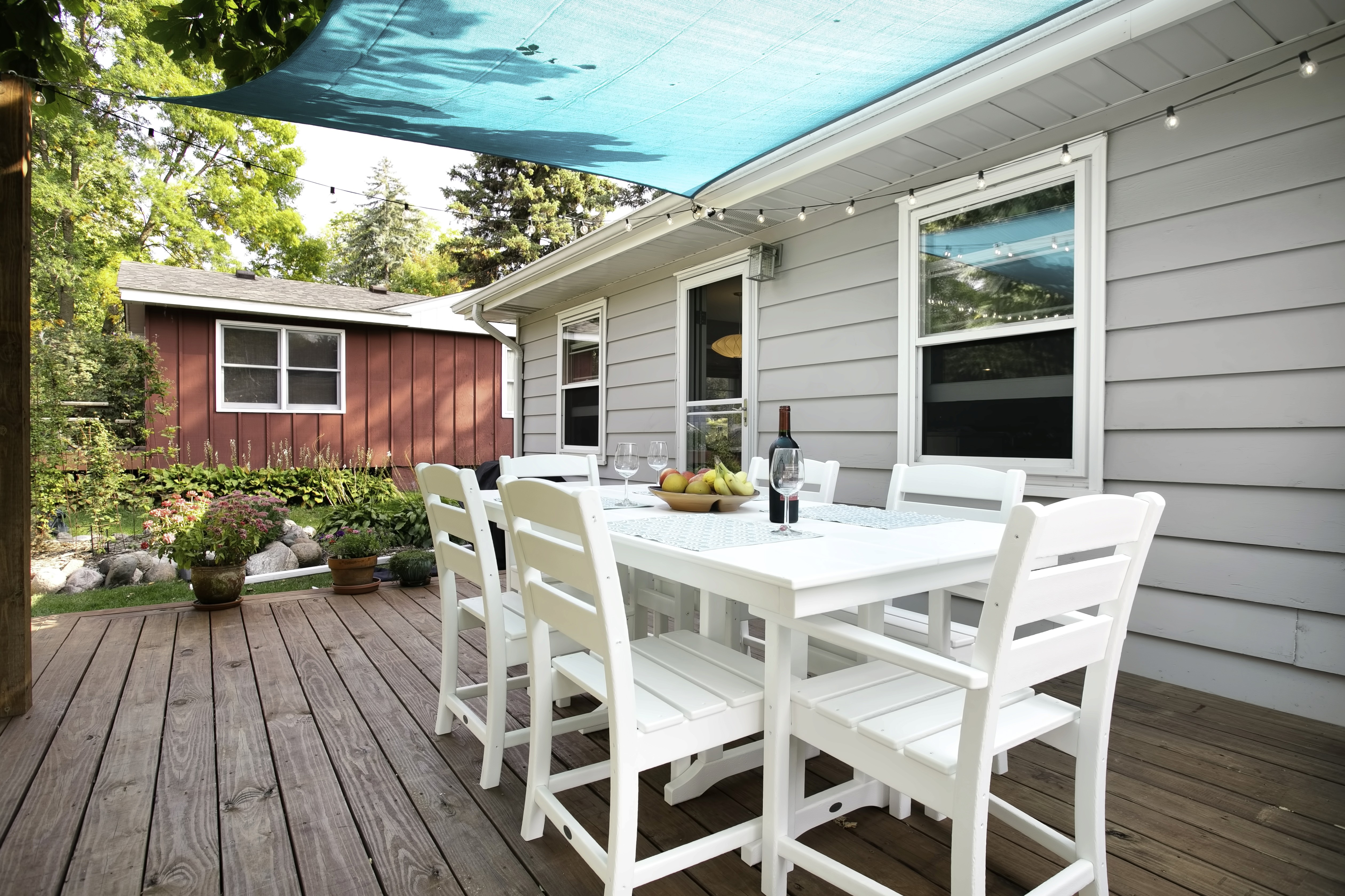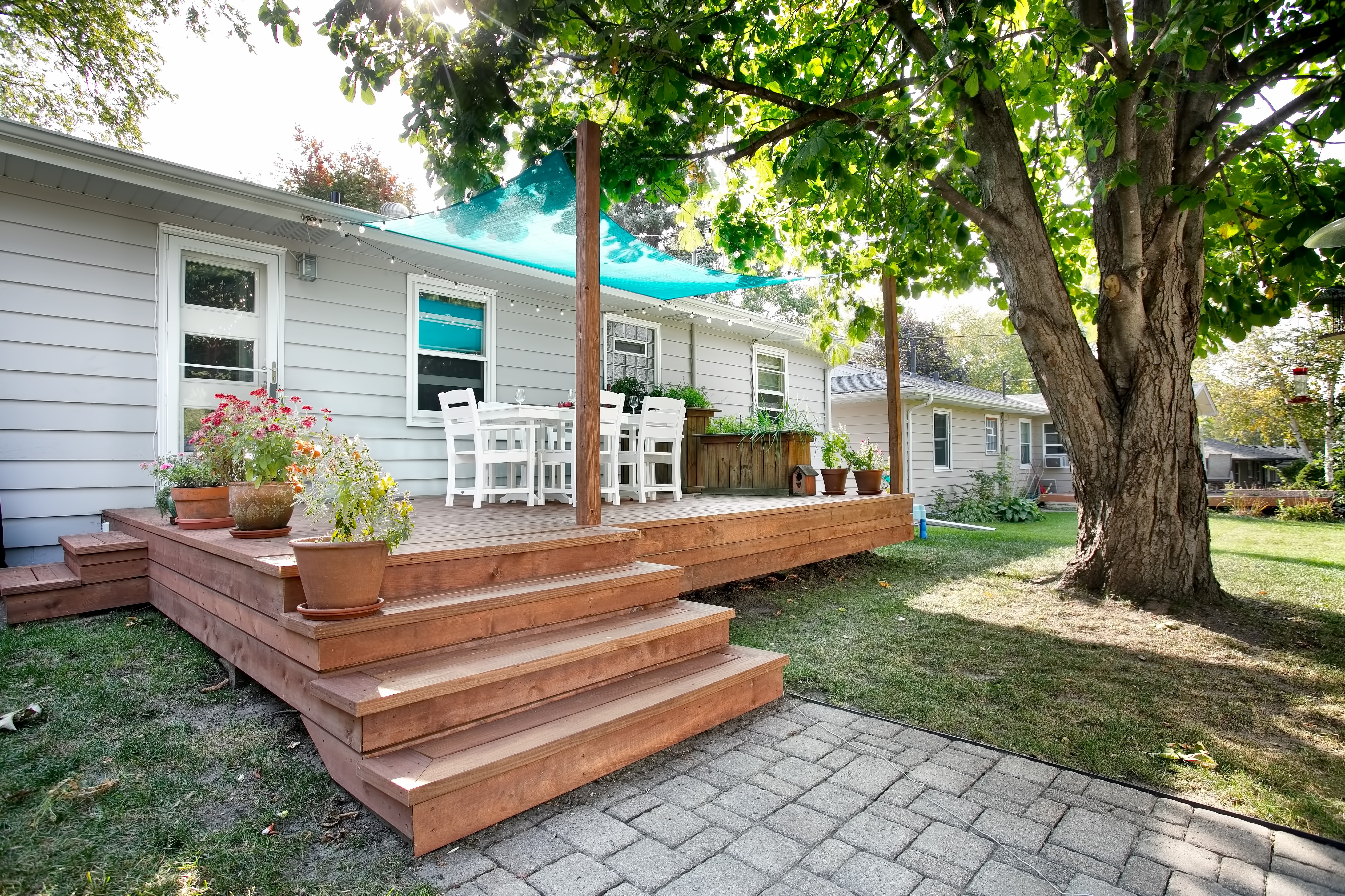 While the existing deck of this rambler / ranch in Northeast Minneapolis certainly provided a place to relax during the sweet Minnesota summer evenings, the homeowners were ready to update and add an additional patio space. The open deck was replaced with treated cedar decking in a warm cherry tone. A stone path takes visitors from the deck stairs to a designated area, complete with chairs, private screen and a fire pit. Additional shade was created with a fabric pergola in a fun blue shade that carries the mid-century modern aesthetic throughout the interior of the home to the exterior space.