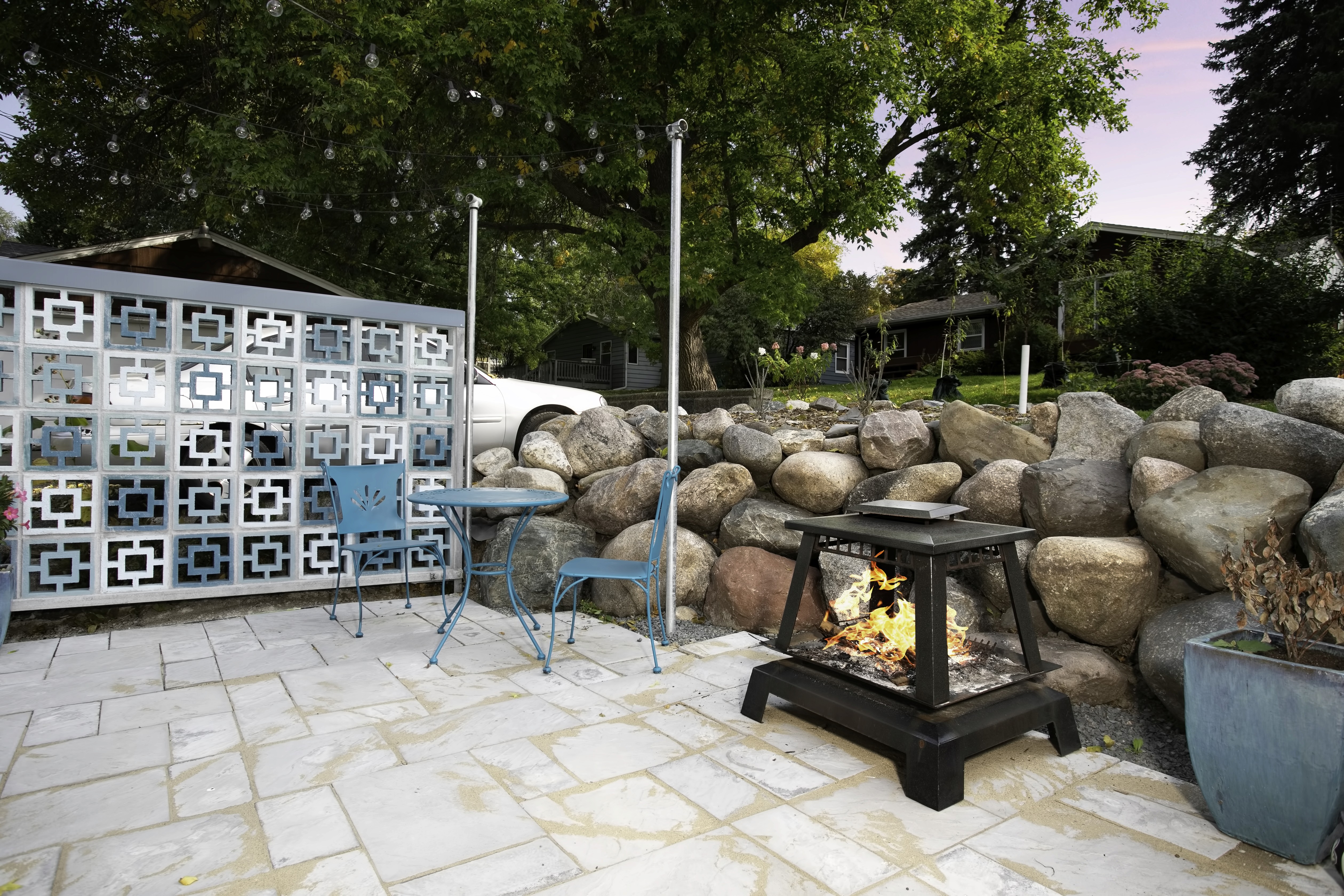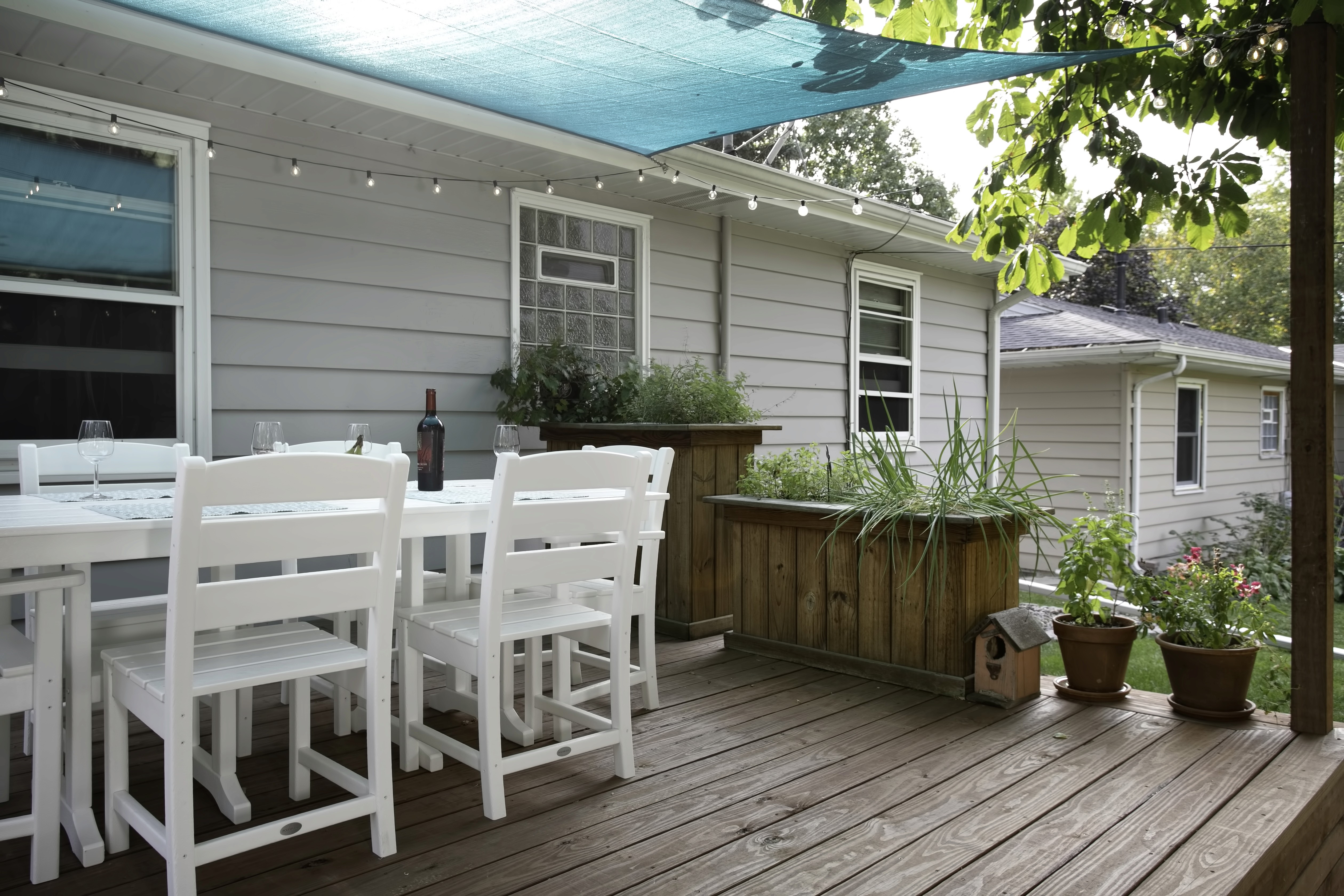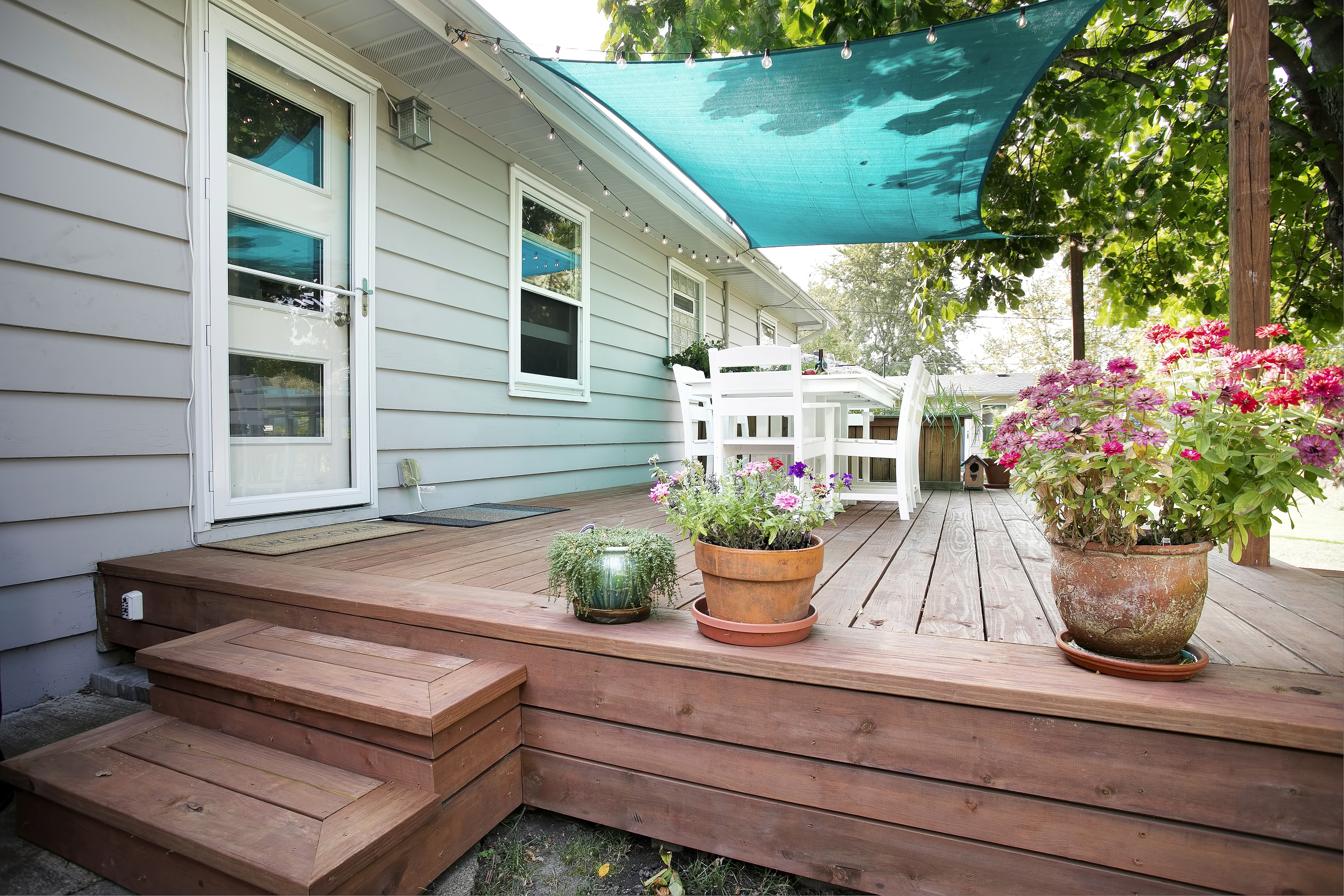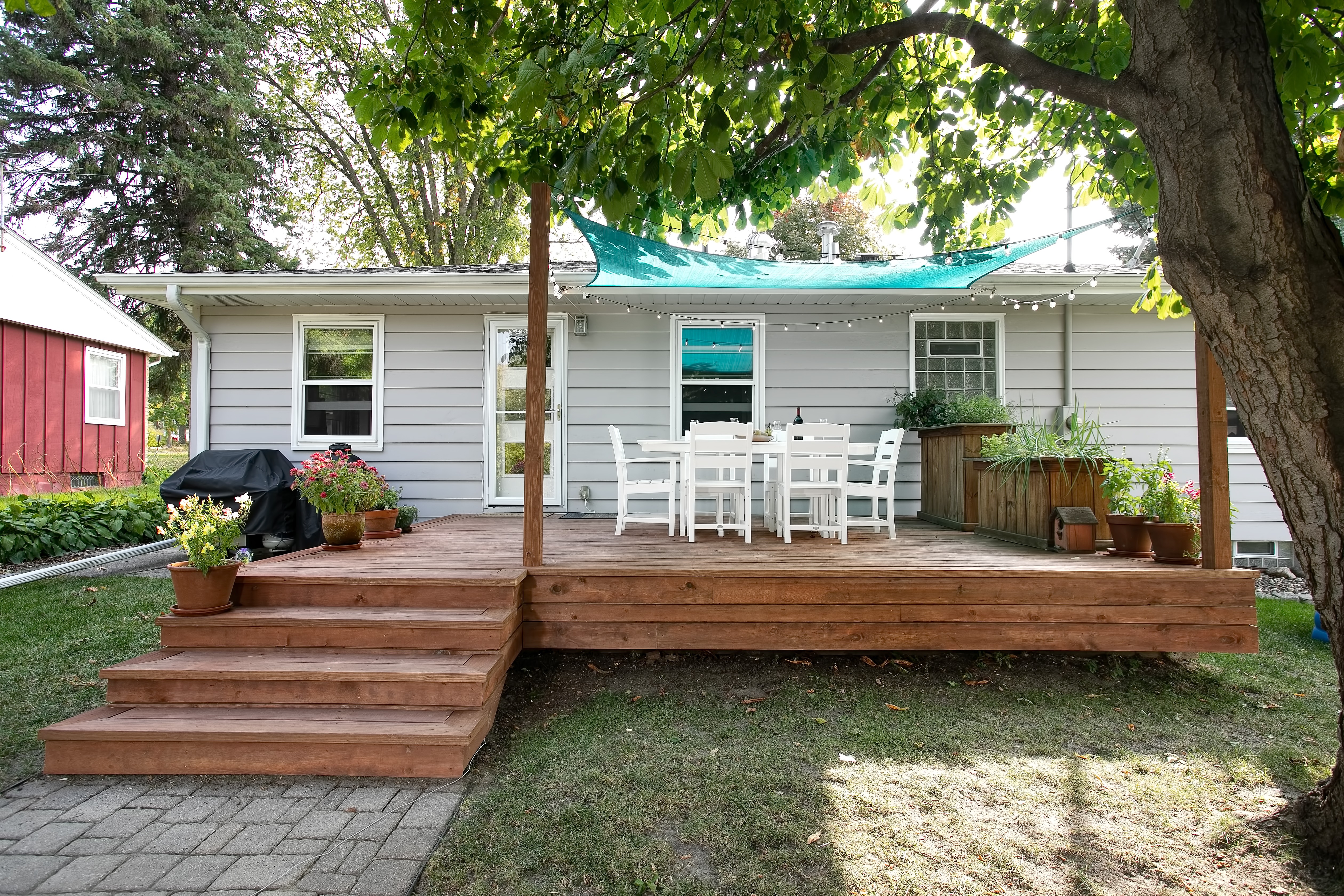 While the existing deck of this rambler / ranch in Northeast Minneapolis certainly provided a place to relax during the sweet Minnesota summer evenings, the homeowners were ready to update and add an additional patio space. The open deck was replaced with treated cedar decking in a warm cherry tone. A stone path takes visitors from the deck stairs to a designated area, complete with chairs, private screen and a fire pit. Additional shade was created with a fabric pergola in a fun blue shade that carries the mid-century modern aesthetic throughout the interior of the home to the exterior space.