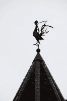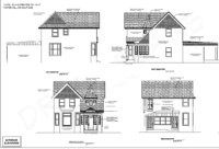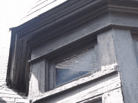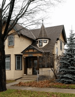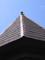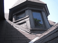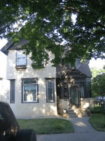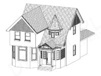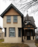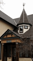 This project was designed to correct water damage inside the porch and to makeover the exterior of the home. A covered entry with columns over the existing concrete stoop was added, which extended the present roof line and detailed out approximately 4′. Several roof lines and overhangs were extended to correct water issues. Existing asphalt shingles were torn off and new architectural shingles were installed. Six French in-swing windows on the front porch were replaced with similar windows. Diamond-shaped shakes that had worn through were replaced on all three gables and decorative woodwork was added back to the fascia to mimic the original look of the home. No stucco work was included in the project, however all of the wood trim on the house was painted with a new varied color scheme. Crowning touches on this project were the handmade clay decorative rosettes and house numbers by Clay Squared and the rooster on the top of the turret created by local artist Durk Dubois.
