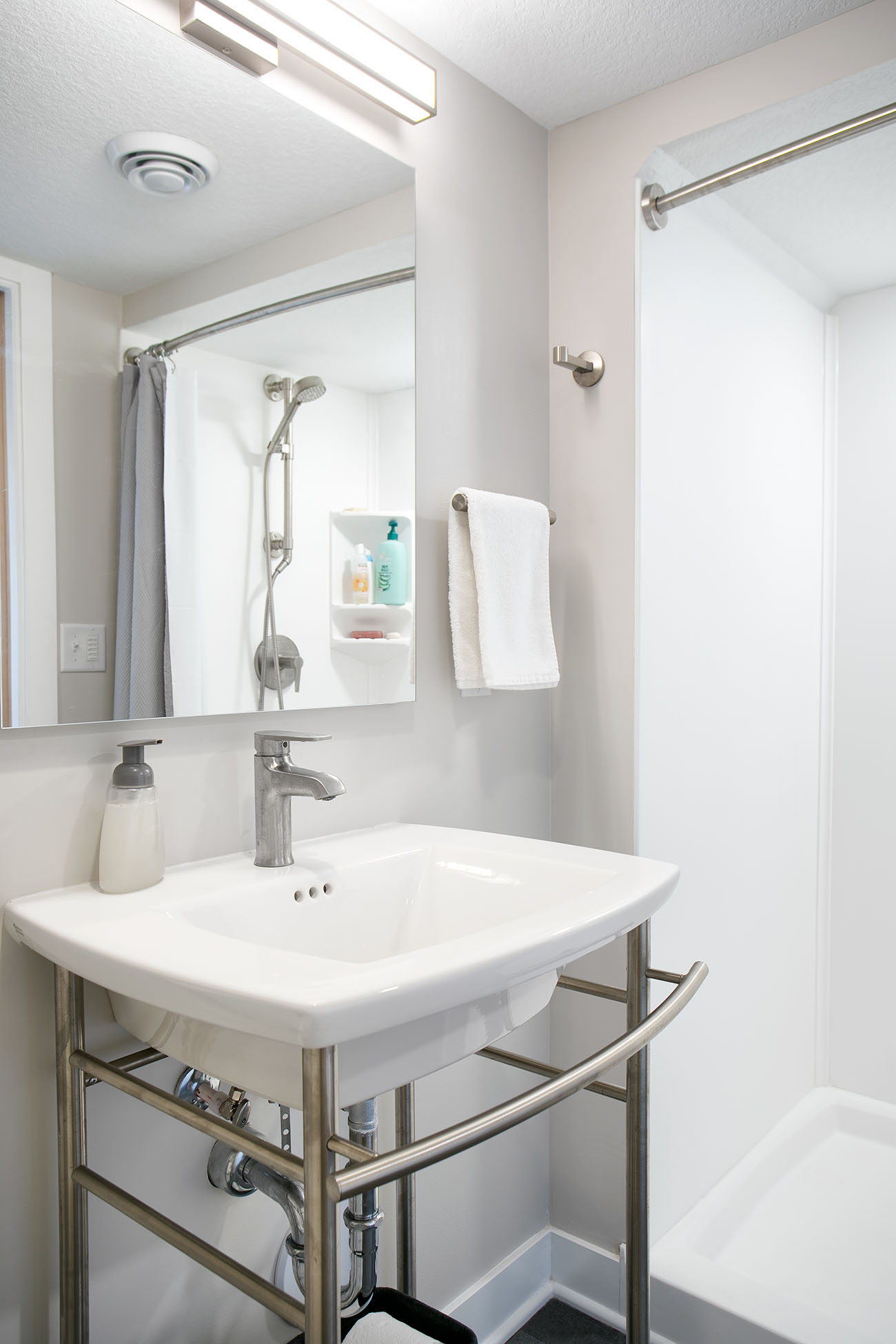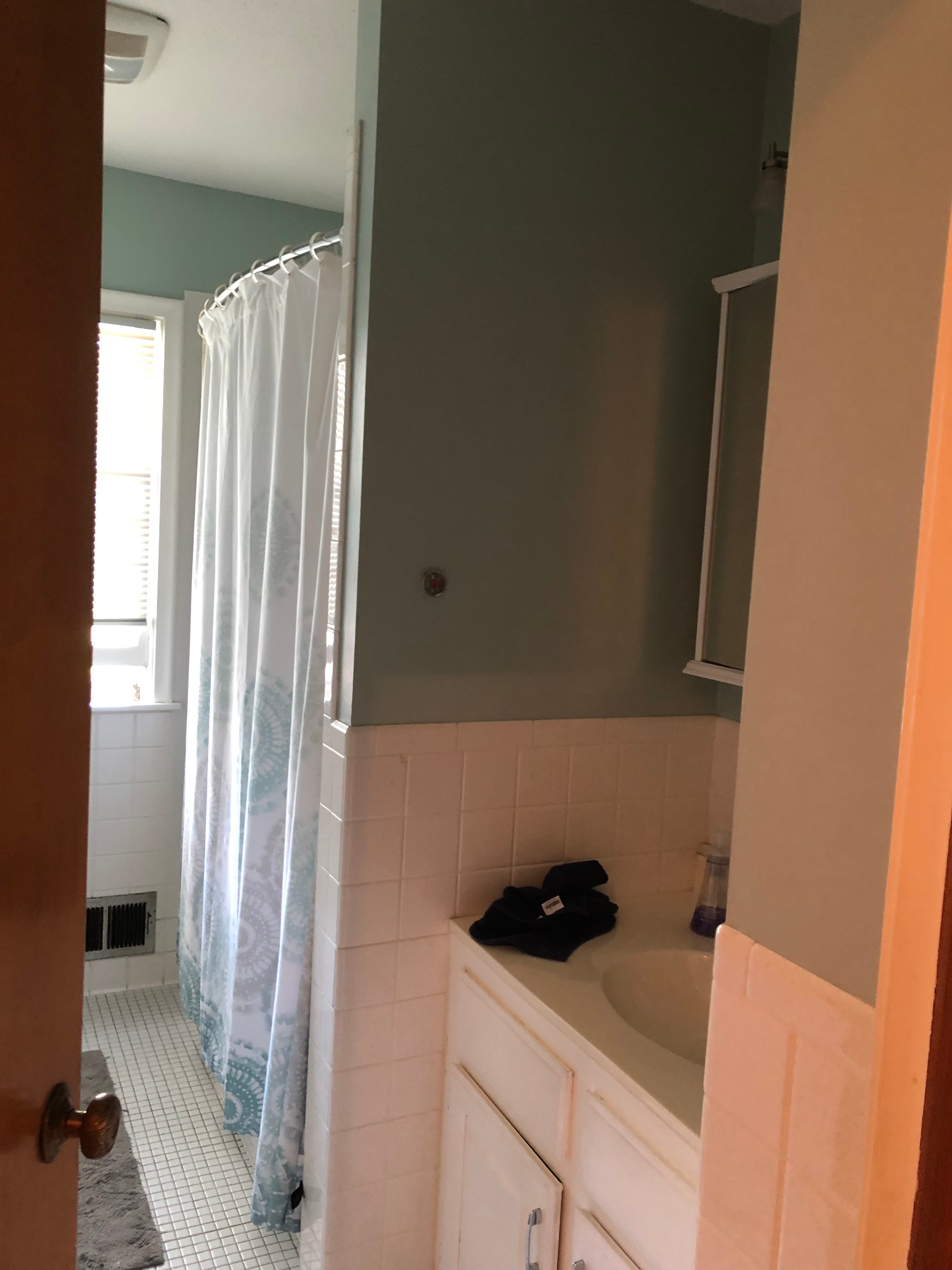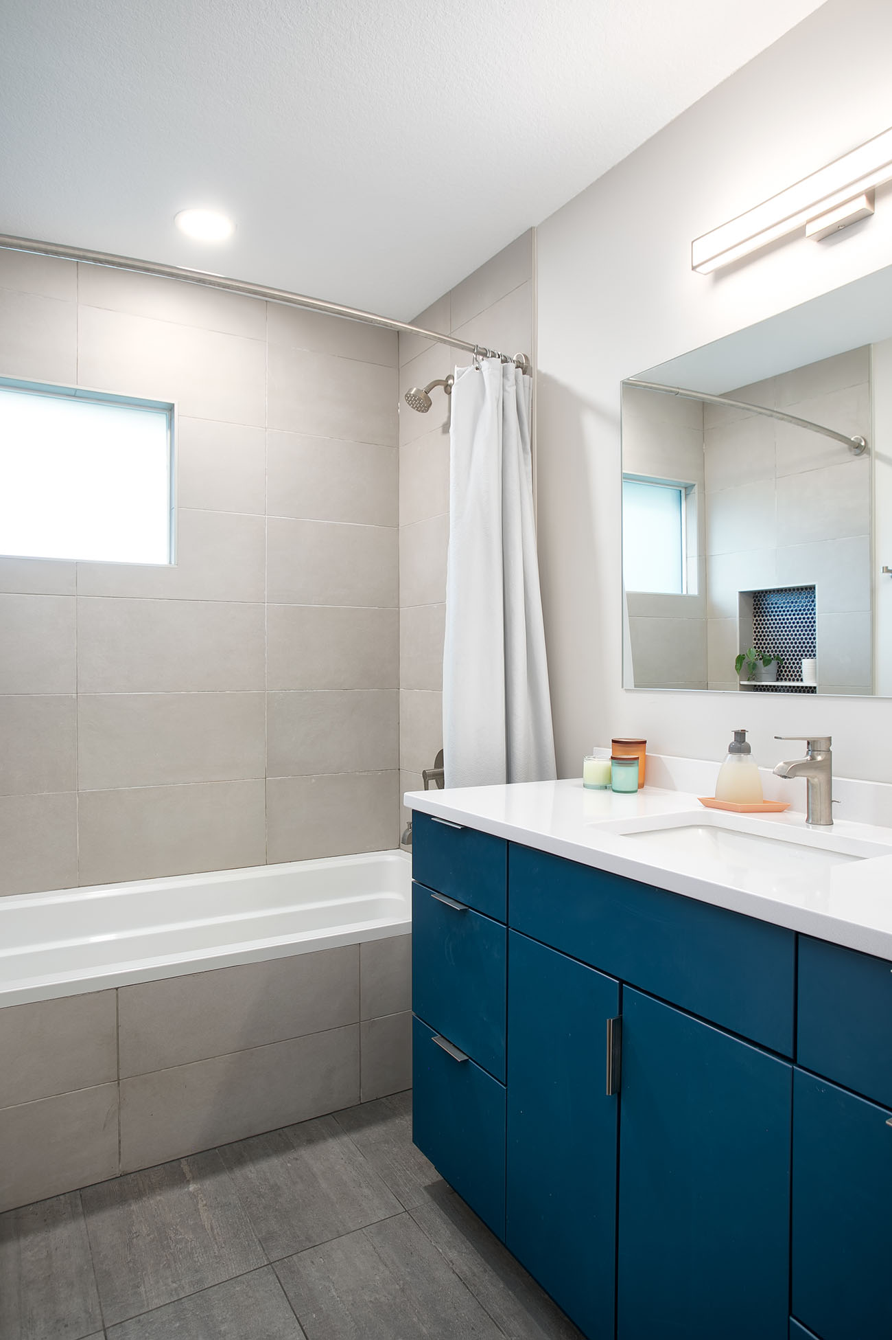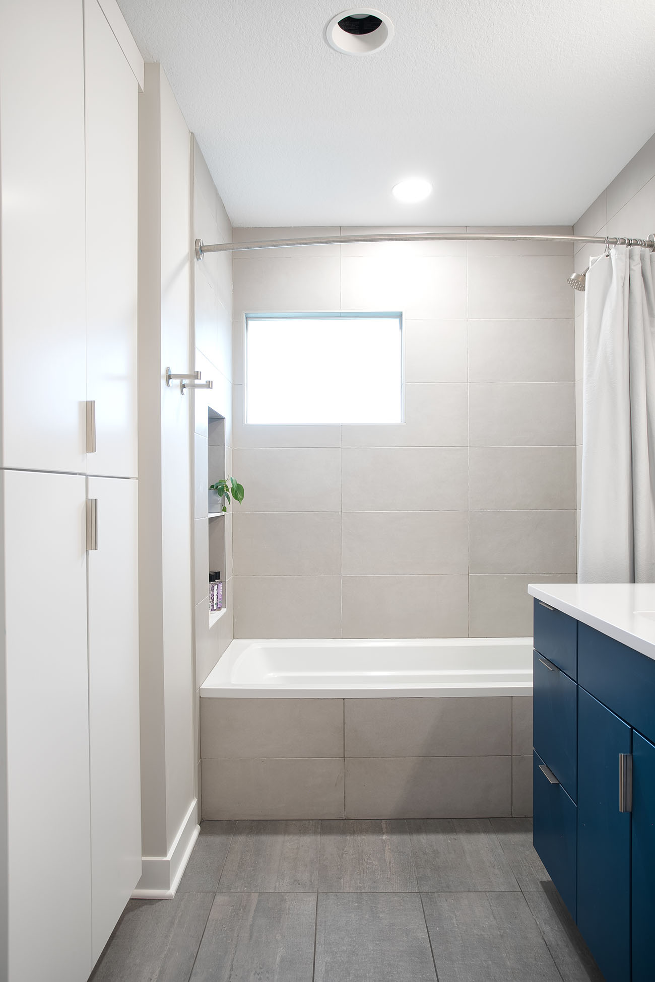 Main floor hall bath: The homeowners decided to do a full remodel to create better layout of the room. This included adding a new white Crystal Frameless linen cabinet, a larger Crystal Frameless vanity in blue, a brand new window, and new tub. The room was complete with brand new ceramic tile floor and the tub/ shower walls. A custom accent tile was installed in the shower niche.