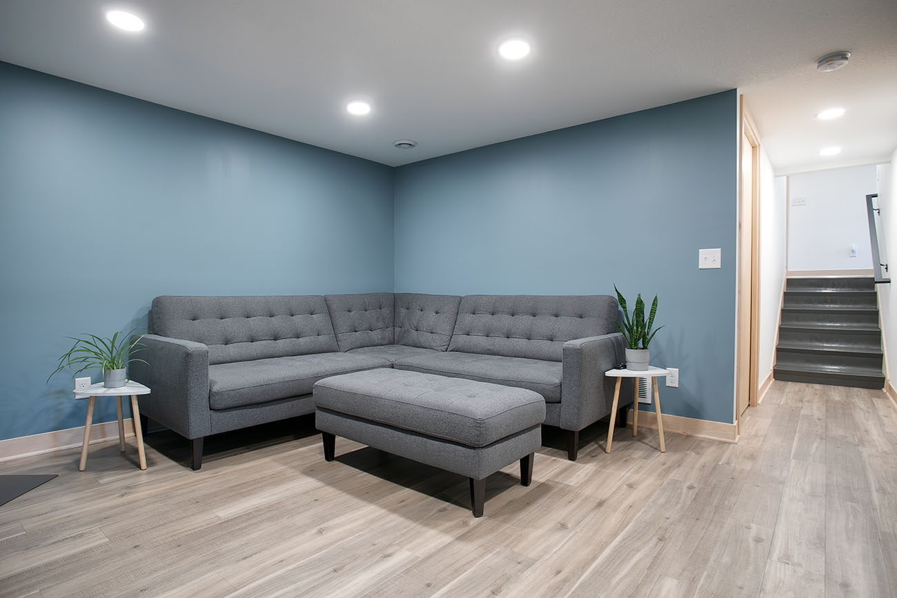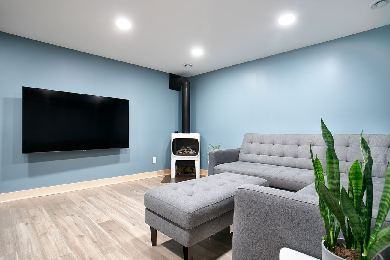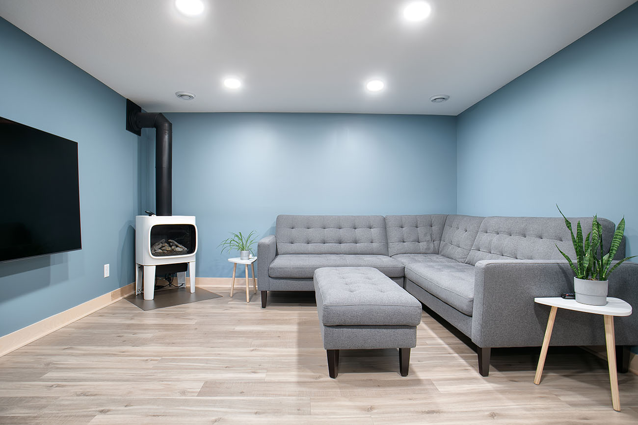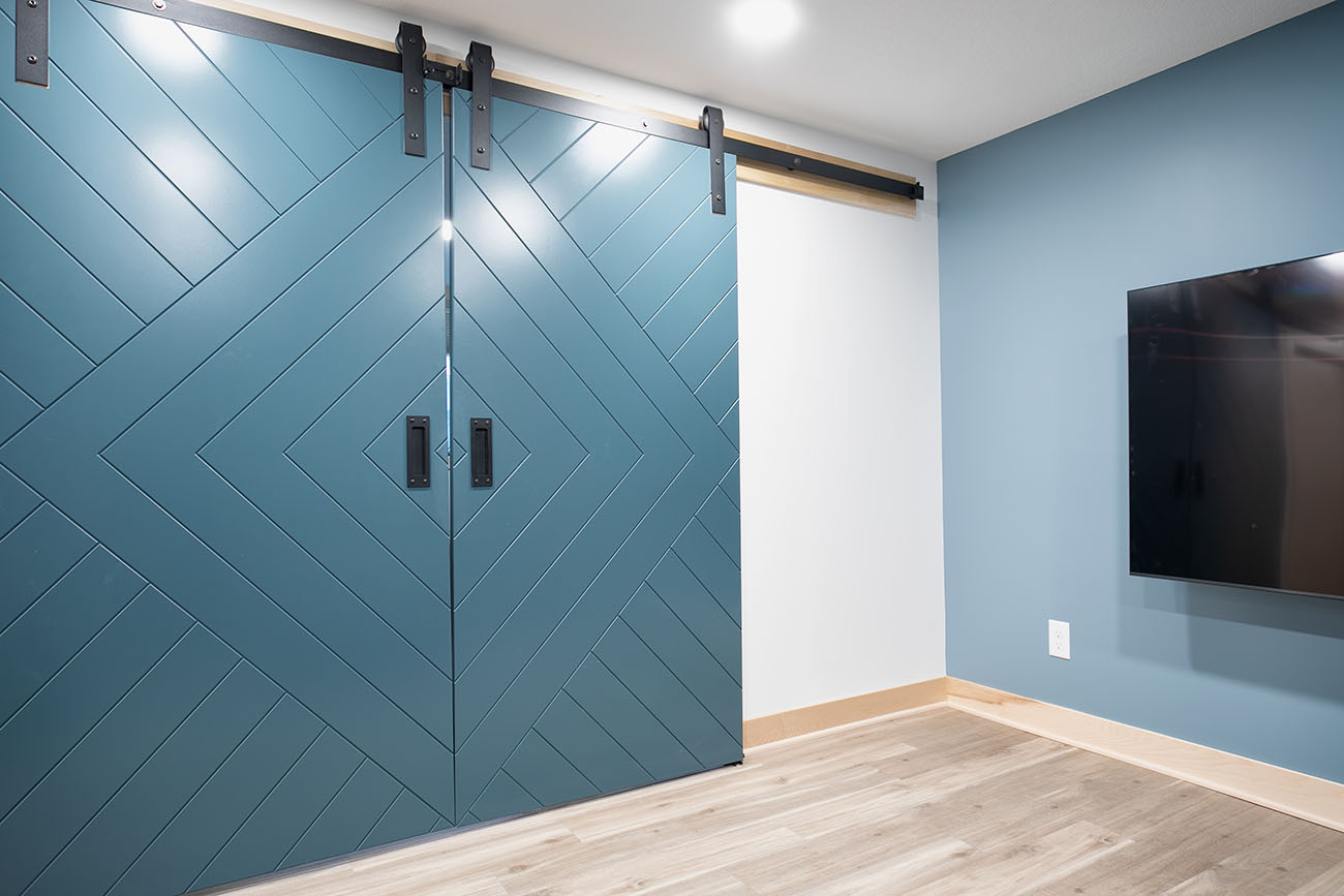 Basement level: The homeowners chose to do a complete full finish of the basement with framing for a new family room, utility room, bedroom and future second laundry. The space also features a second modern gas stove. The entire basement was finished with new Adura LVP wood plank flooring. The most unique feature in the space is the use of double custom barn doors from the