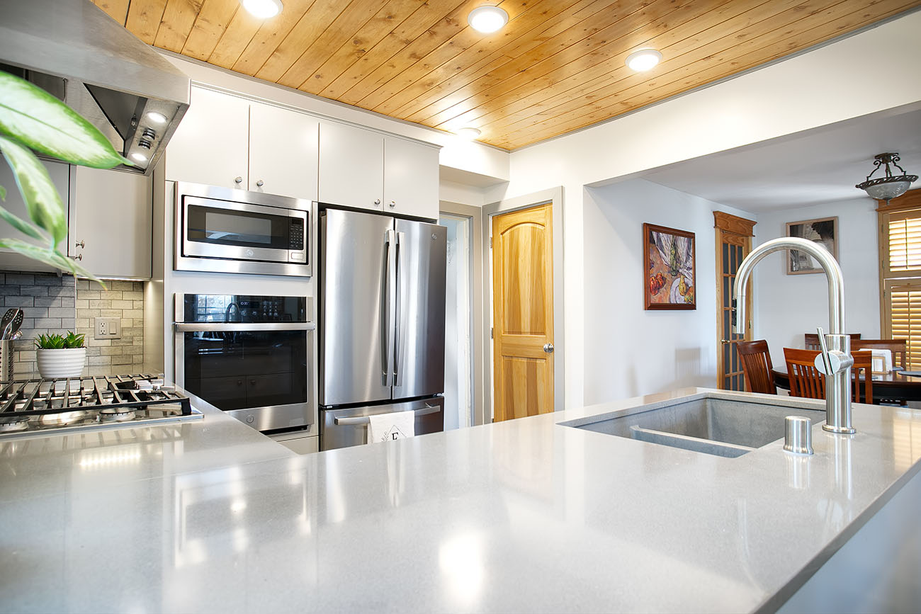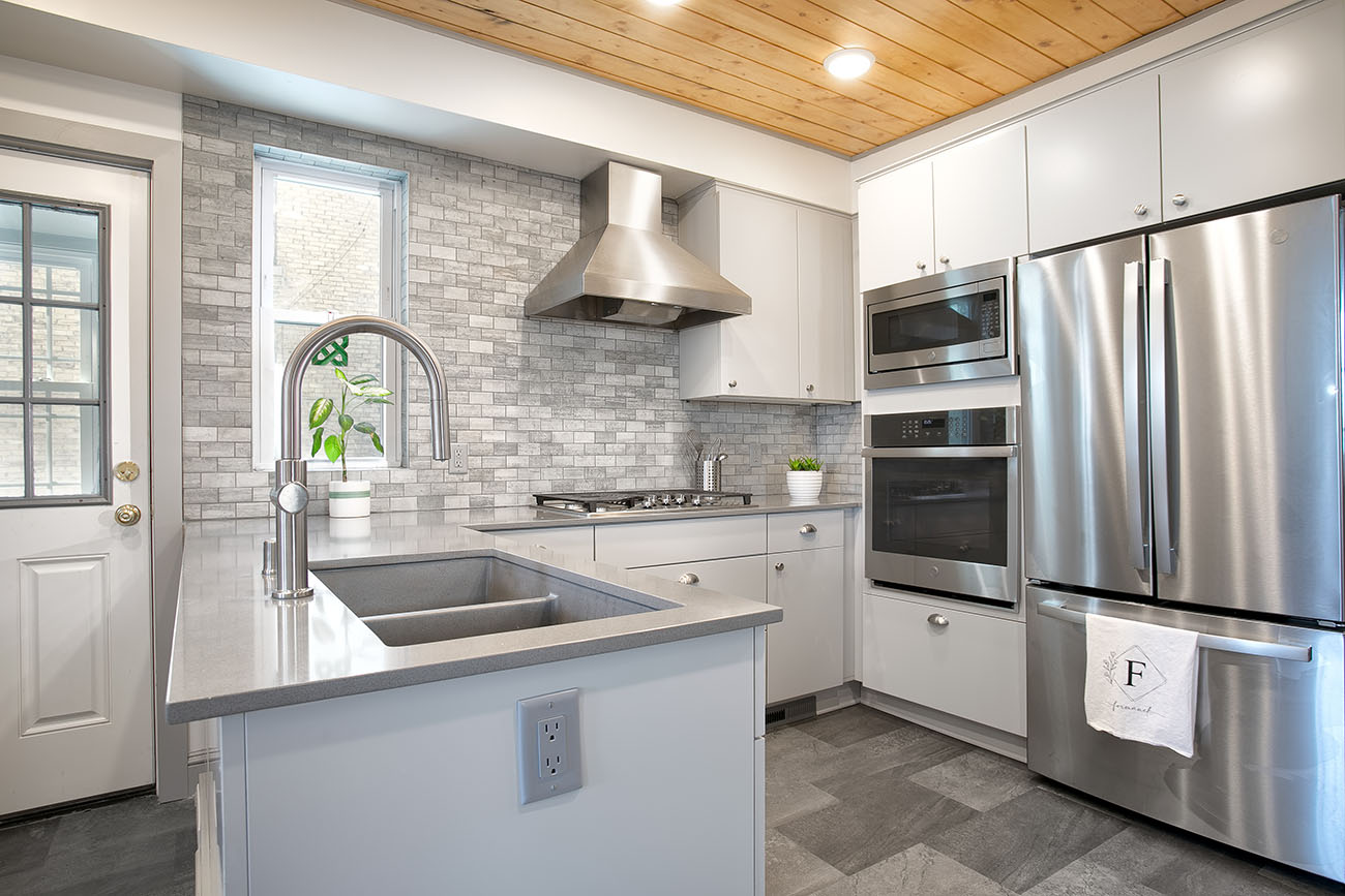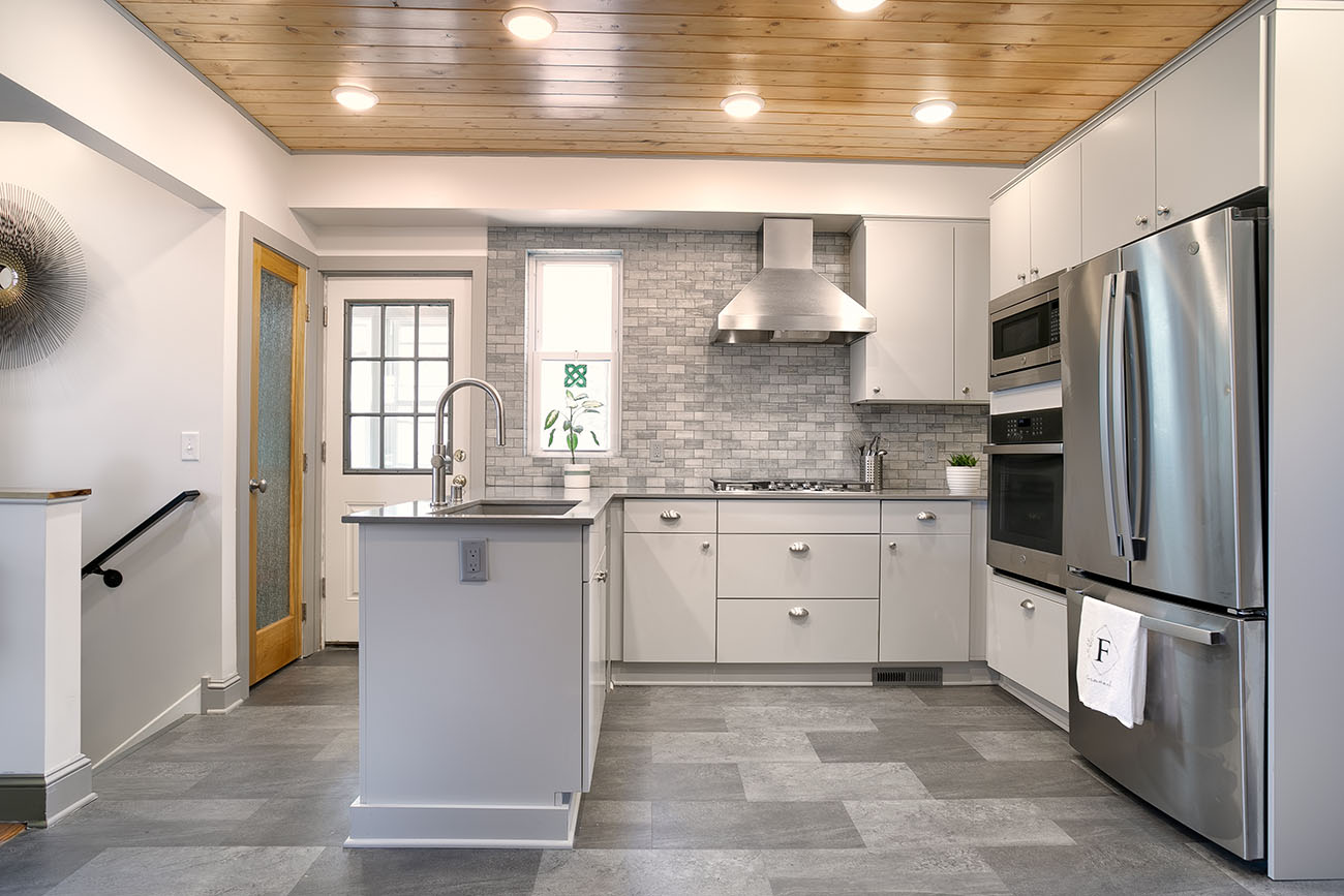 The new kitchen features sleek gray cabinets that compliment the brand new stainless steel appliances. To bring depth and dimension to the space, a textural natural stone backsplash and gray silestone countertops were selected. The homeowner did his own painting in the kitchen. For a pop of color, he included a green accent cove which matches the unique original trim that is continued throughout the rest of the home. Finally, the pantry found itself relocated to make way for a brand new staircase leading down to the basement.