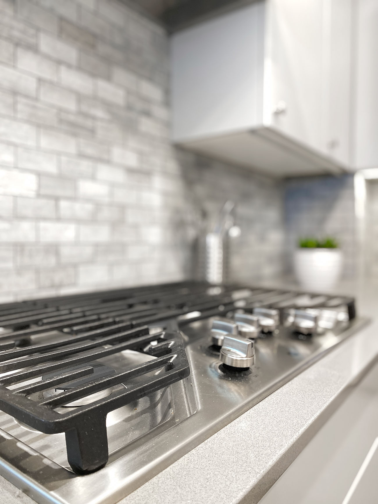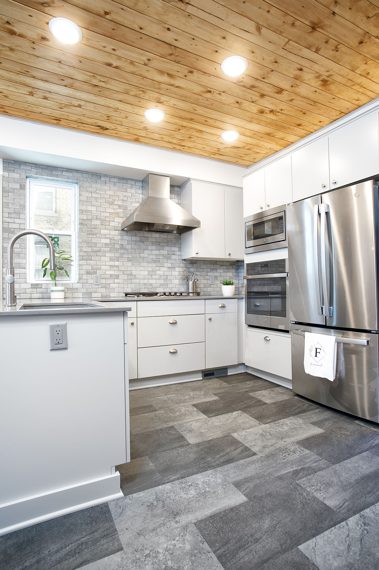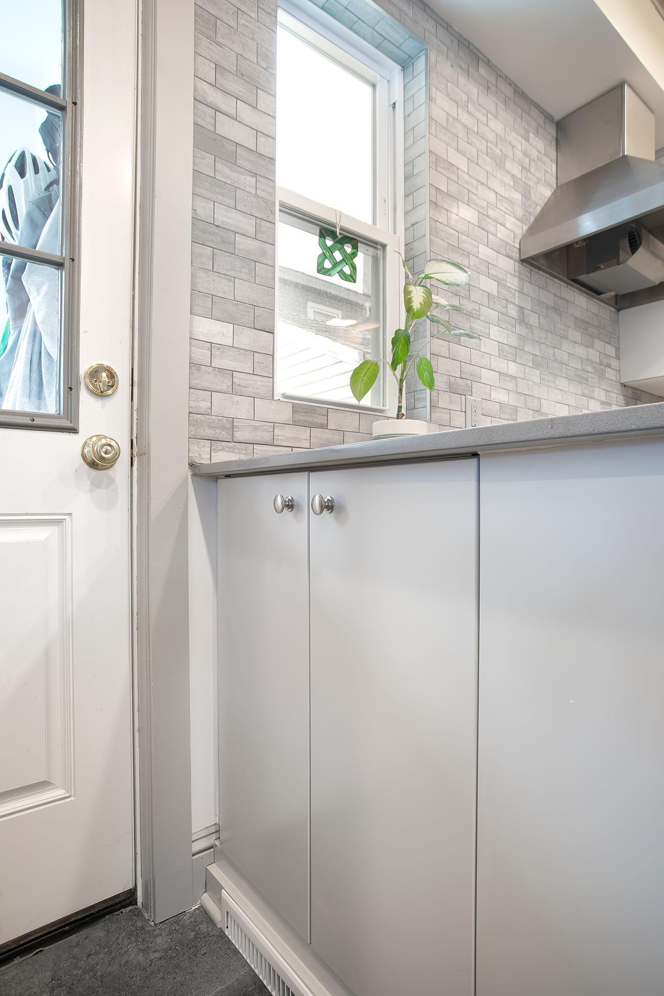 The new kitchen features sleek gray cabinets that compliment the brand new stainless steel appliances. To bring depth and dimension to the space, a textural natural stone backsplash and gray silestone countertops were selected. The homeowner did his own painting in the kitchen. For a pop of color, he included a green accent cove which matches the unique original trim that is continued throughout the rest of the home. Finally, the pantry found itself relocated to make way for a brand new staircase leading down to the basement.