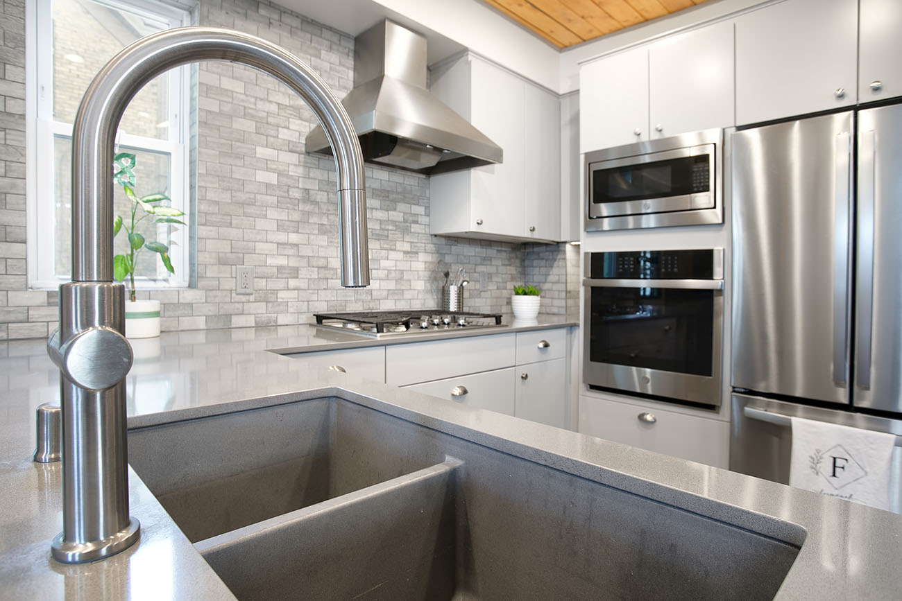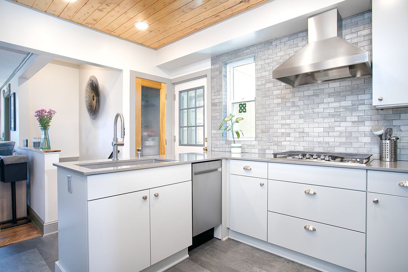 The homeowner of this 1900’s 1 and 3/4 story home in Northeast Minneapolis came to Castle with hopes of opening up the kitchen to become a more functional space to better suit his passion for cooking. The inspiration behind the design came from collected magazine clippings that helped to inspire the overall aesthetic of the space. A consistent theme behind the inspiration was minimalistic finishes and clean lines throughout the spaces. Designer Emily Blonigen was able to achieve the overall desired look with a neutral gray and white color palette, pops of modern mood and simplistic lines throughout.