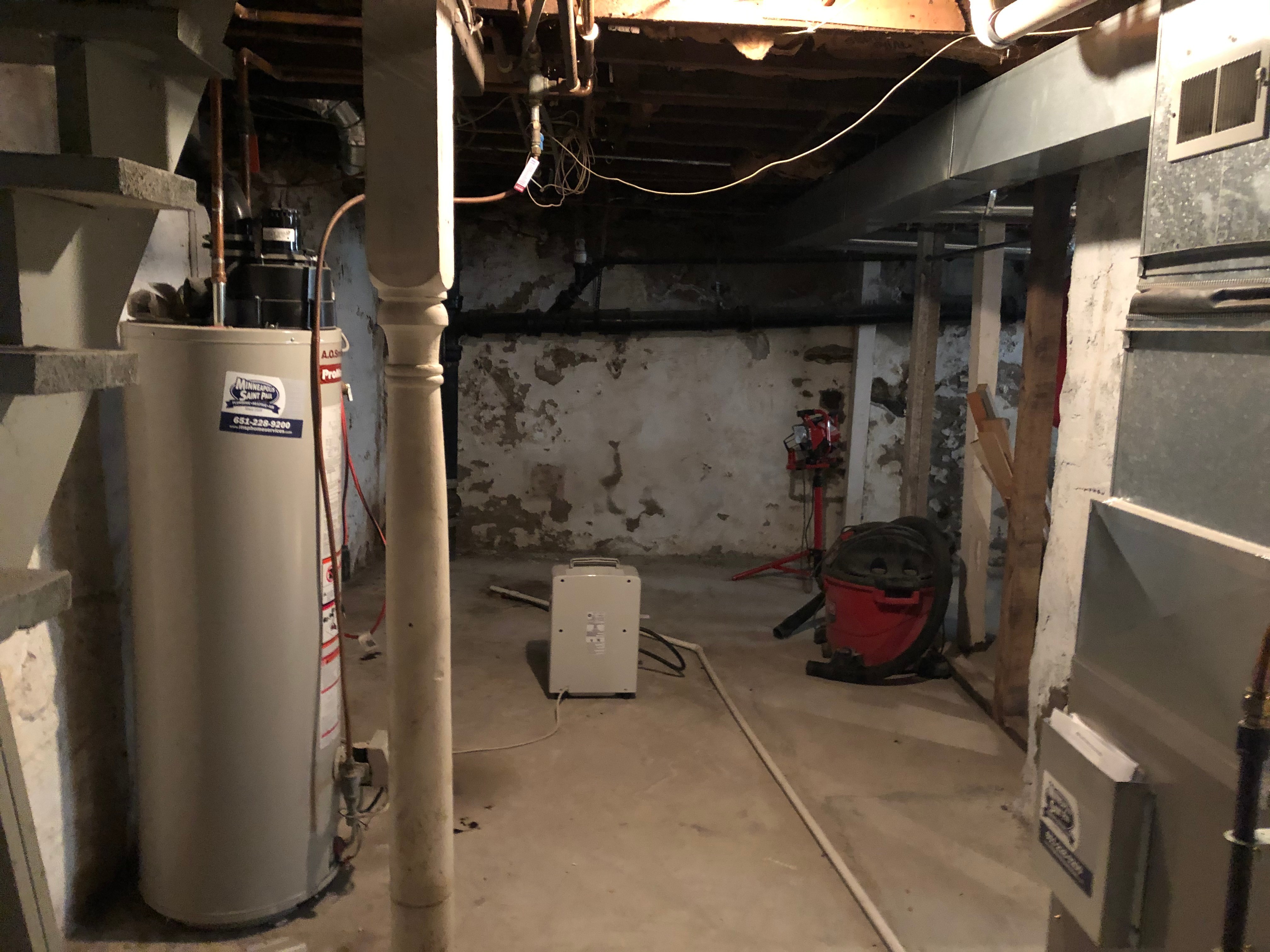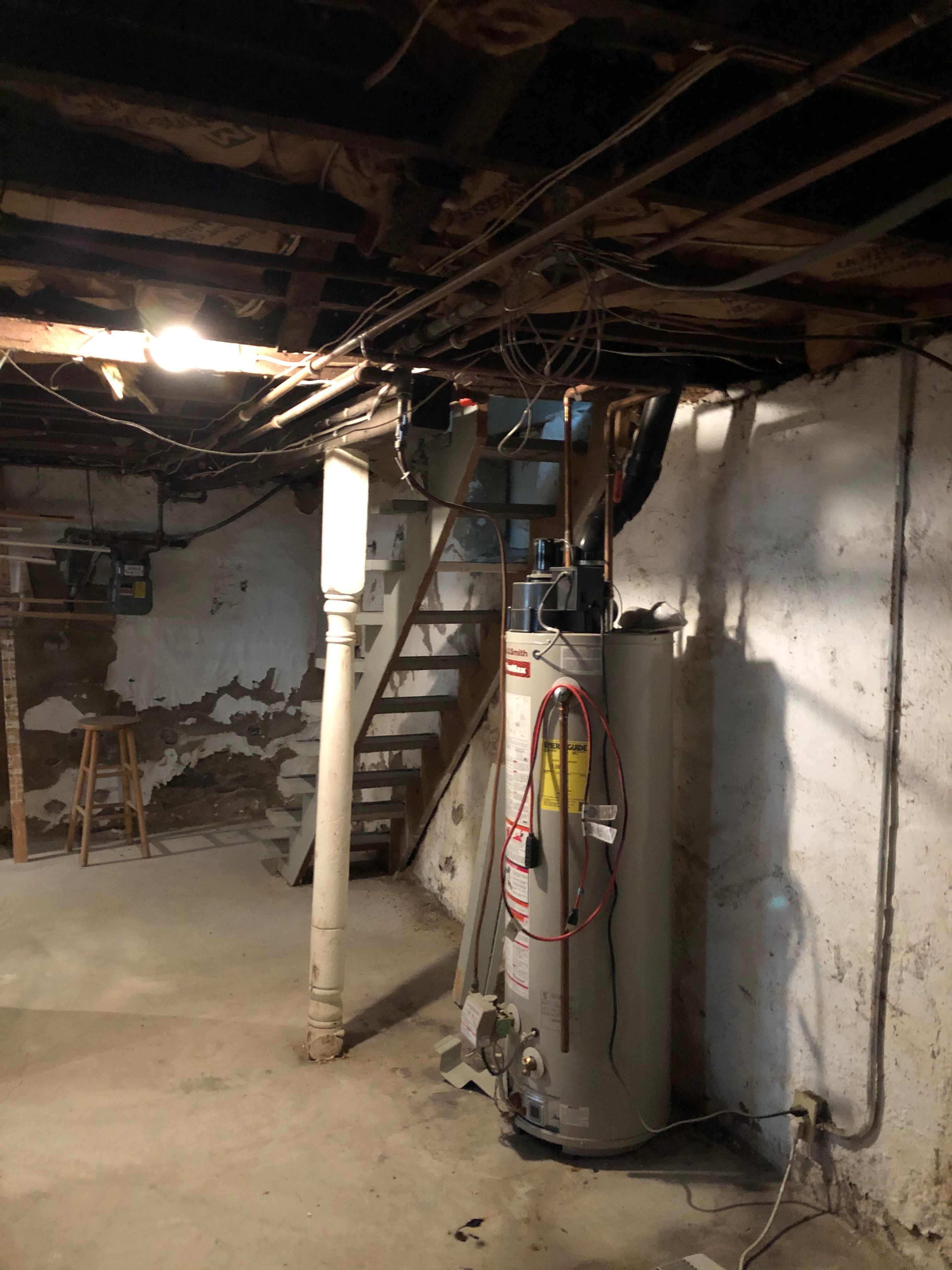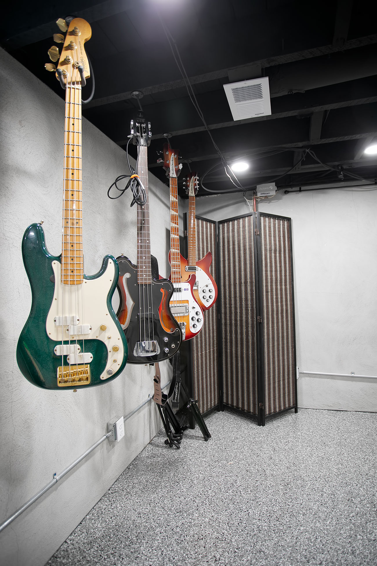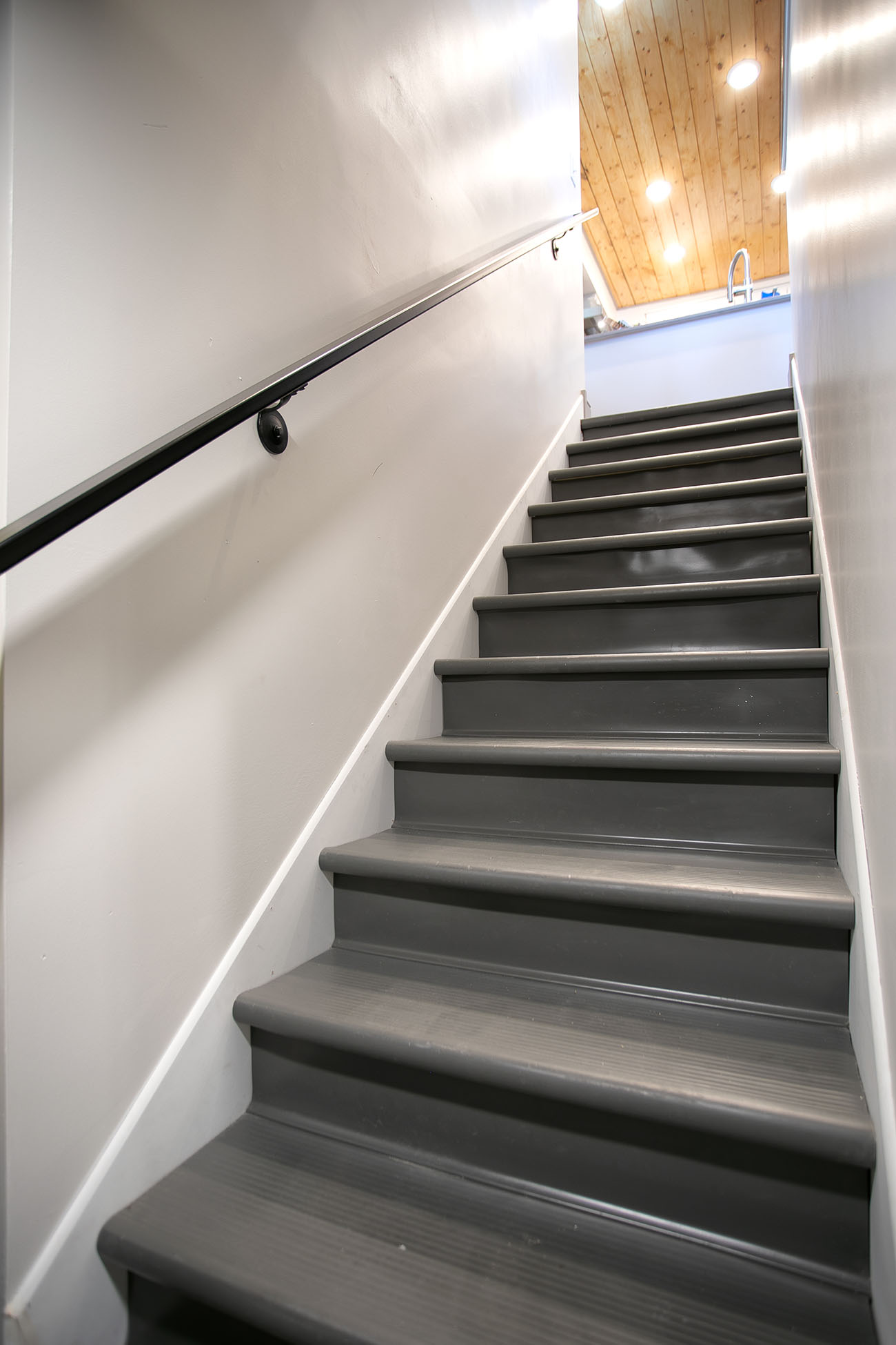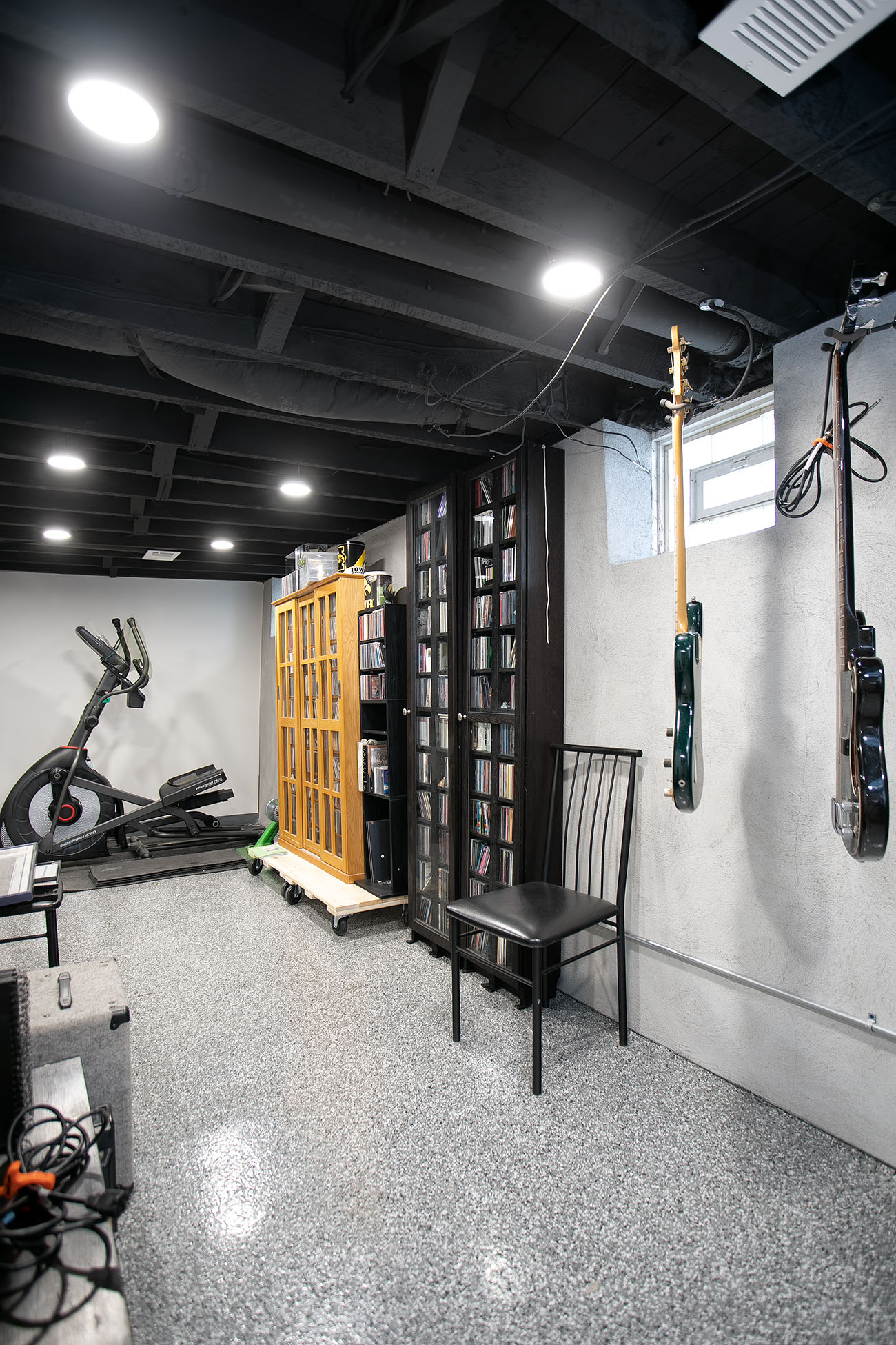 Finally, the pantry found itself relocated to make way for a brand new staircase leading down to the basement. The original stairwell was more like a ladder and really was not functional or safe. New walls were built around the utilities and applied stucco to existing limestone foundation walls. To clean up the basement for functional space, we chose to semi-finish the space. New walls were built around the utilities, a wall was framed around plumbing chase, stucco was applied to existing limestone foundation walls, and the exposed ceilings painted in a flat black. The new basement creates additional space for the homeowner to utilize for crafting, tools, and most importantly a space for his music. The space followed suit with the new kitchen; gray and white color palette displayed in a minimalistic aesthetic with clean lines. The homeowner completed the space with an epoxy garage floor finish coating on the floors. They are naturally growing into the additional finished space with guitar collection on display!