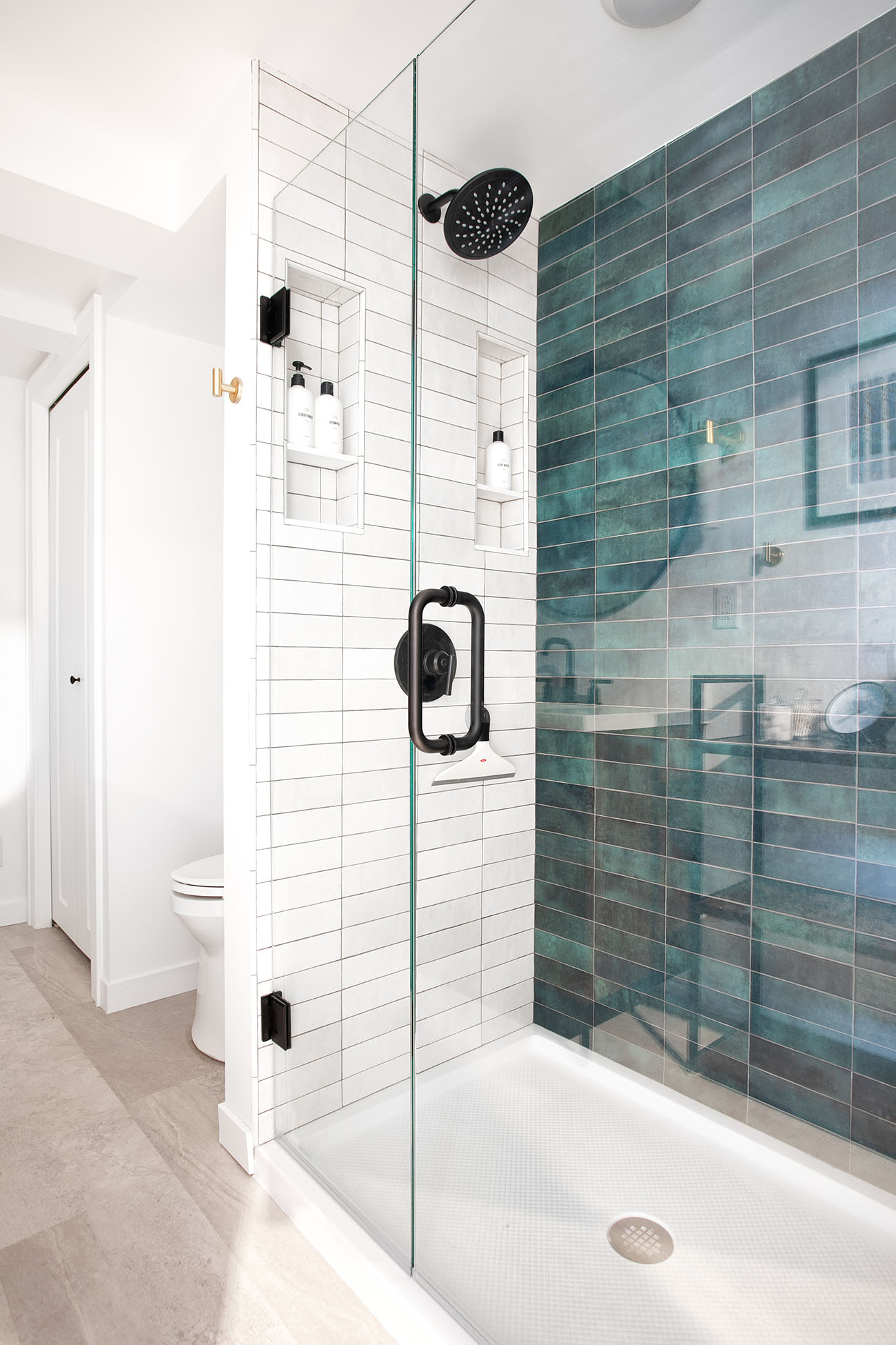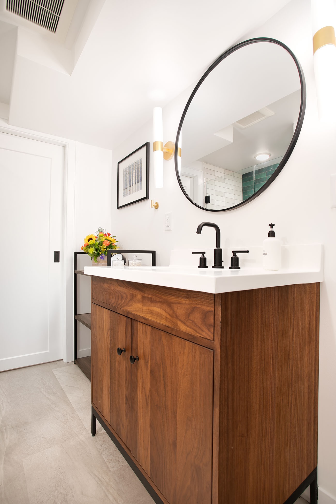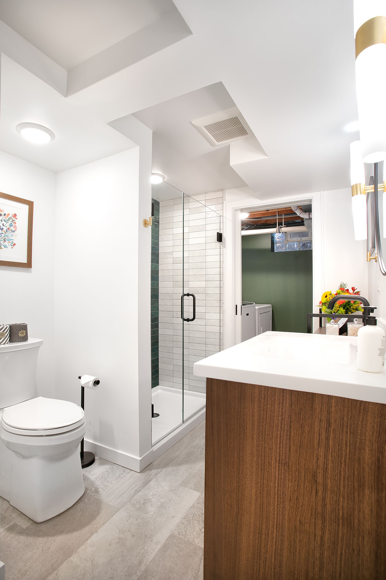 The basement added a ¾ bathroom to the house, and the laundry area was also finished. These spaces were also given a mid-century modern feel with the vanity, material choices and lighting. The shower features another great pop of color in the handmade green vertically stacked tiles at the back. These rooms also have a light an airy feel, even though they are in a basement.