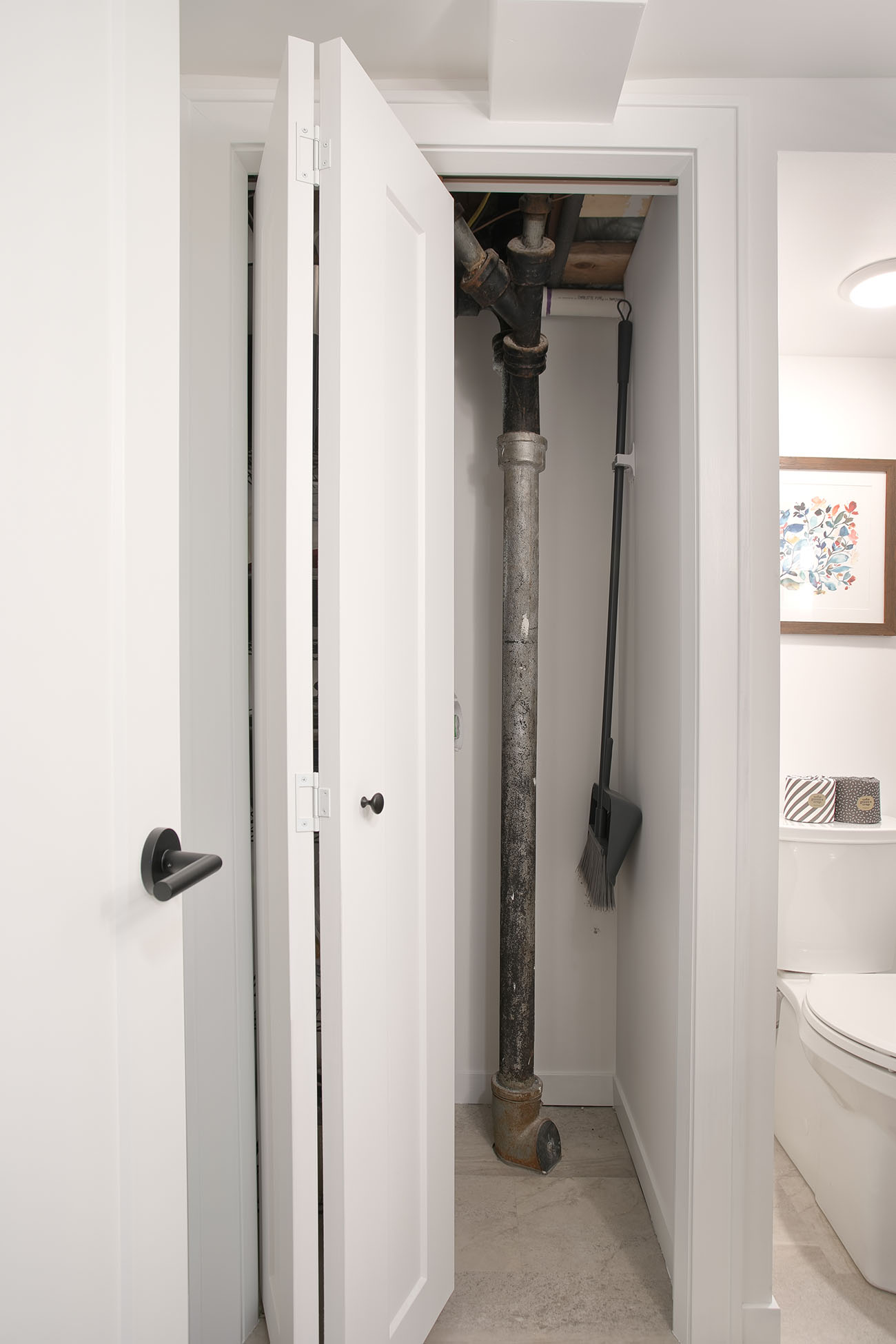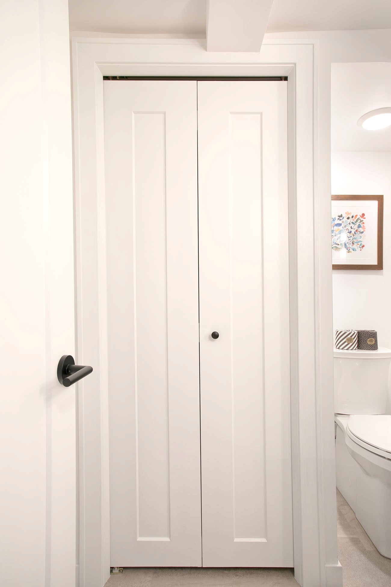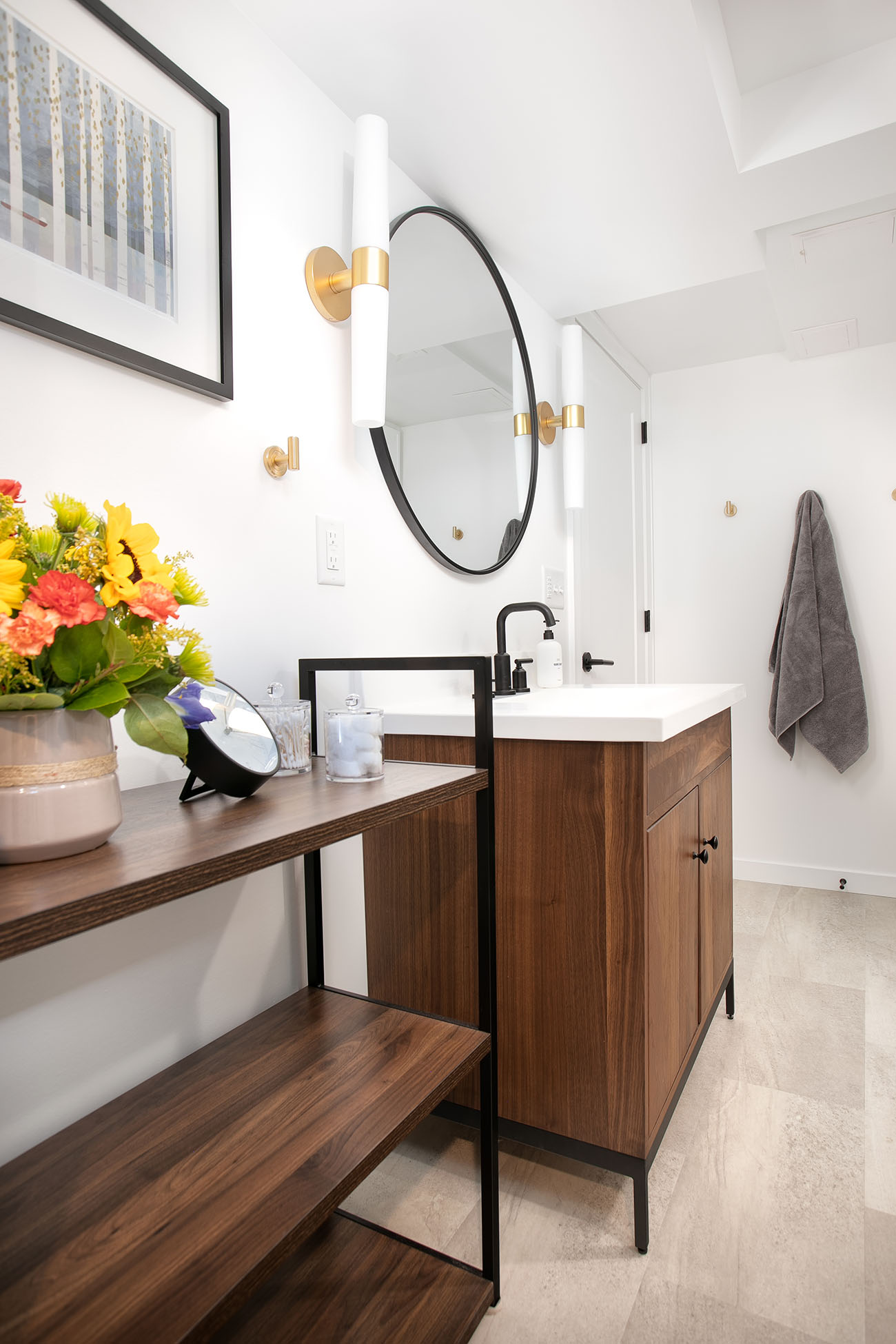 The basement added a ¾ bathroom to the house, and the laundry area was also finished. These spaces were also given a mid-century modern feel with the vanity, material choices and lighting. The shower features another great pop of color in the handmade green vertically stacked tiles at the back. These rooms also have a light an airy feel, even though they are in a basement.