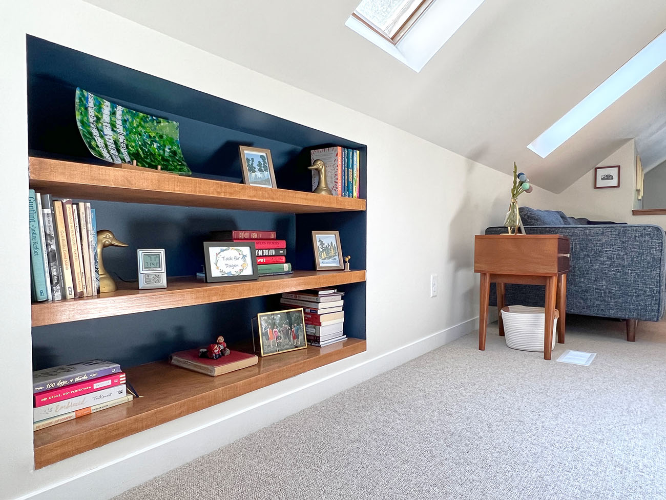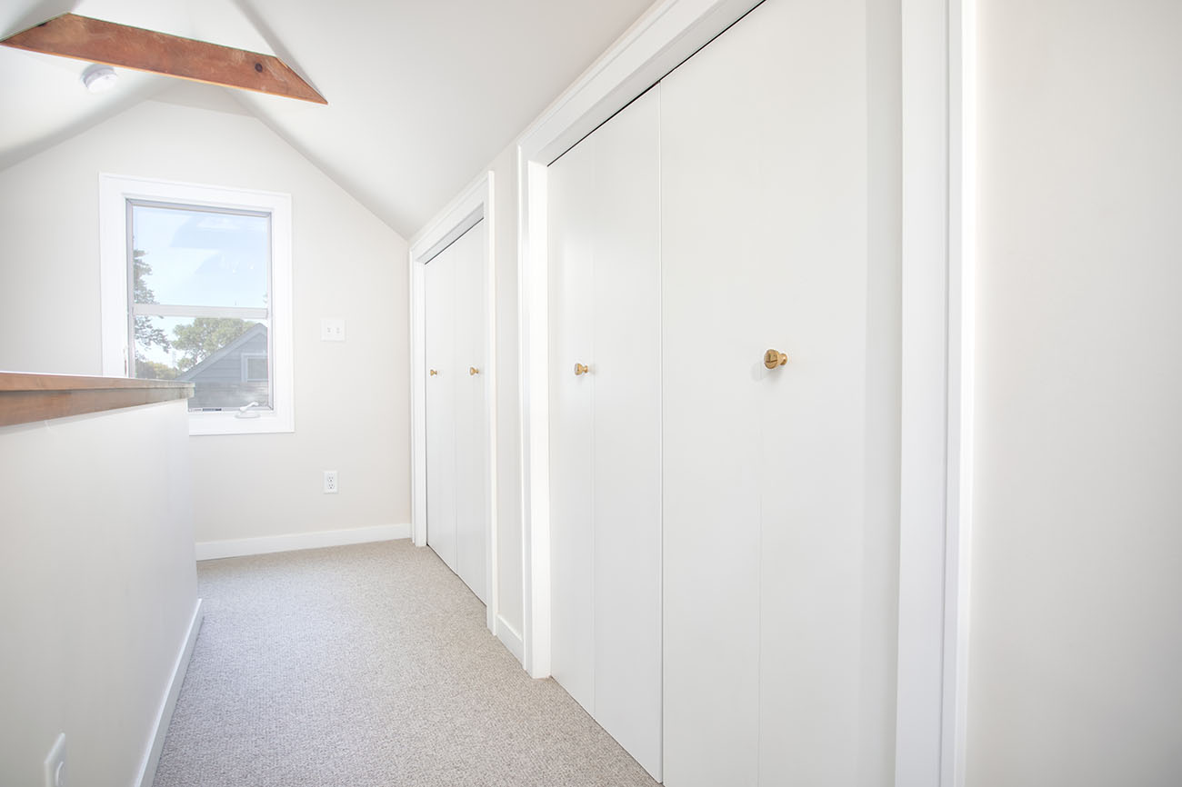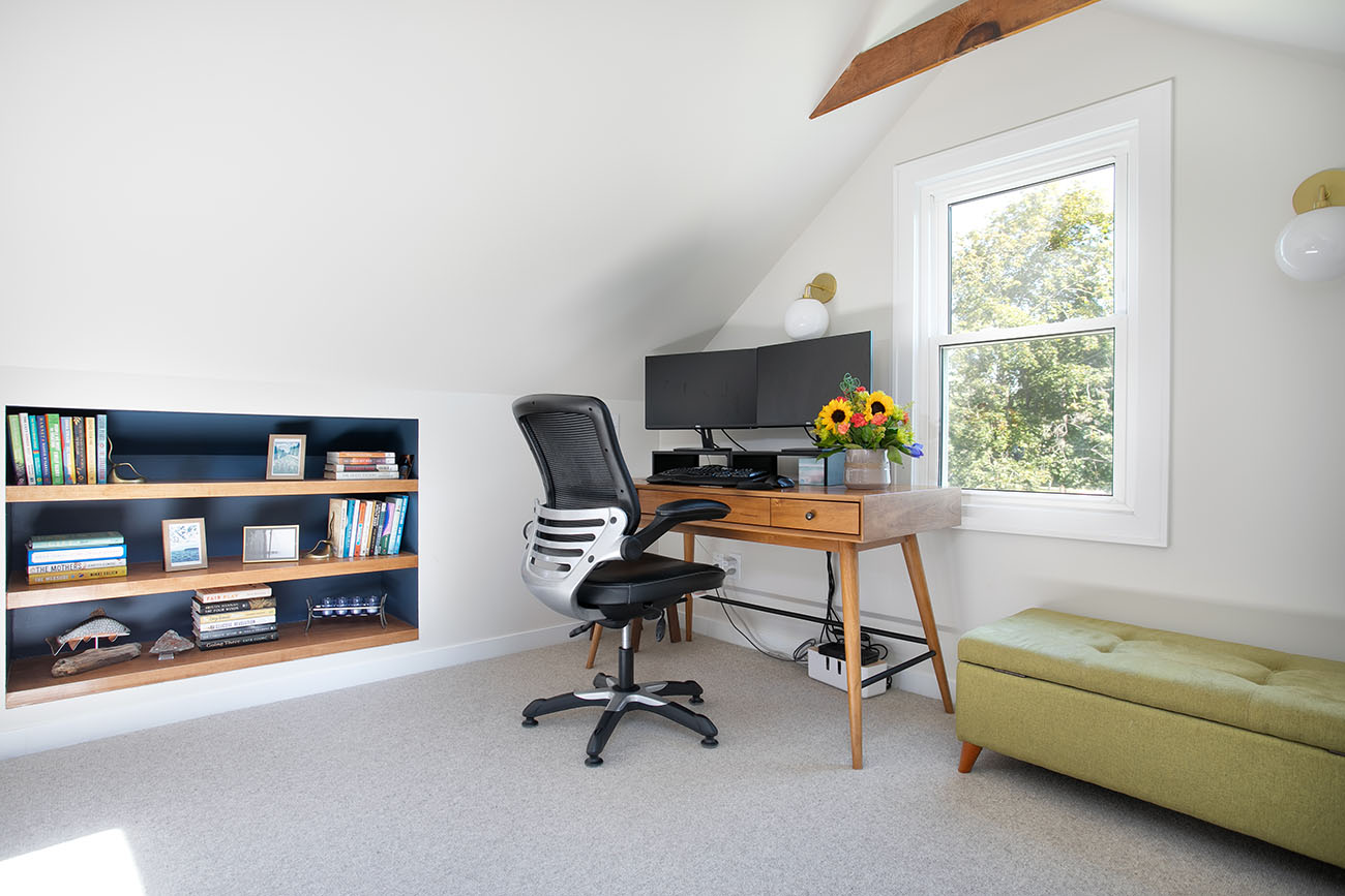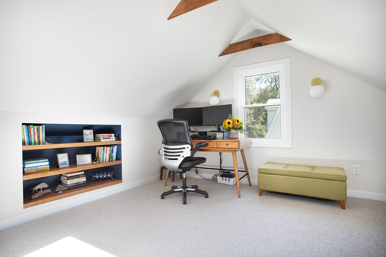 This project finished an story and a half attic space to give the homeowners a large office and additional family room / guest space area. Additional storage was also added with closets and ample access to knee wall storage for items like seasonal décor. The space is light, airy and modern. Pops of color were added in the custom bookshelves that compliment the furniture added by the homeowners. Lighting was selected to add character to the space and highlight the mid century modern style the homeowners liked. Wool carpet gives a soft and warm feeling to the space, and it’s short pile makes for low maintenance.