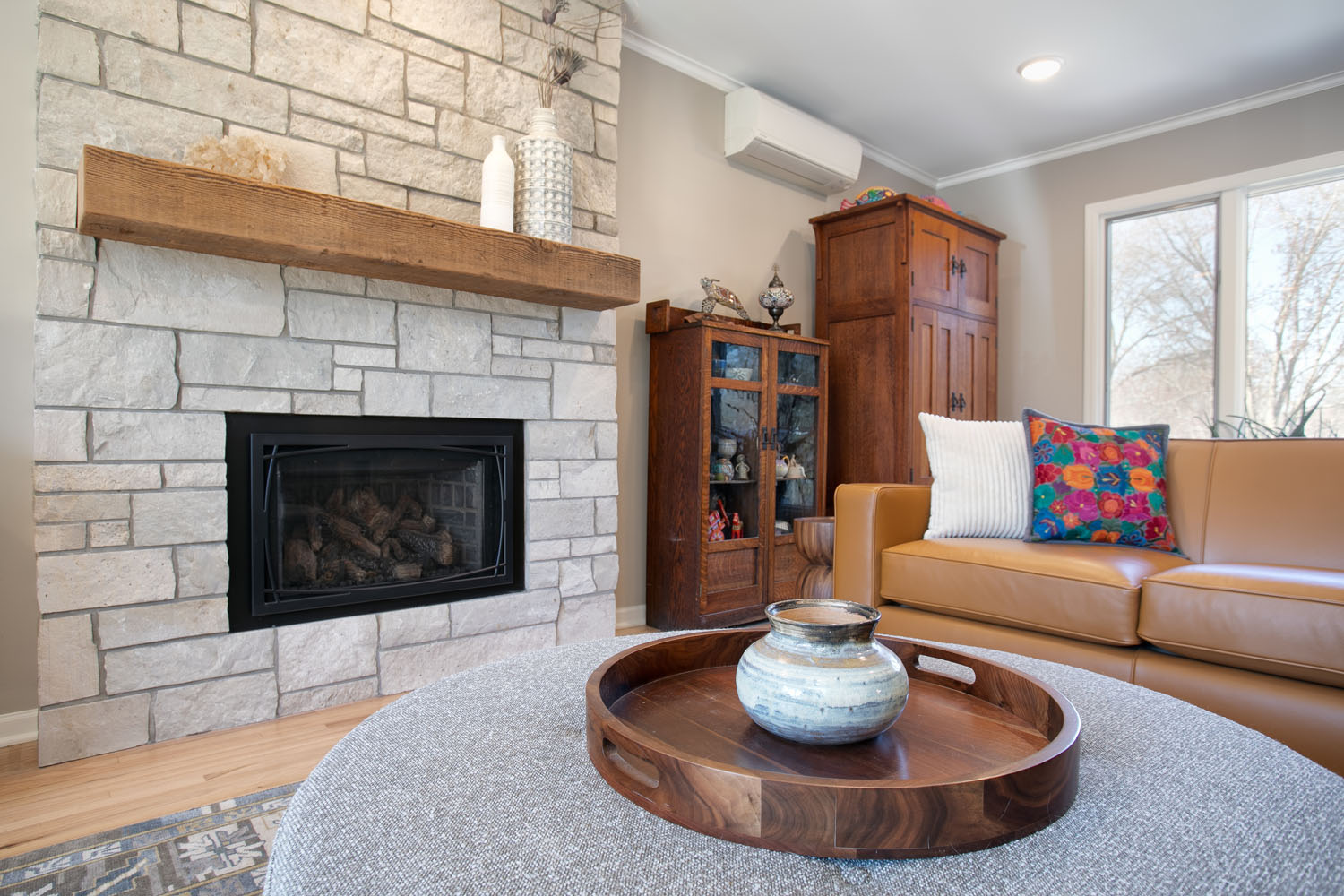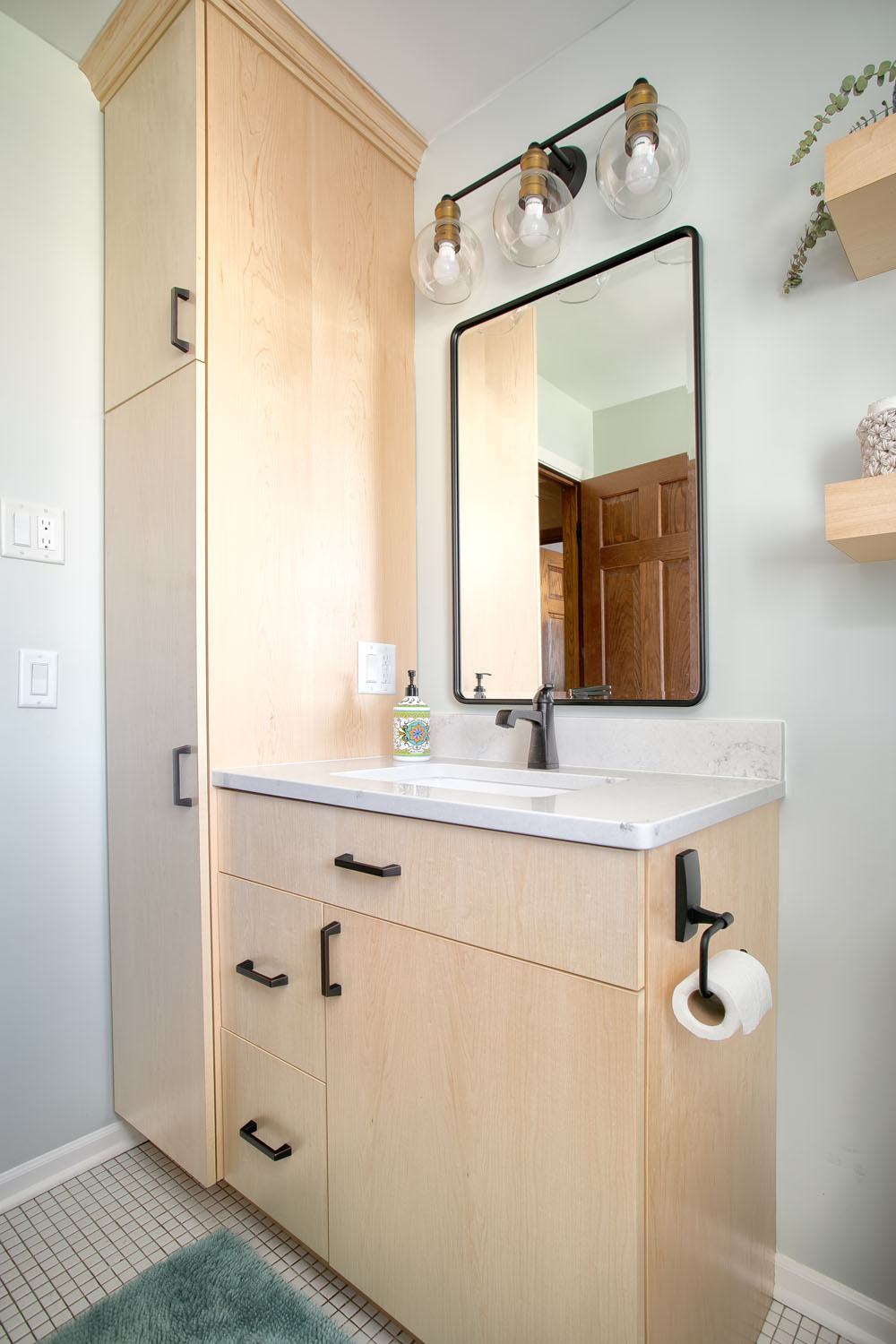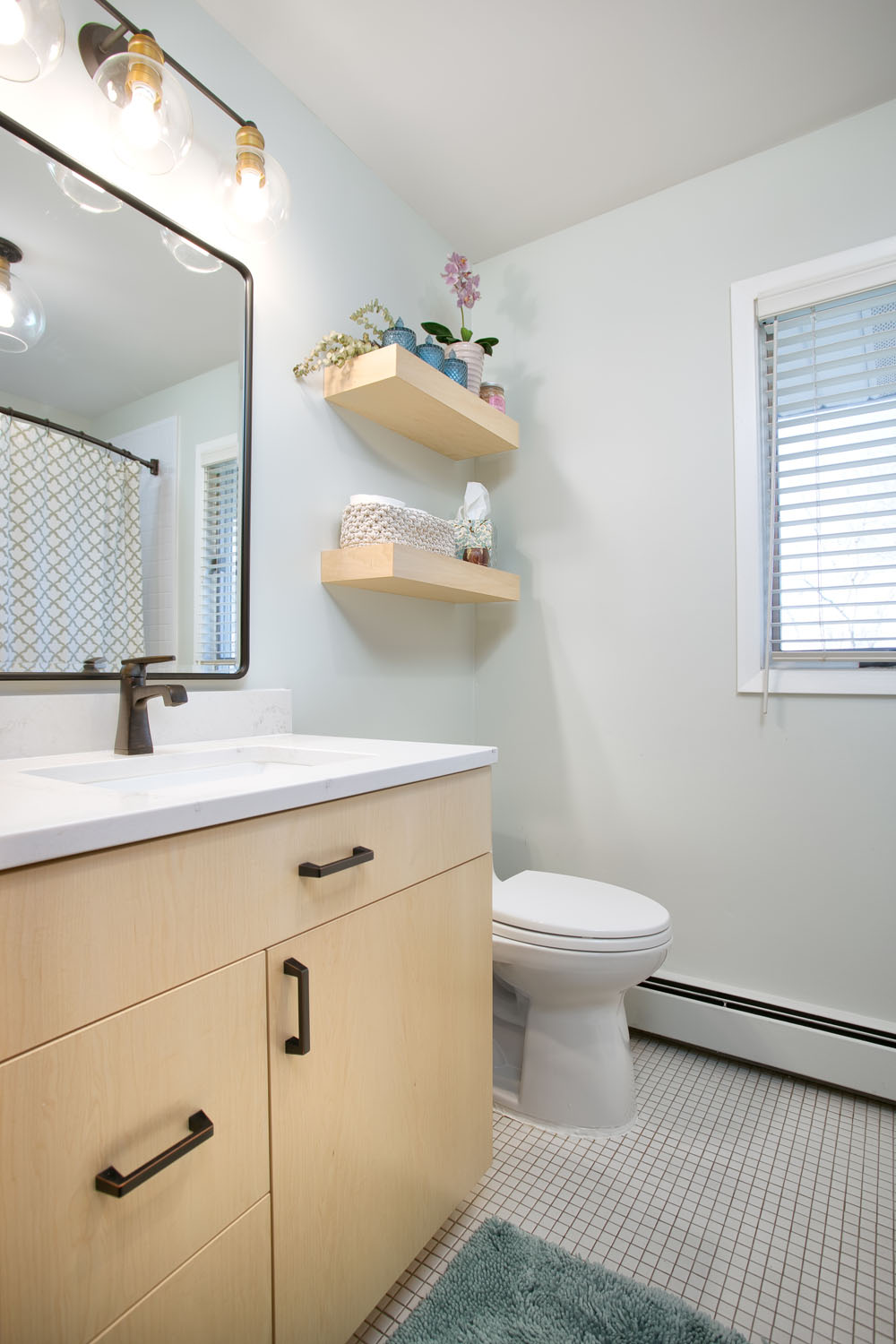 Our repeat clients embarked on an impressive kitchen remodeling journey with Castle in 2021, effectively transforming half of their main level into a more spacious and brighter kitchen, along with a practical mudroom and a welcoming dining room. They expressed a desire to have the remaining part of their main level emulate the brightness and contemporary style of their newly renovated kitchen. To achieve this, we turned an outdated wood-burning firebox in their living room into a modern gas fireplace, featuring a custom stone surround and a reclaimed wood mantel. This not only added a touch of elegance but also complemented the overall aesthetic. We further unified the design by adding matching crown molding, installing efficient LED can lighting, and painting the millwork to mirror the kitchen’s color scheme. The result was a main floor that emanates a sense of harmony and freshness, giving the impression that it was all renovated simultaneously. During this process, we also refreshed their second-floor bathroom. We installed a new vanity, mirrors, shelves, and a toilet, reinforcing the idea that even a minimal makeover can significantly enhance both functionality and aesthetics.