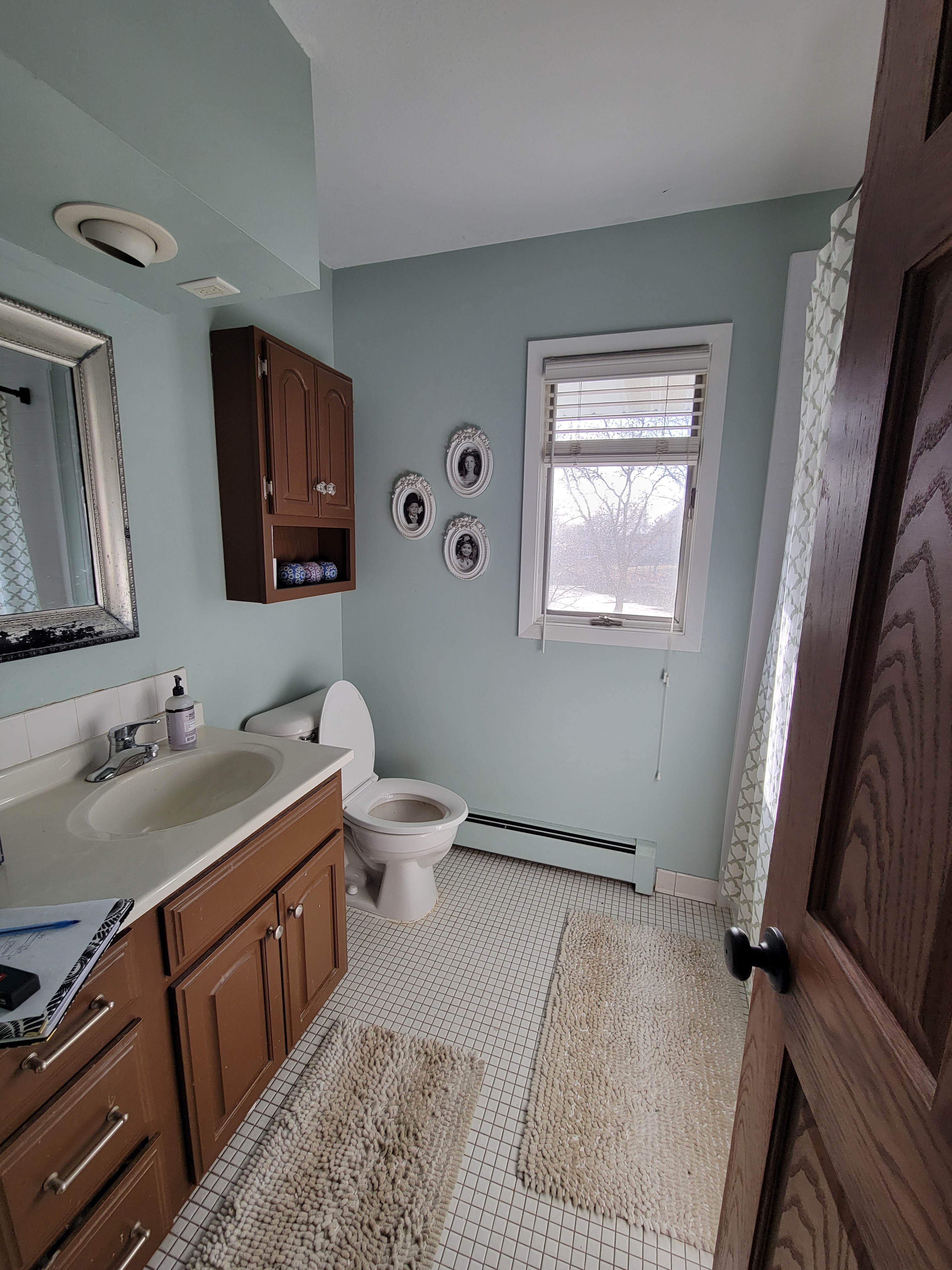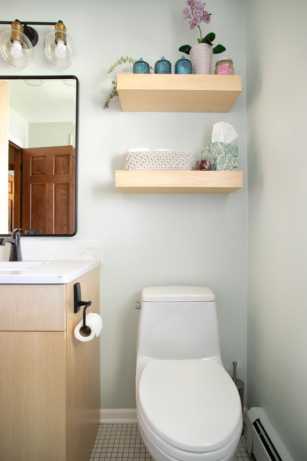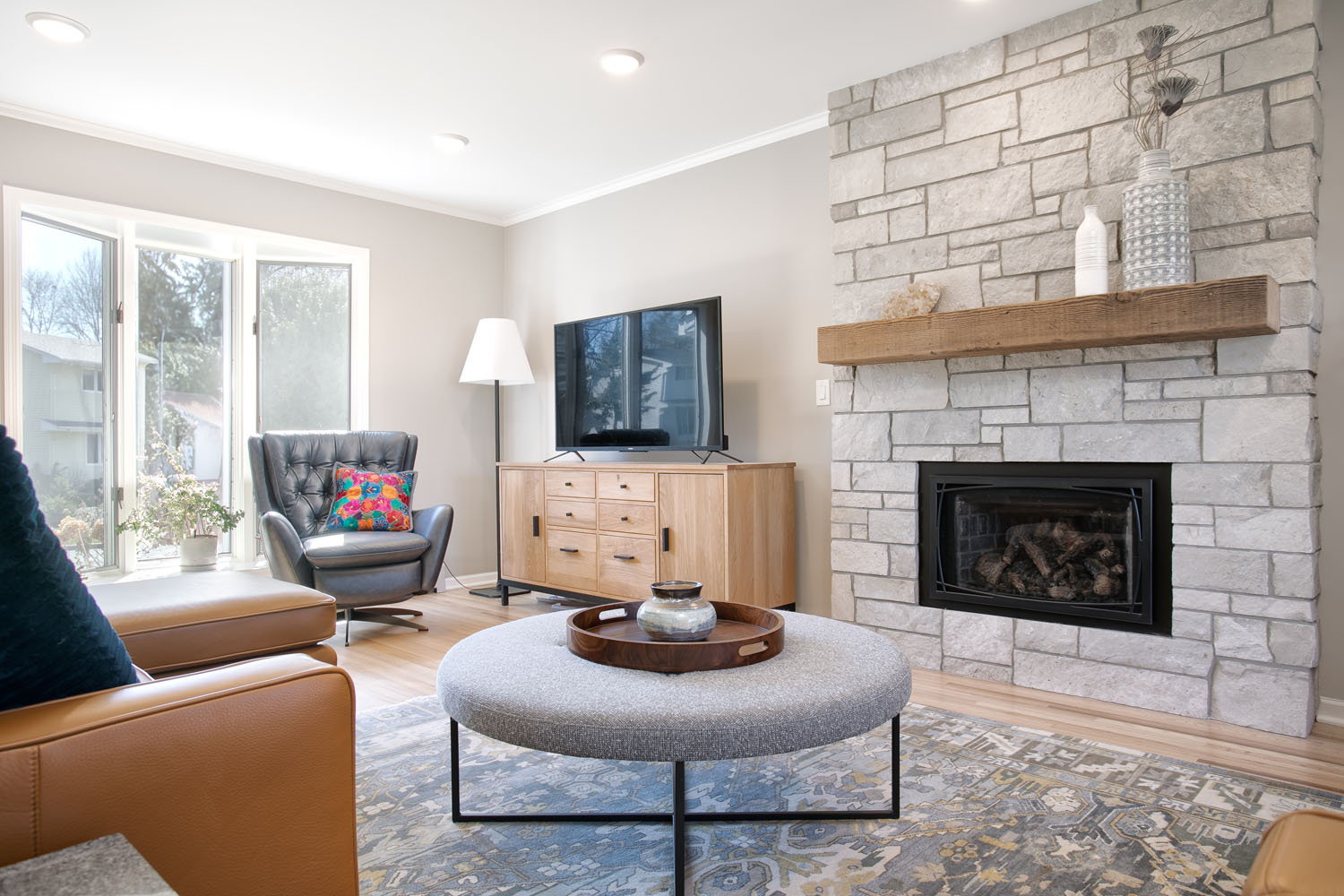 Our repeat clients embarked on an impressive kitchen remodeling journey with Castle in 2021, effectively transforming half of their main level into a more spacious and brighter kitchen, along with a practical mudroom and a welcoming dining room. They expressed a desire to have the remaining part of their main level emulate the brightness and contemporary style of their newly renovated kitchen. To achieve this, we turned an outdated wood-burning firebox in their living room into a modern gas fireplace, featuring a custom stone surround and a reclaimed wood mantel. This not only added a touch of elegance but also complemented the overall aesthetic. We further unified the design by adding matching crown molding, installing efficient LED can lighting, and painting the millwork to mirror the kitchen’s color scheme. The result was a main floor that emanates a sense of harmony and freshness, giving the impression that it was all renovated simultaneously. During this process, we also refreshed their second-floor bathroom. We installed a new vanity, mirrors, shelves, and a toilet, reinforcing the idea that even a minimal makeover can significantly enhance both functionality and aesthetics.