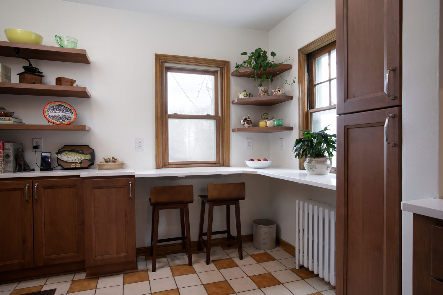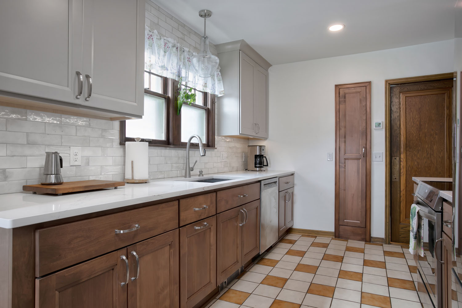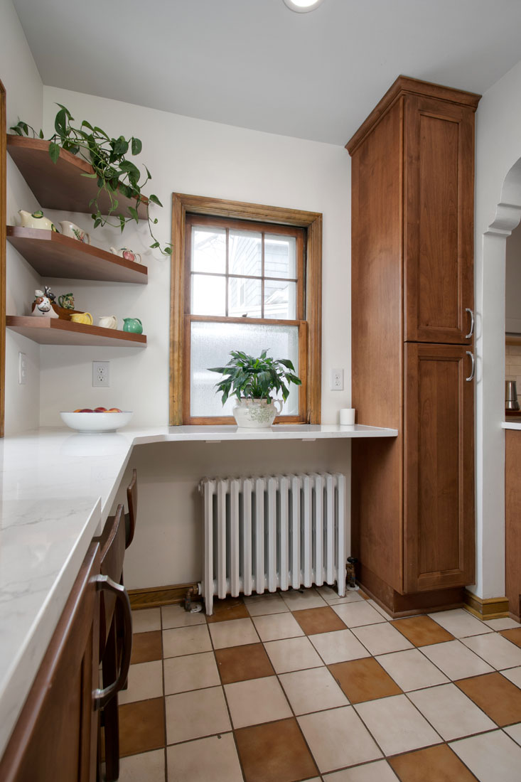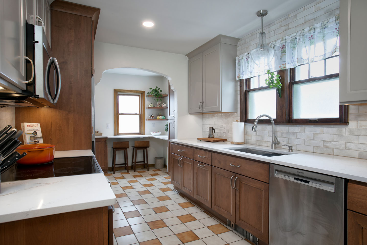 This NE Minneapolis Kitchen and Breakfast Nook remodel added new cabinets and countertops replacing the original cabinets with modern high-functioning Shaker style cabinetry. The cabinetry features a mix of stained wood and painted upper cabinets. The tile floor was saved. Engineered quartz countertops were installed with an undermount sink. Open shelves were incorporated to showcase collectible art.