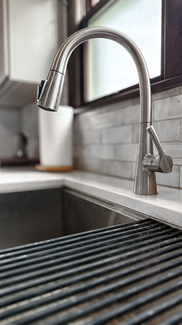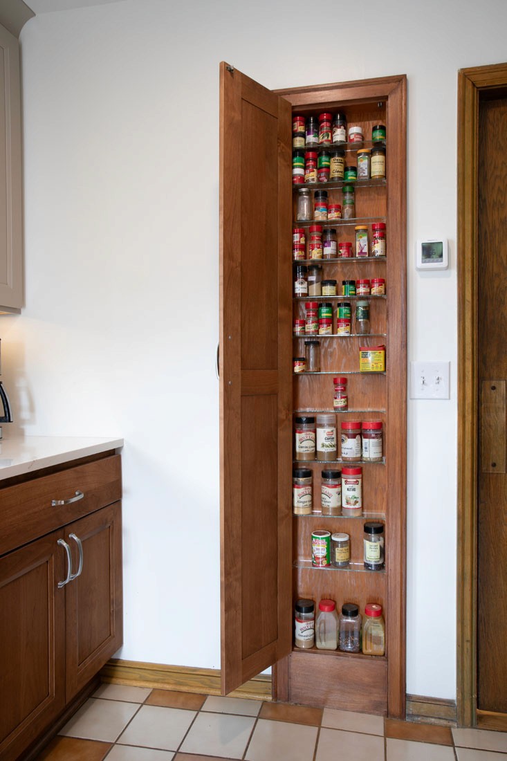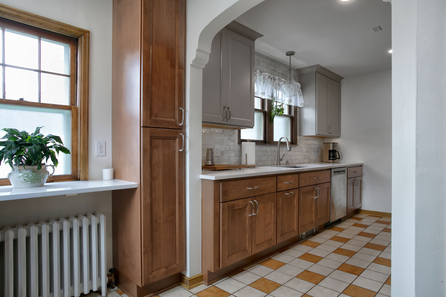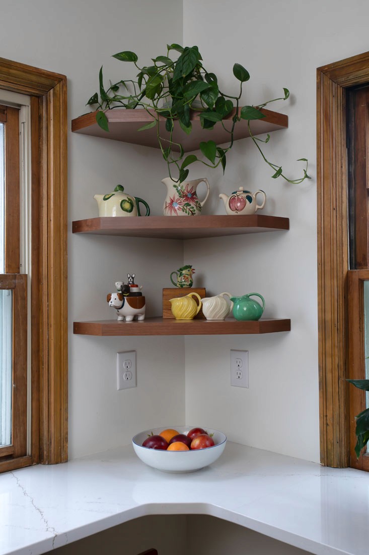 This NE Minneapolis Kitchen and Breakfast Nook remodel added new cabinets and countertops replacing the original cabinets with modern high-functioning Shaker style cabinetry. The cabinetry features a mix of stained wood and painted upper cabinets. The tile floor was saved. Engineered quartz countertops were installed with an undermount sink. Open shelves were incorporated to showcase collectible art.