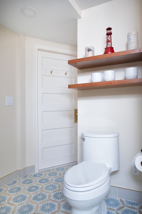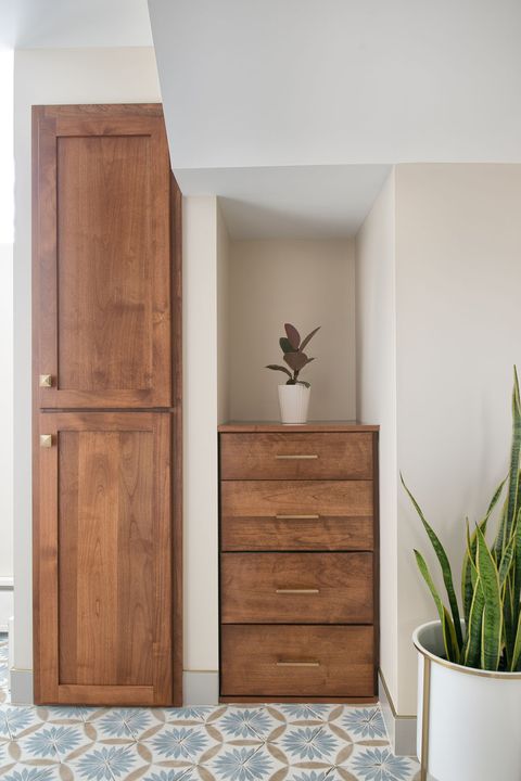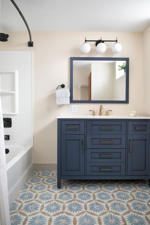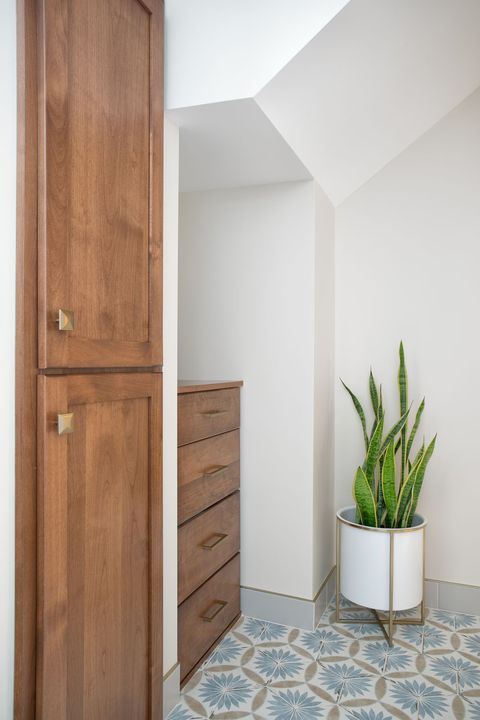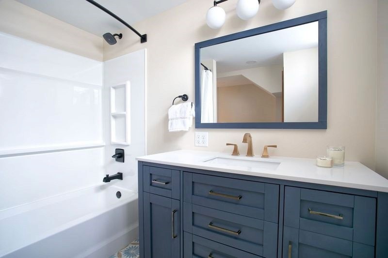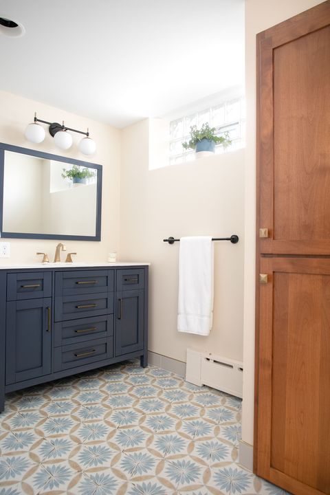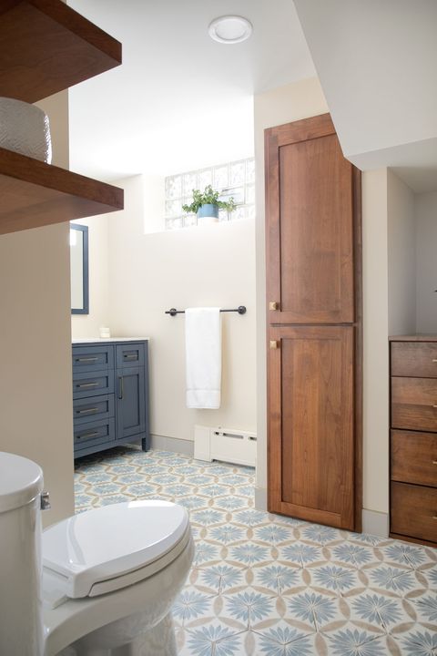 Anna & Michael had a vision to transform their compact basement bathroom into a more functional space for their growing teenagers. To achieve this, we utilized the dormant area adjacent to the existing bathroom, thus, effectively expanding the space to accommodate a full-sized tub and shower. Our design approach was to maintain harmony with the overall aesthetic of the house, but simultaneously introduce modern updates. These updates featured light, bright elements, vibrant color accents, and seamlessly integrated storage solutions. As with any basement remodeling project, there are certain constraints, such as immovable mechanical or plumbing fixtures. In this particular situation, we strategically designed a linen cabinet to conceal unsightly piping, thus turning a challenge into a stylish solution.