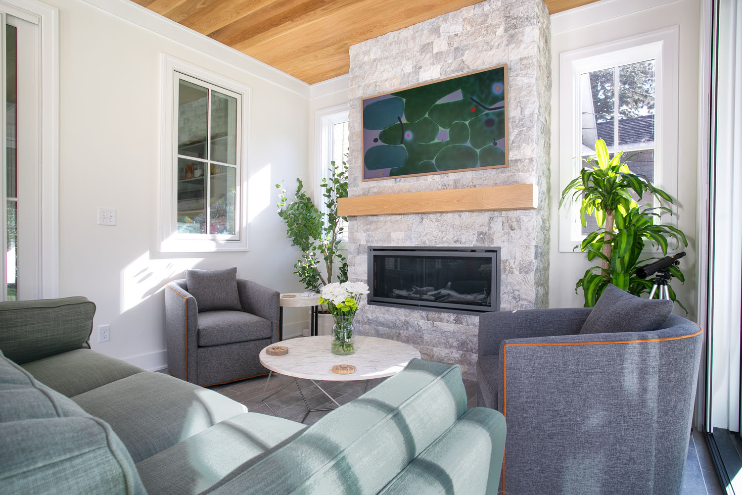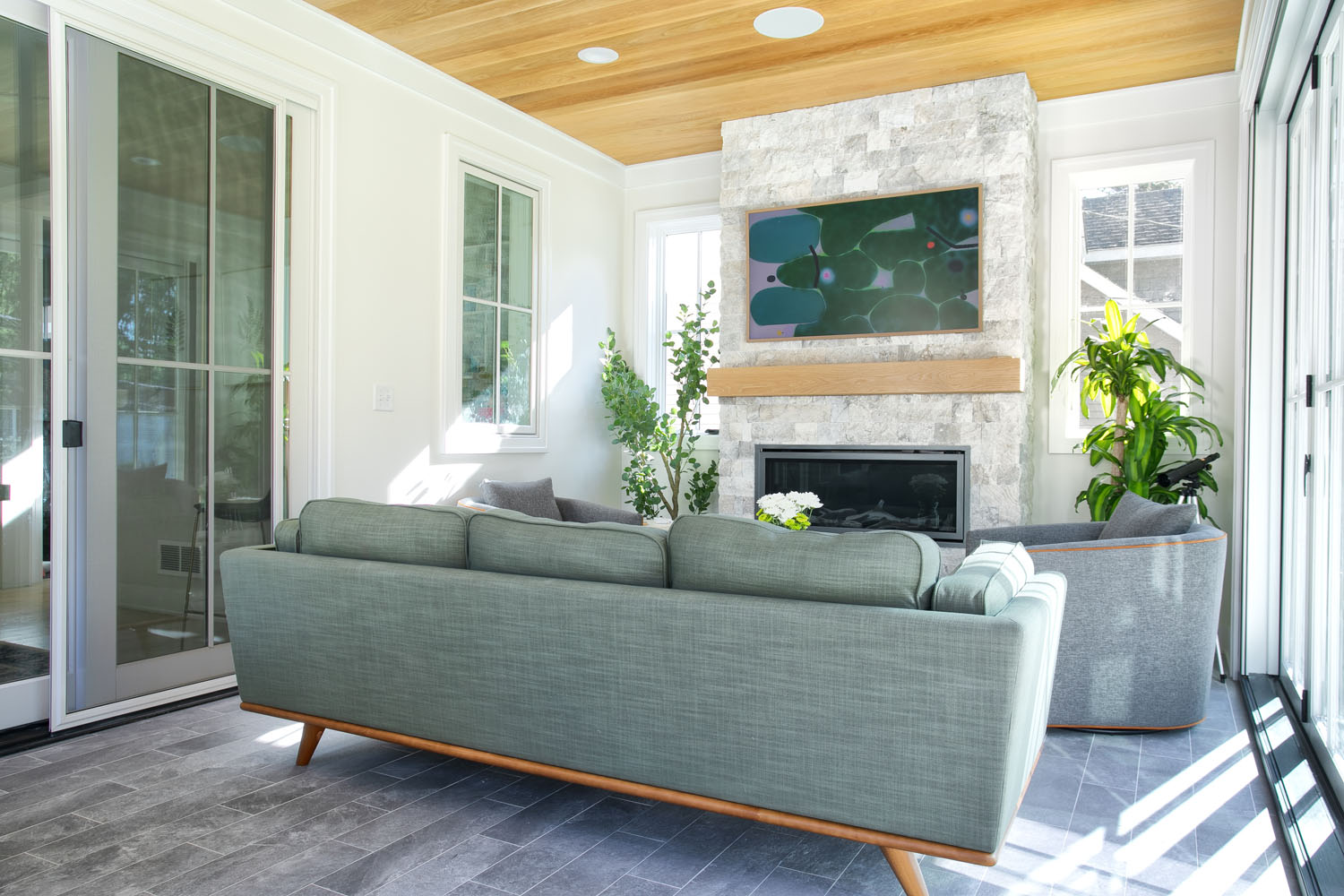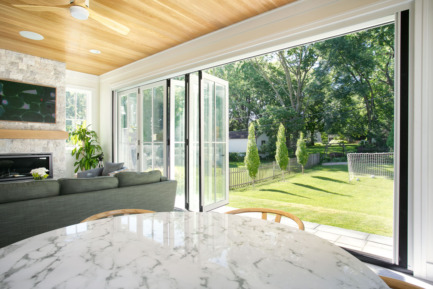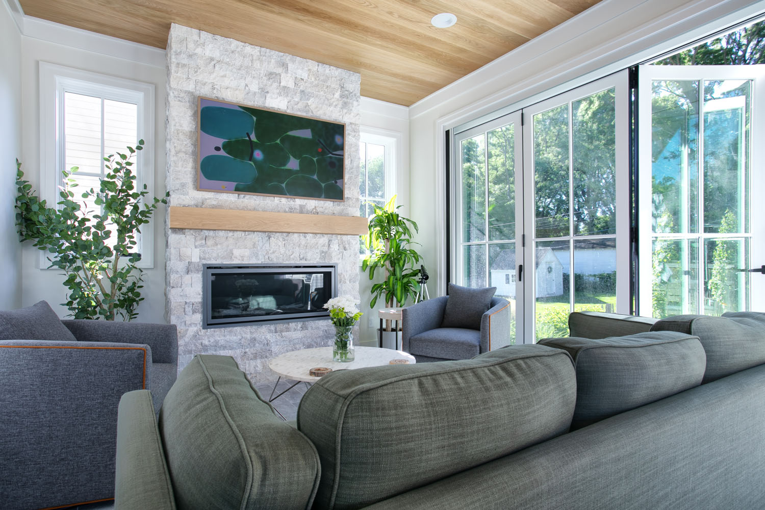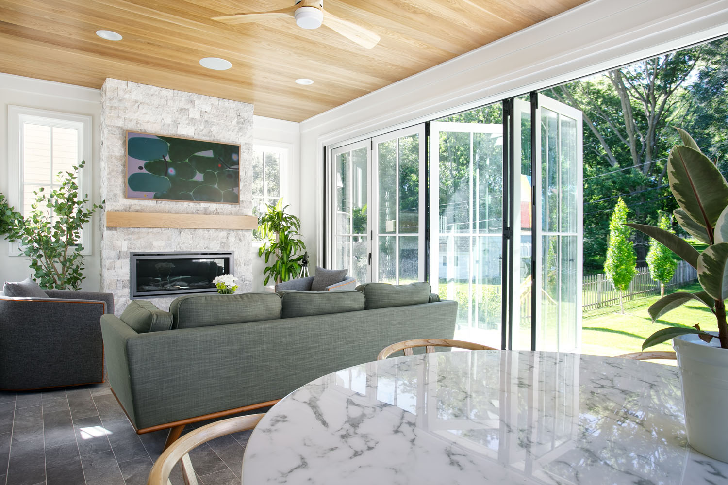 Client wanted a multi-purpose room where they could entertain or relax and have proximity to kids playing outdoors and also enjoy the view of their back yard. By making use of a 6 ft. Marvin Bifold door, we were able to achieve that. The door can be completely open when the weather permits and closed when needed. For ideal conditions any time we installed a Mitsubi mini split system. Tile floor, tongue and groove wood ceiling, and Travertine tile on the fireplace make for a homey Rustic, but modern design.