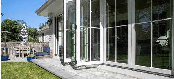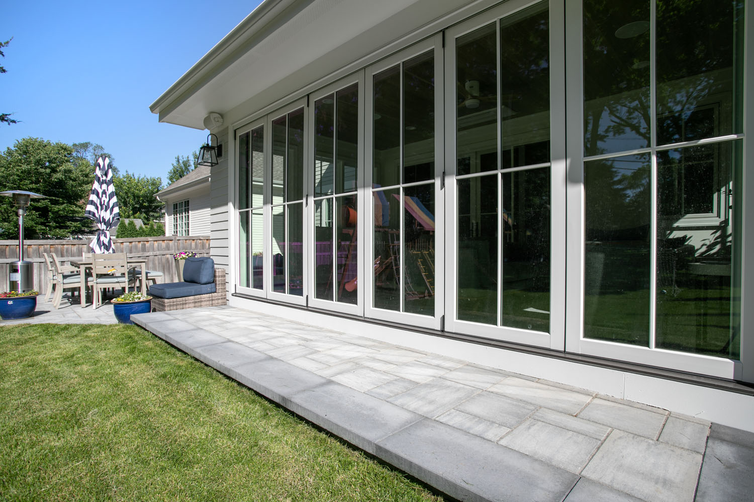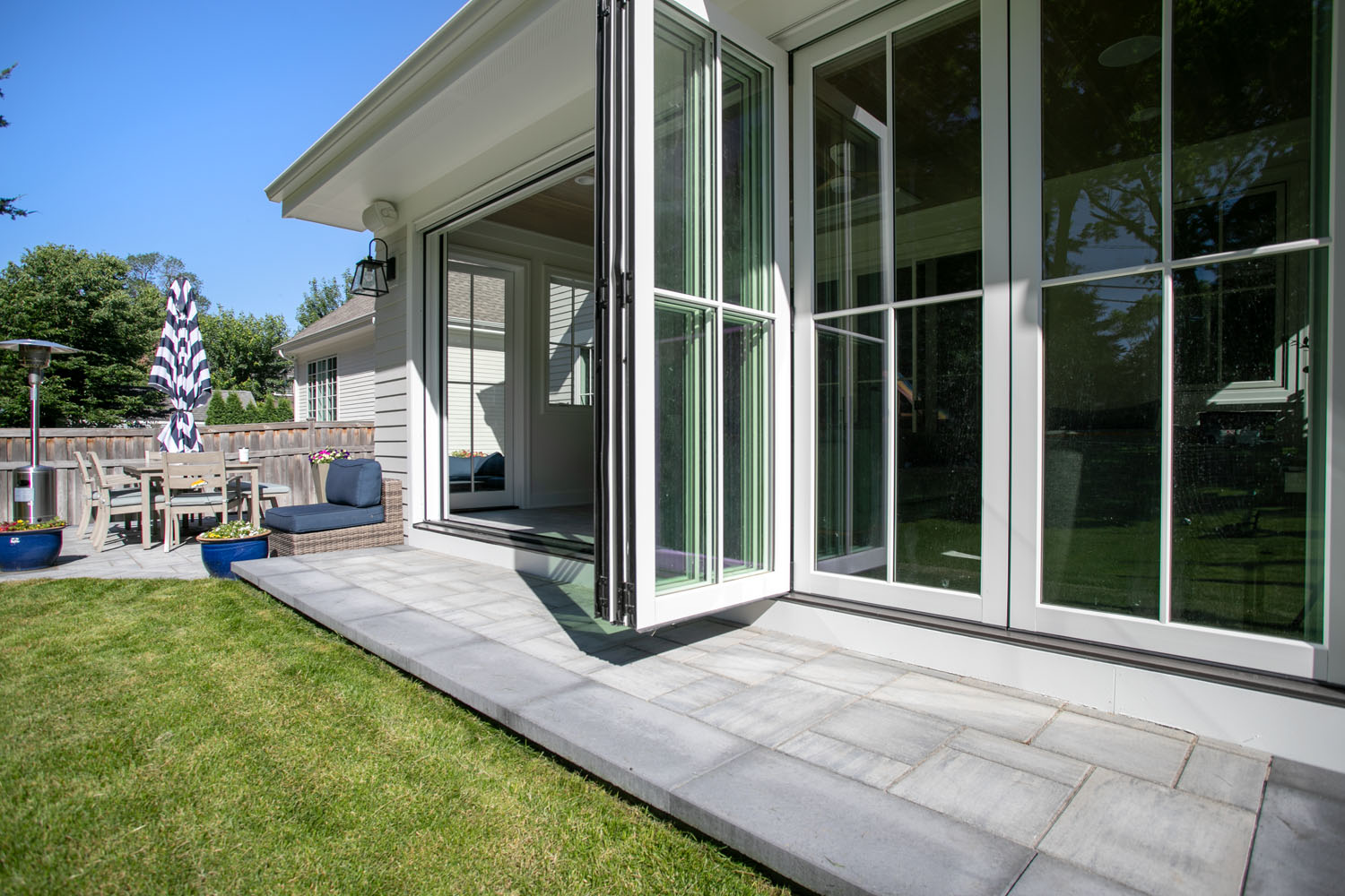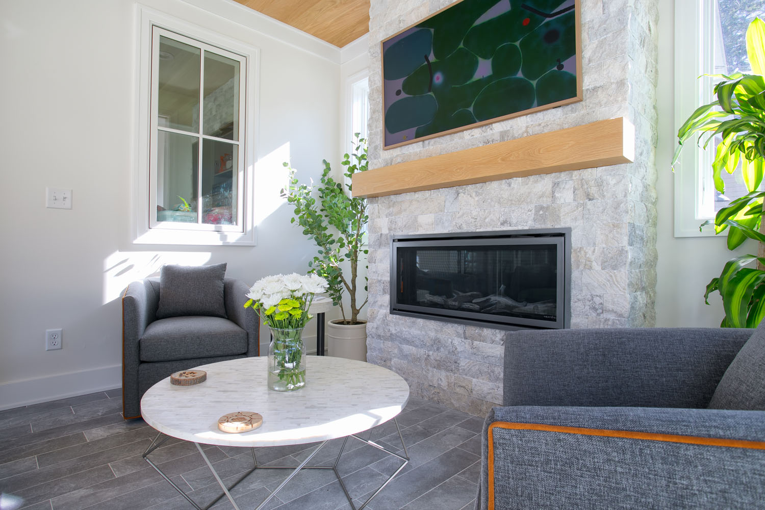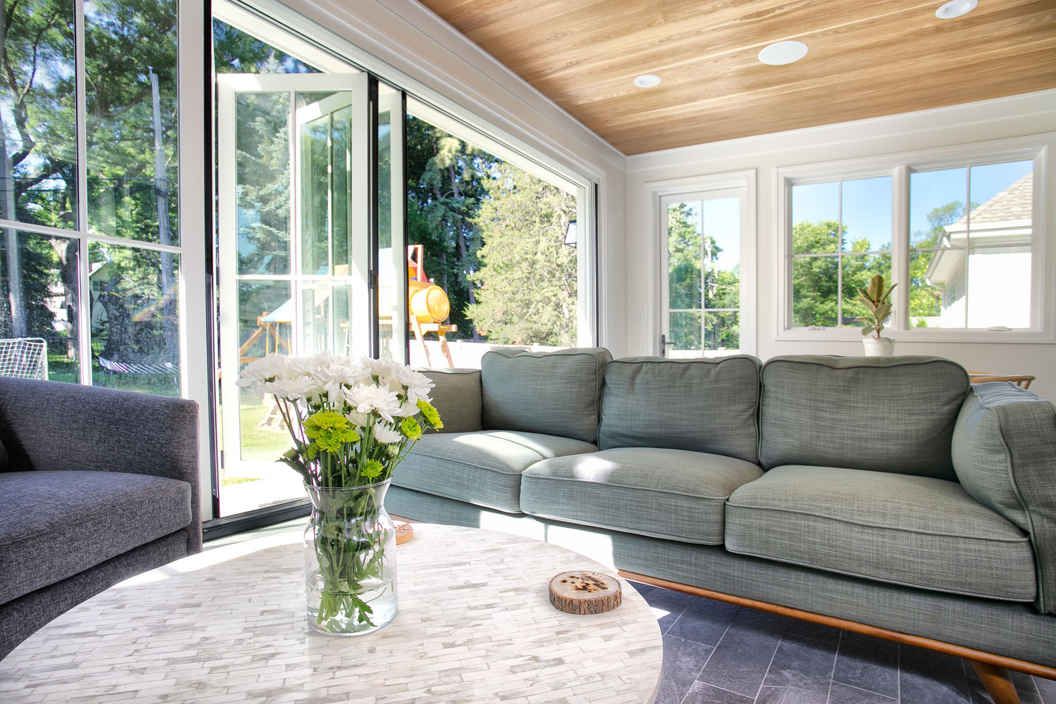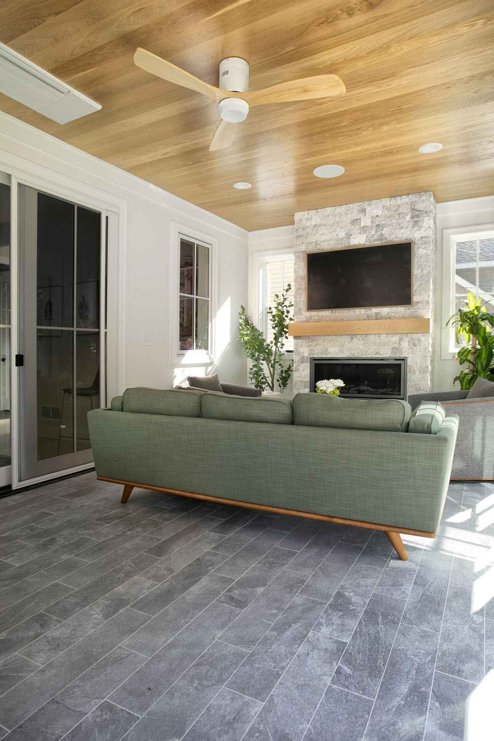 Client wanted a multi-purpose room where they could entertain or relax and have proximity to kids playing outdoors and also enjoy the view of their back yard. By making use of a 6 ft. Marvin Bifold door, we were able to achieve that. The door can be completely open when the weather permits and closed when needed. For ideal conditions any time we installed a Mitsubi mini split system. Tile floor, tongue and groove wood ceiling, and Travertine tile on the fireplace make for a homey Rustic, but modern design.