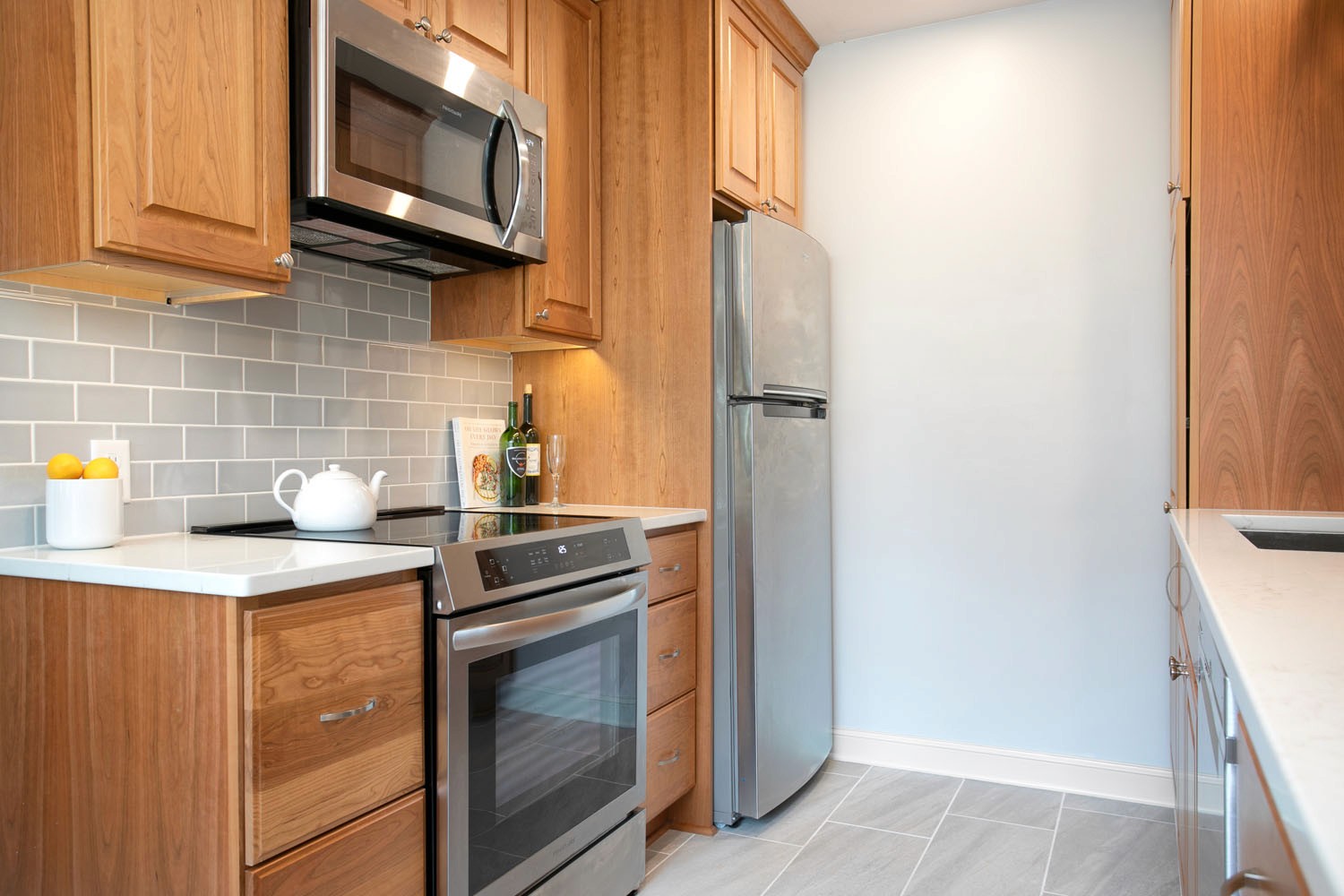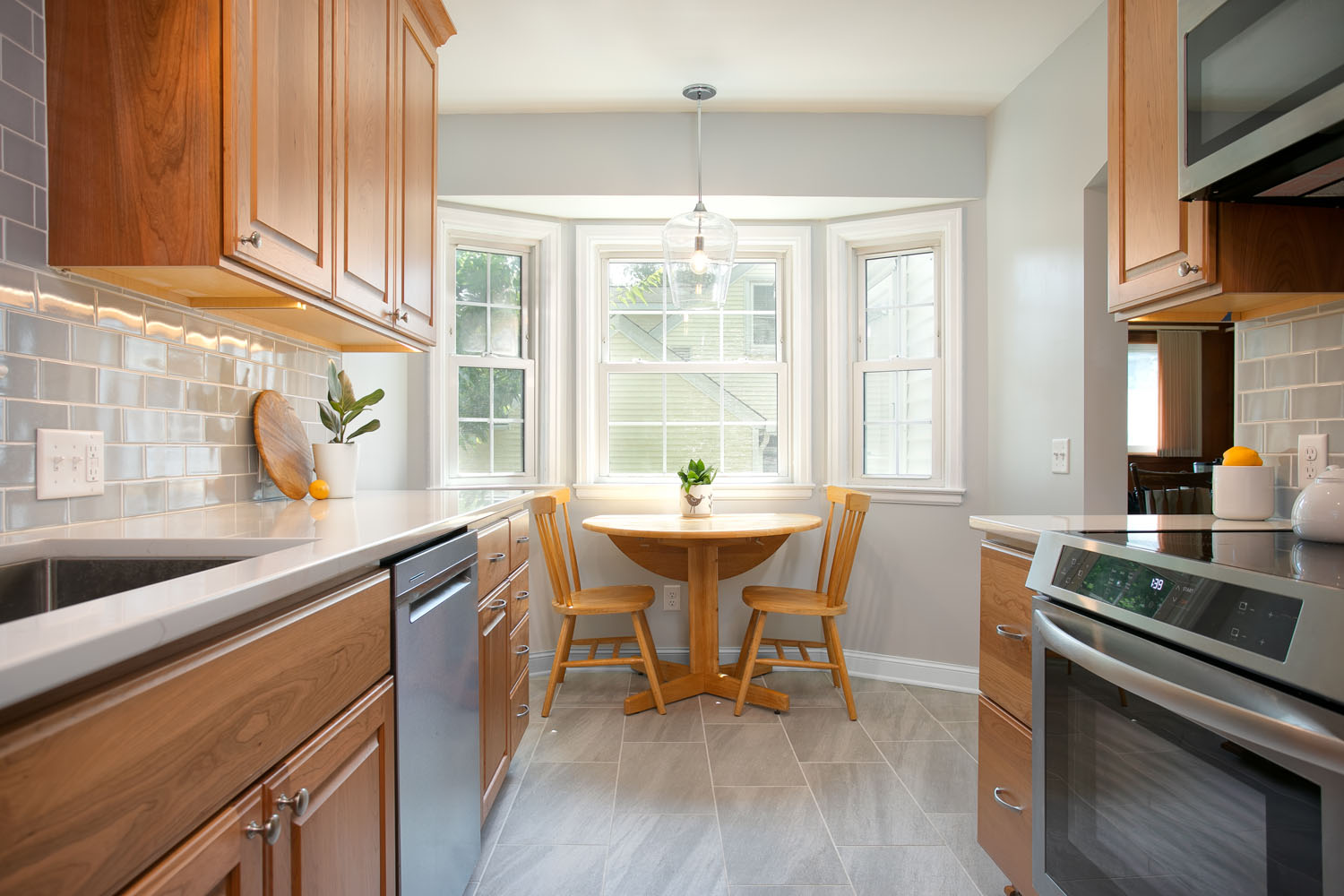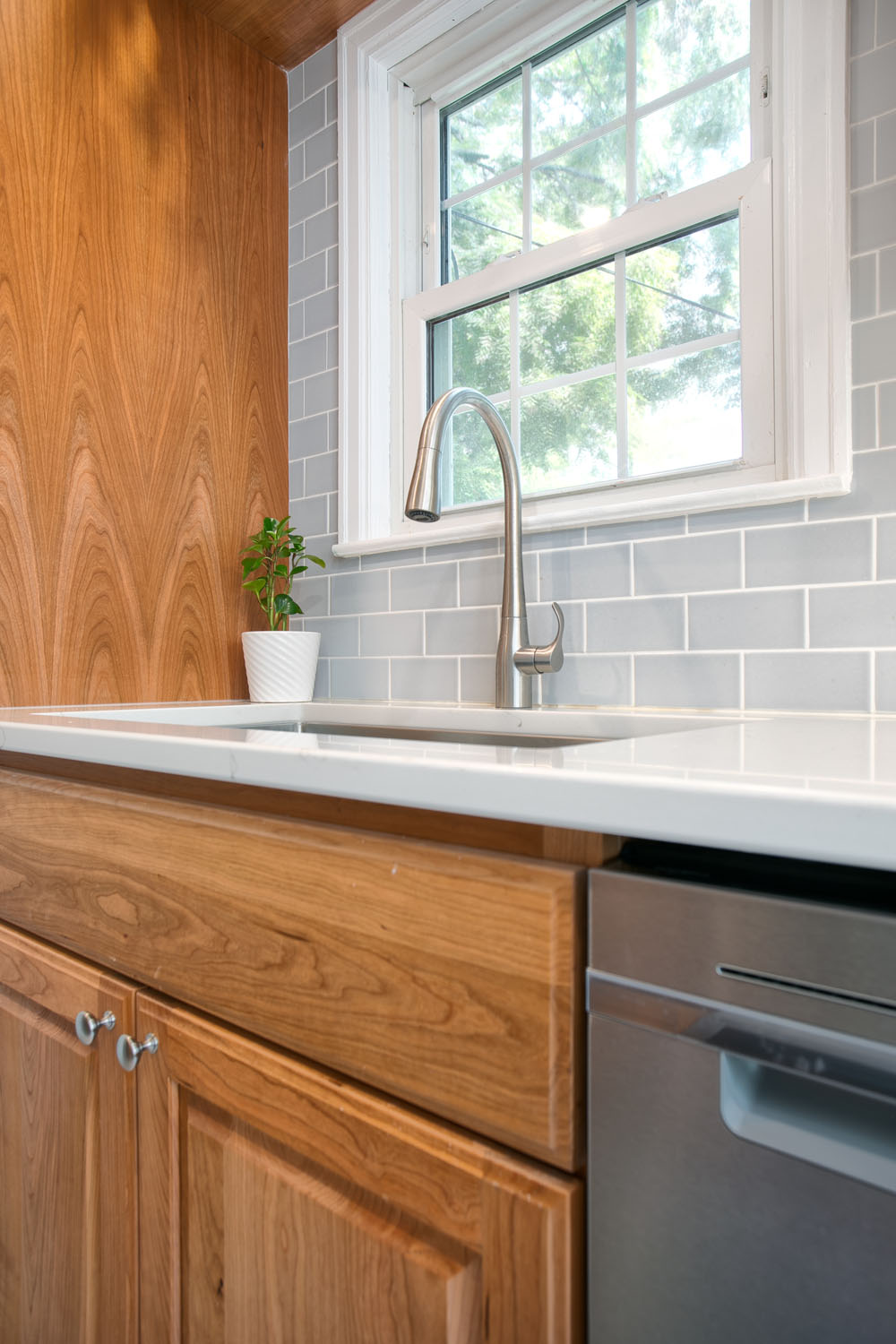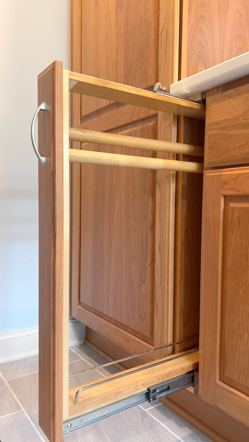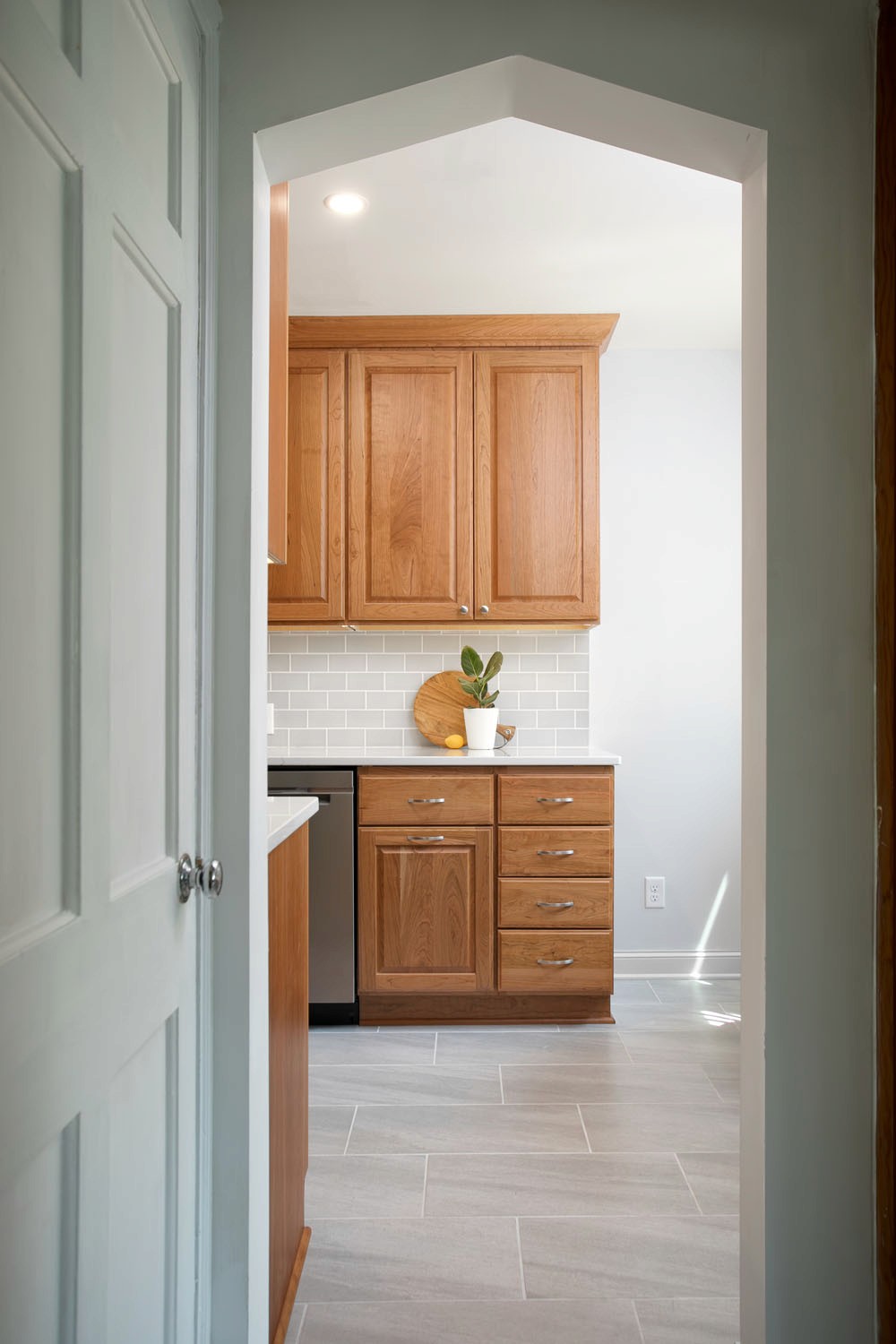 These past clients called Castle back when they were ready to remodel their kitchen. As recent empty nesters the couple wanted a kitchen that had more counter space and better lighting. The clients wanted a kitchen with a timeless look that would fit in the 1940’s cape cad style home and that wouldn’t go out of style and be too trendy. This galley kitchen features cherry wood doors with a raised panel style door. Quartz countertops were installed with a single bin undermount sink. A porcelain large format tile floor was installed as well as a Fireclay 3×6 tile backsplash. These clients were excited to use their newly remodeled kitchen for two.