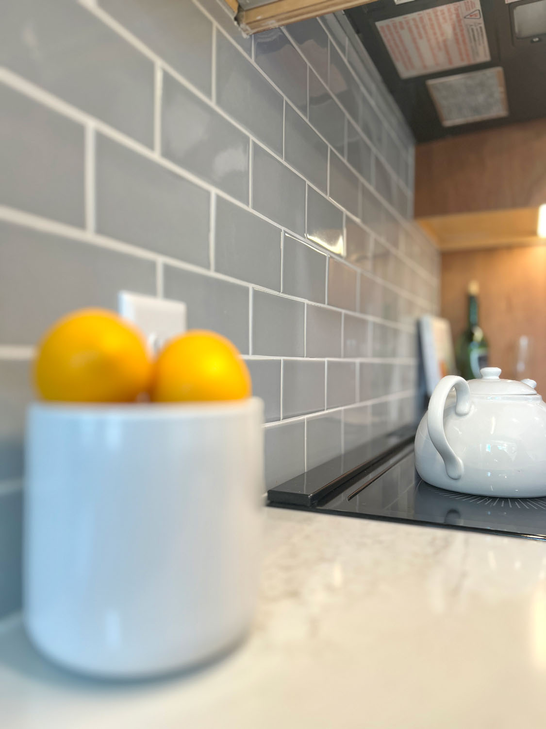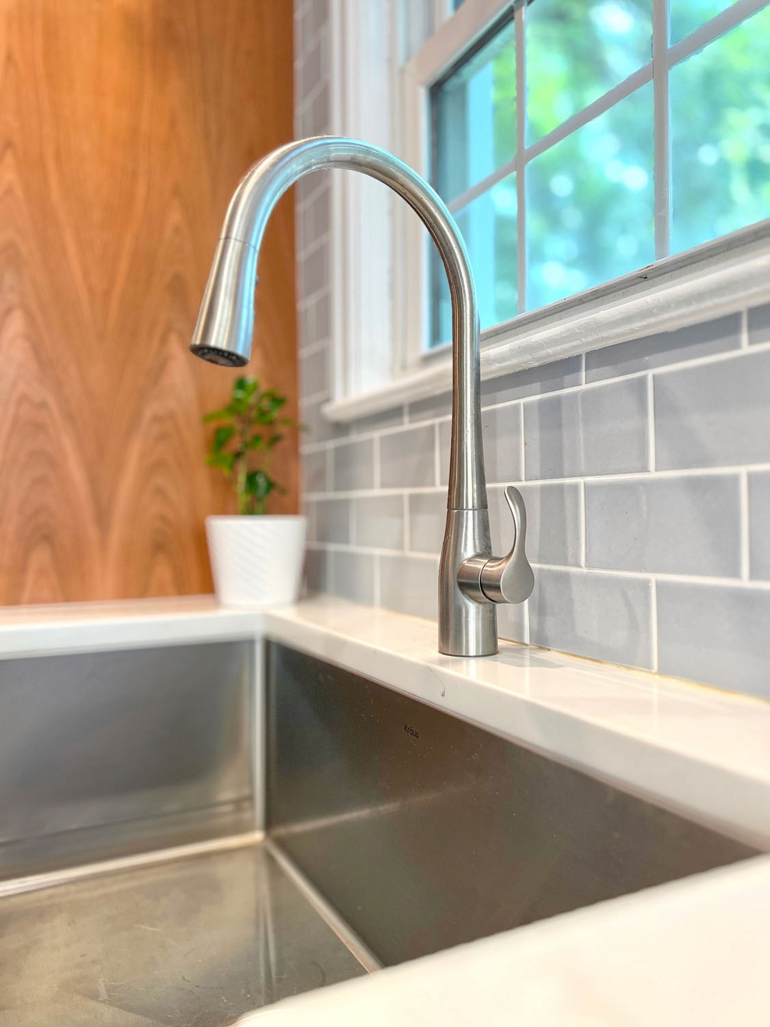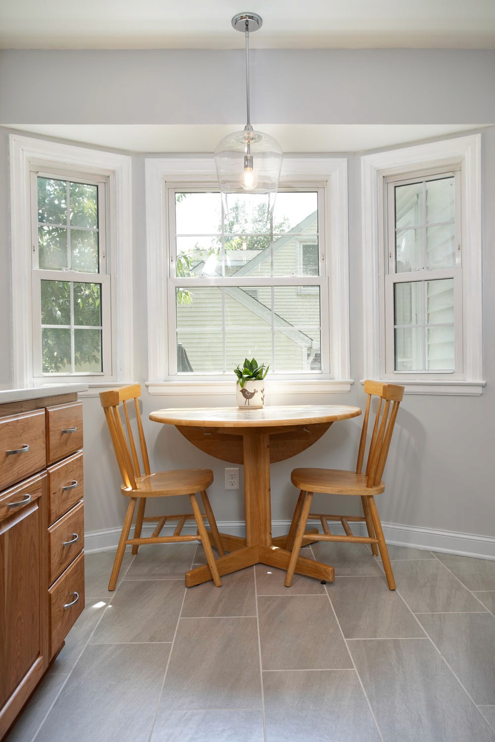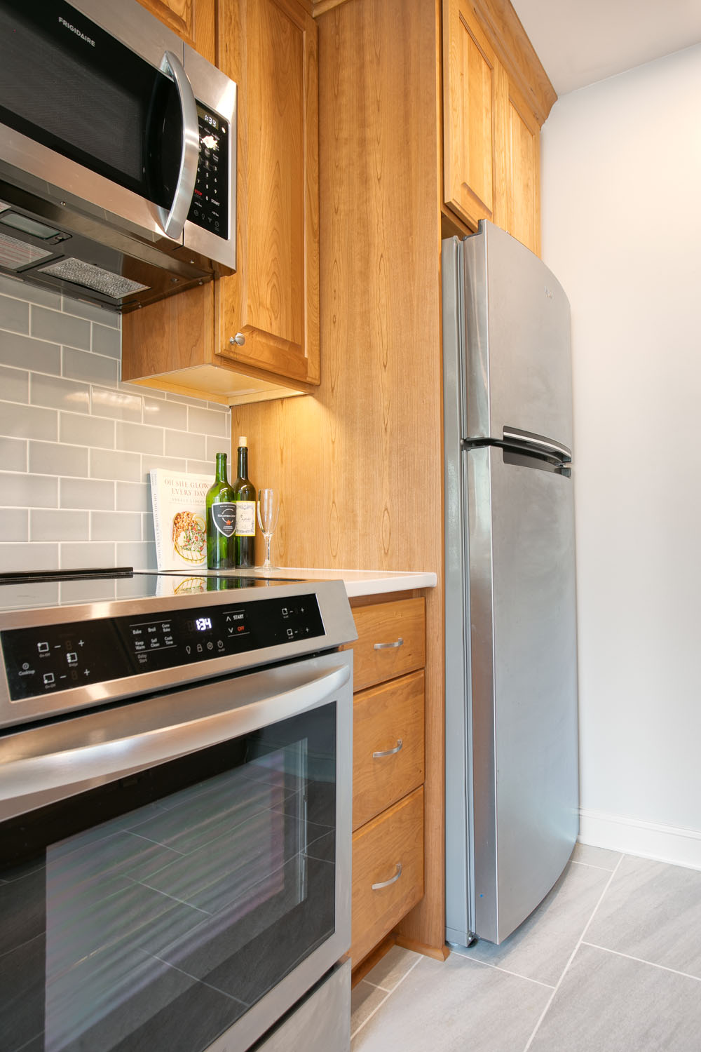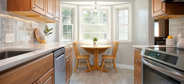 These past clients called Castle back when they were ready to remodel their kitchen. As recent empty nesters the couple wanted a kitchen that had more counter space and better lighting. The clients wanted a kitchen with a timeless look that would fit in the 1940’s cape cad style home and that wouldn’t go out of style and be too trendy. This galley kitchen features cherry wood doors with a raised panel style door. Quartz countertops were installed with a single bin undermount sink. A porcelain large format tile floor was installed as well as a Fireclay 3×6 tile backsplash. These clients were excited to use their newly remodeled kitchen for two.