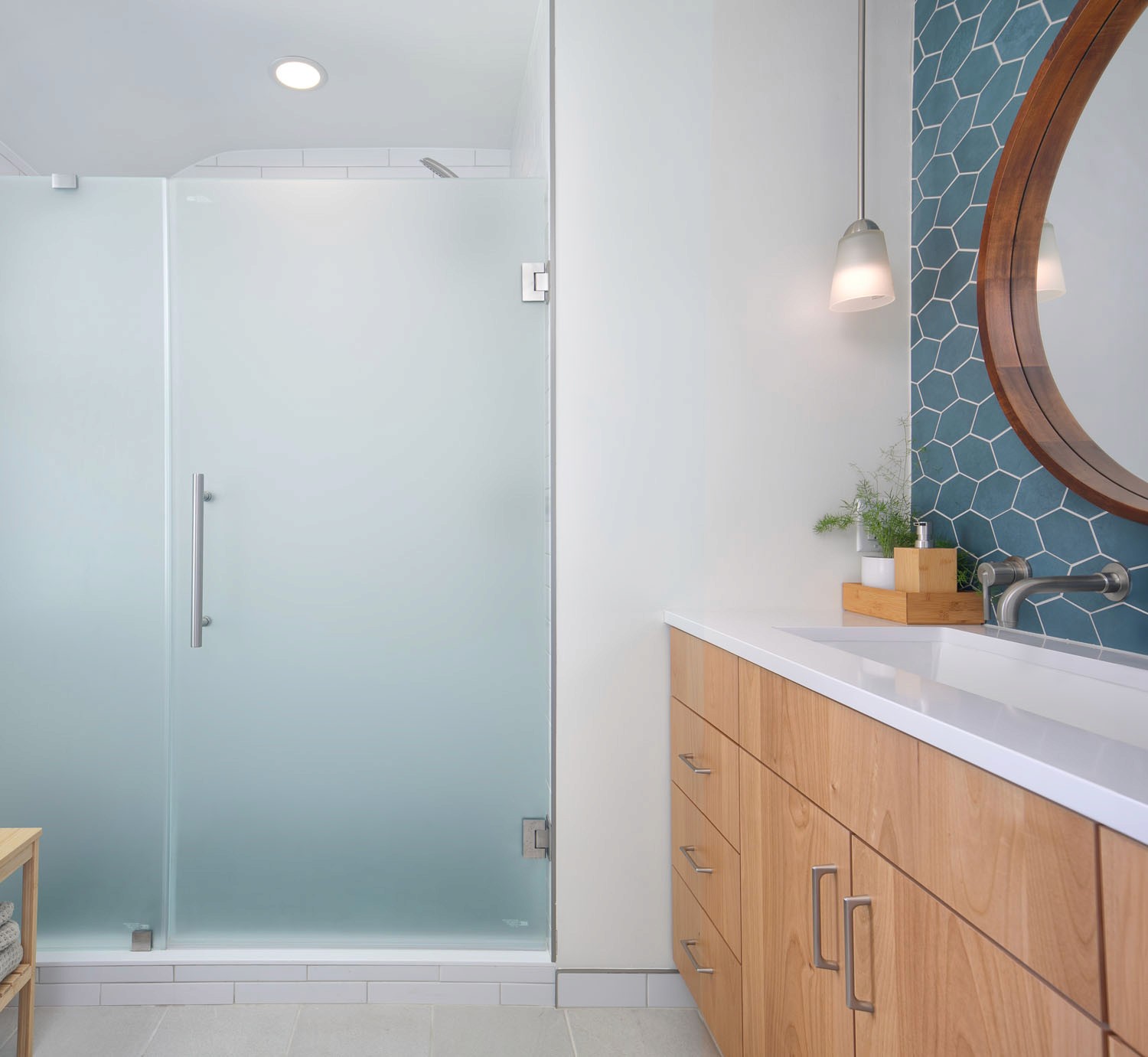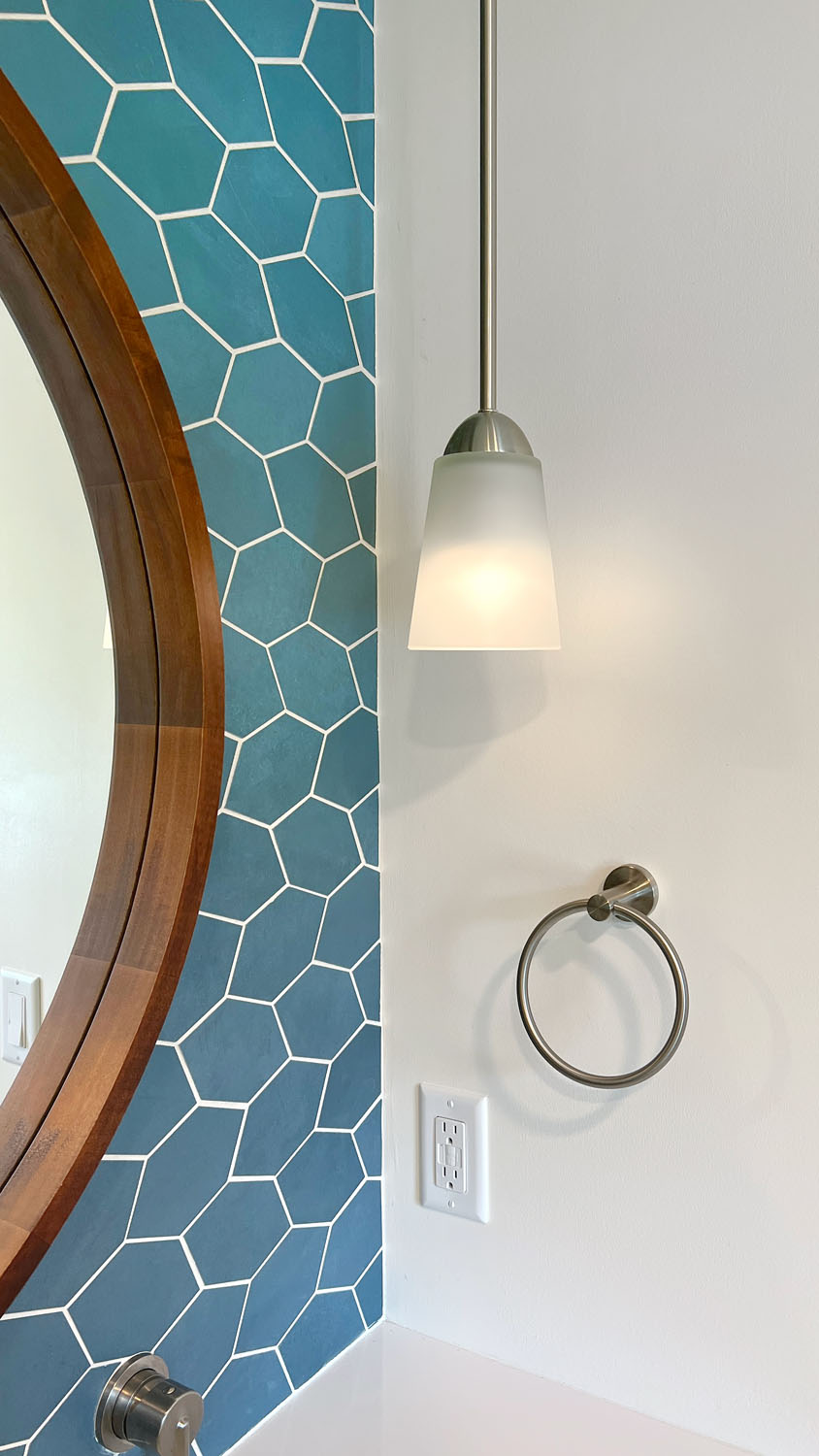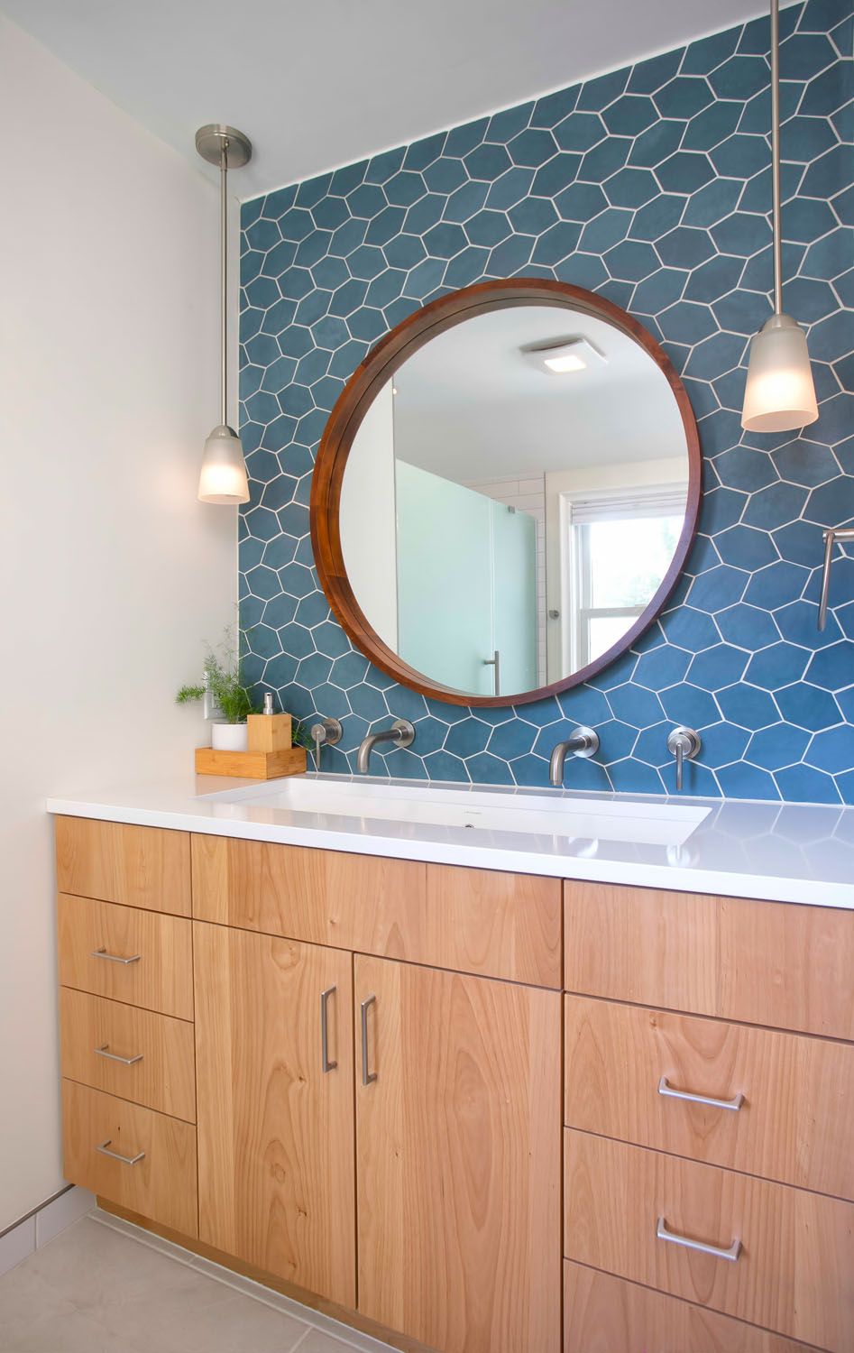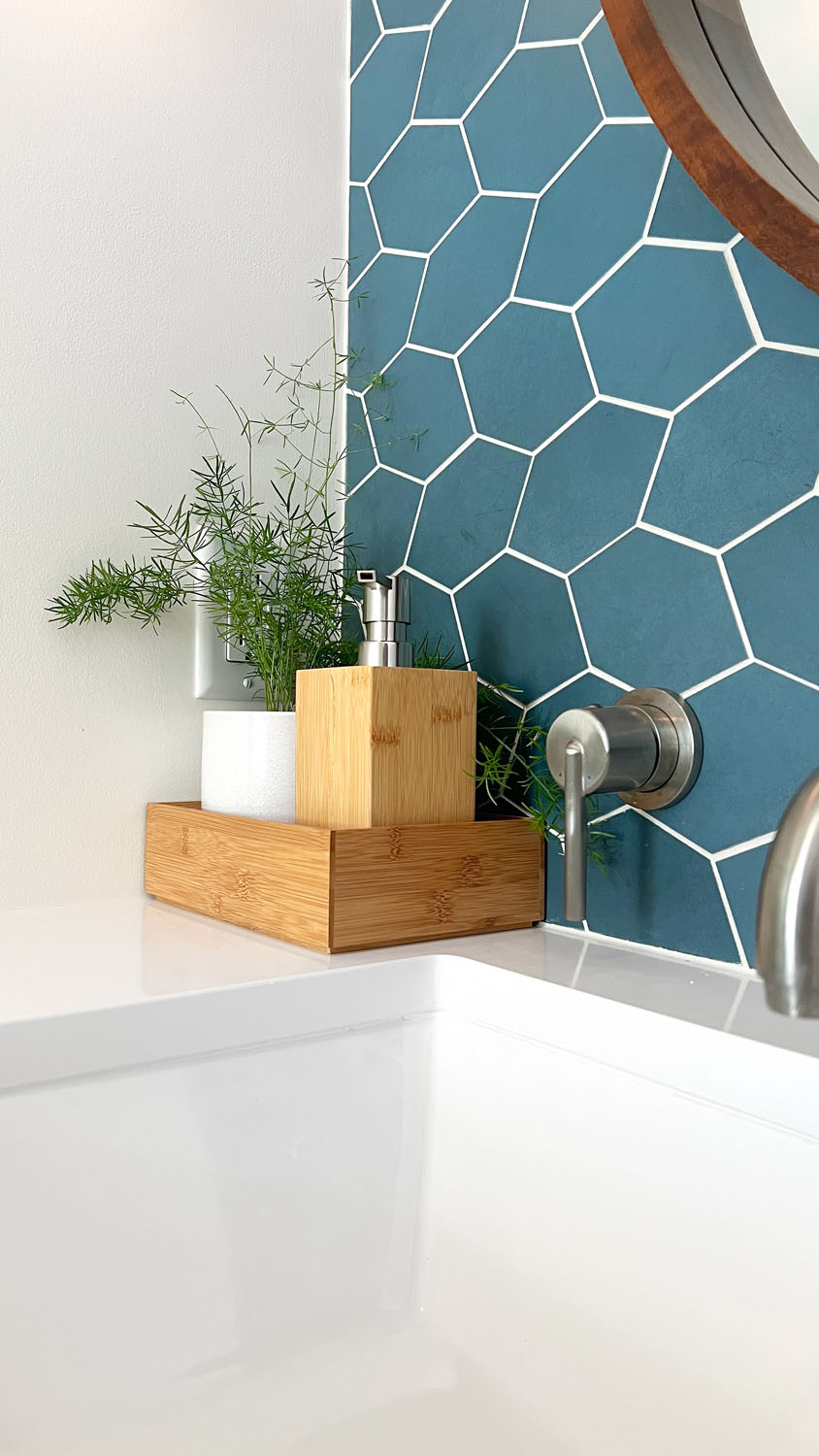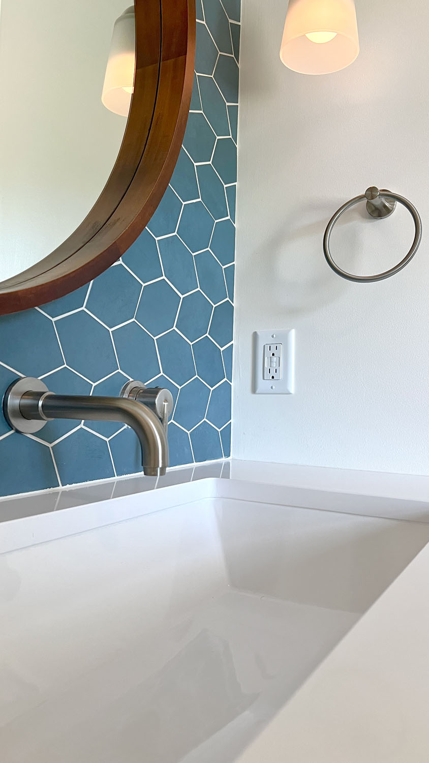 These clients wanted to transform their main bathroom to a more functional layout with a new look. With a bedroom adjacent to the bathroom, we took from the closet to make room for a new vanity with a trough sink. While bringing in pops of blue, organic materials and textures mixed with the simplicity of a clean palette, made this bathroom come to life.