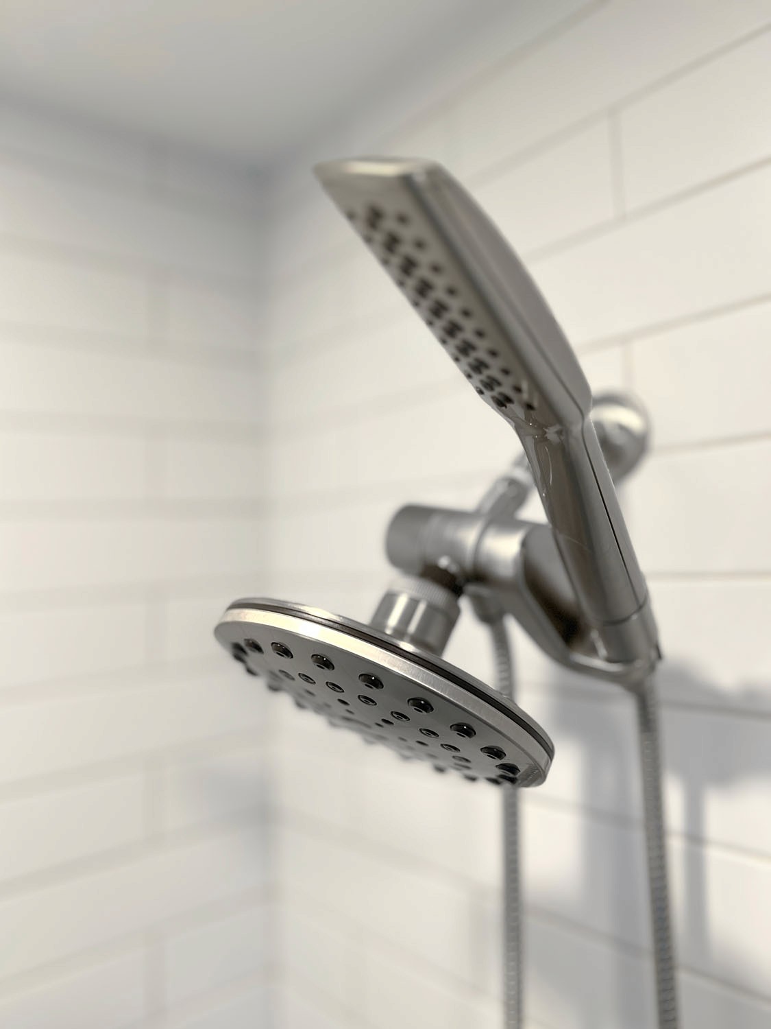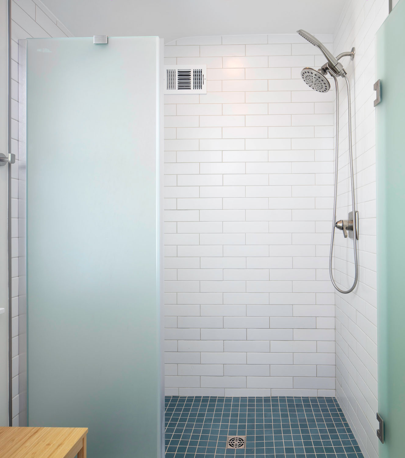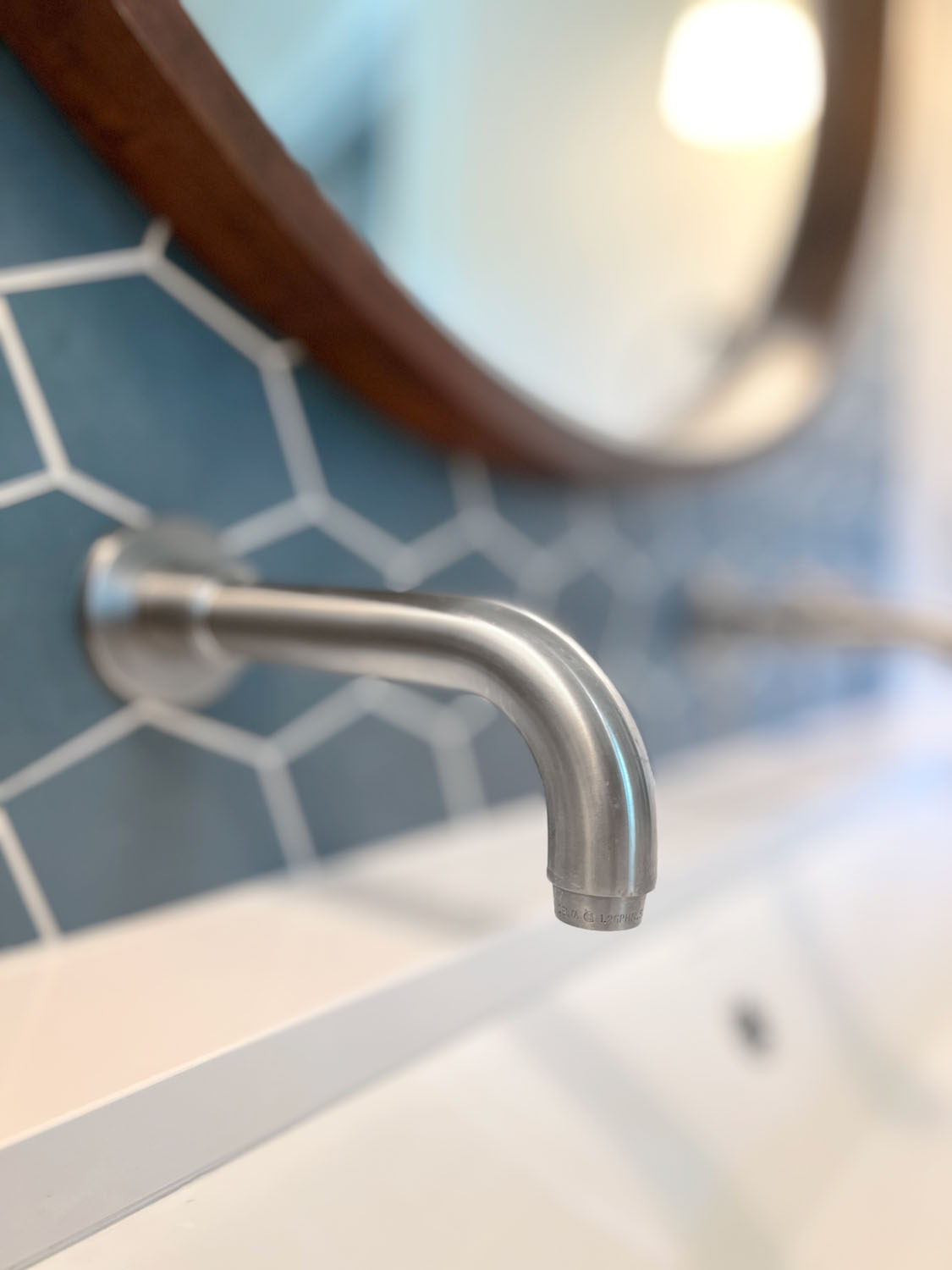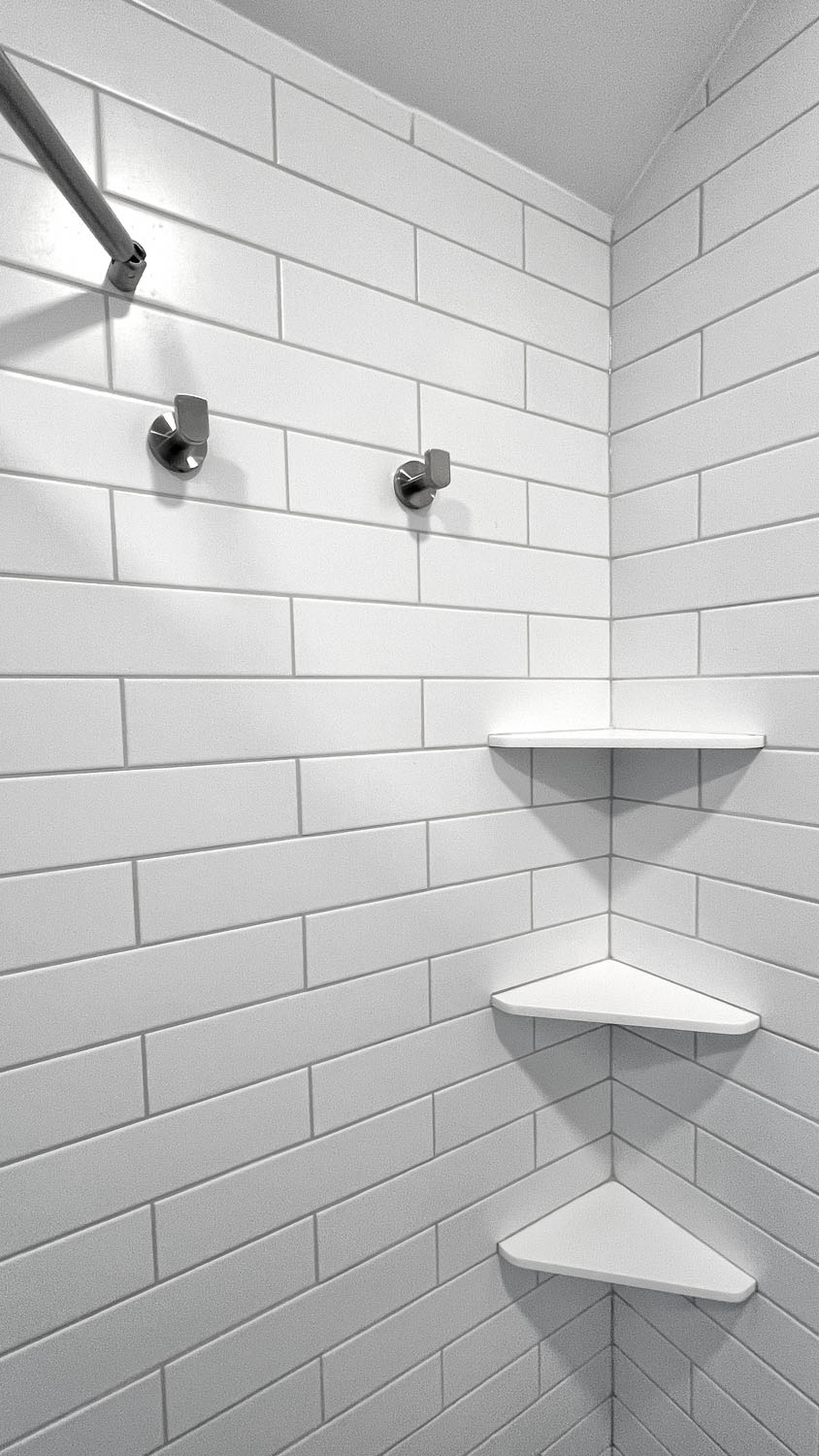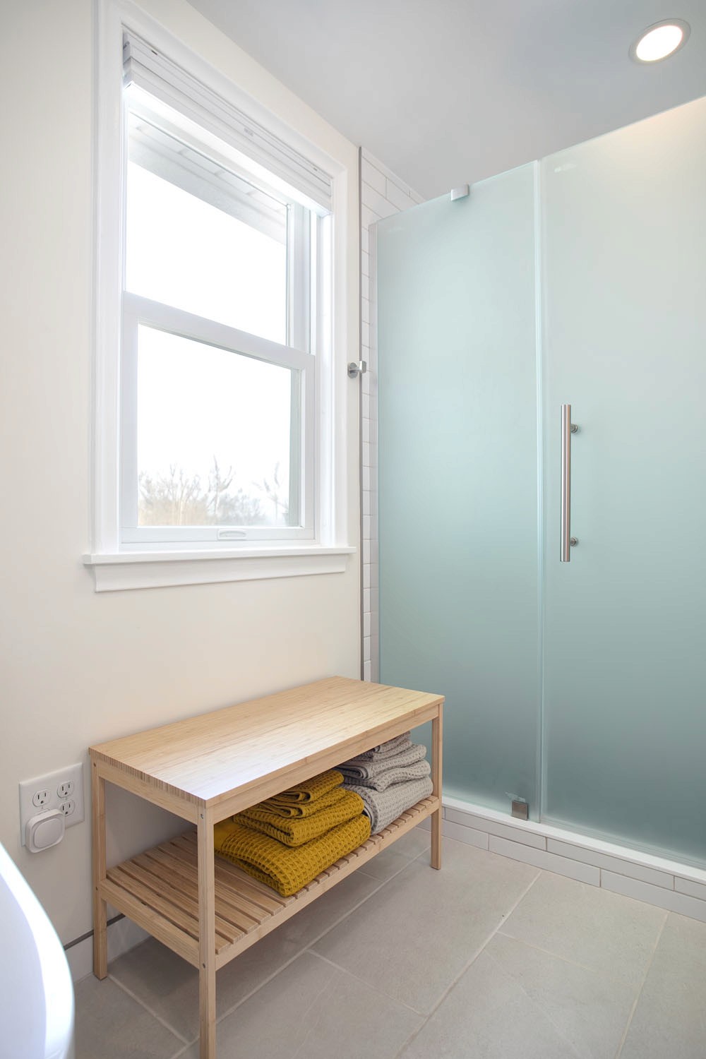 These clients wanted to transform their main bathroom to a more functional layout with a new look. With a bedroom adjacent to the bathroom, we took from the closet to make room for a new vanity with a trough sink. While bringing in pops of blue, organic materials and textures mixed with the simplicity of a clean palette, made this bathroom come to life.