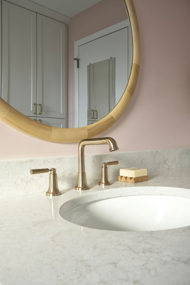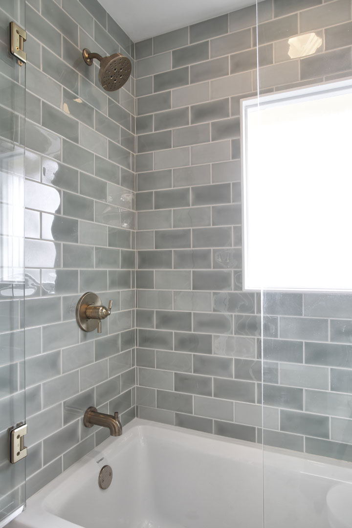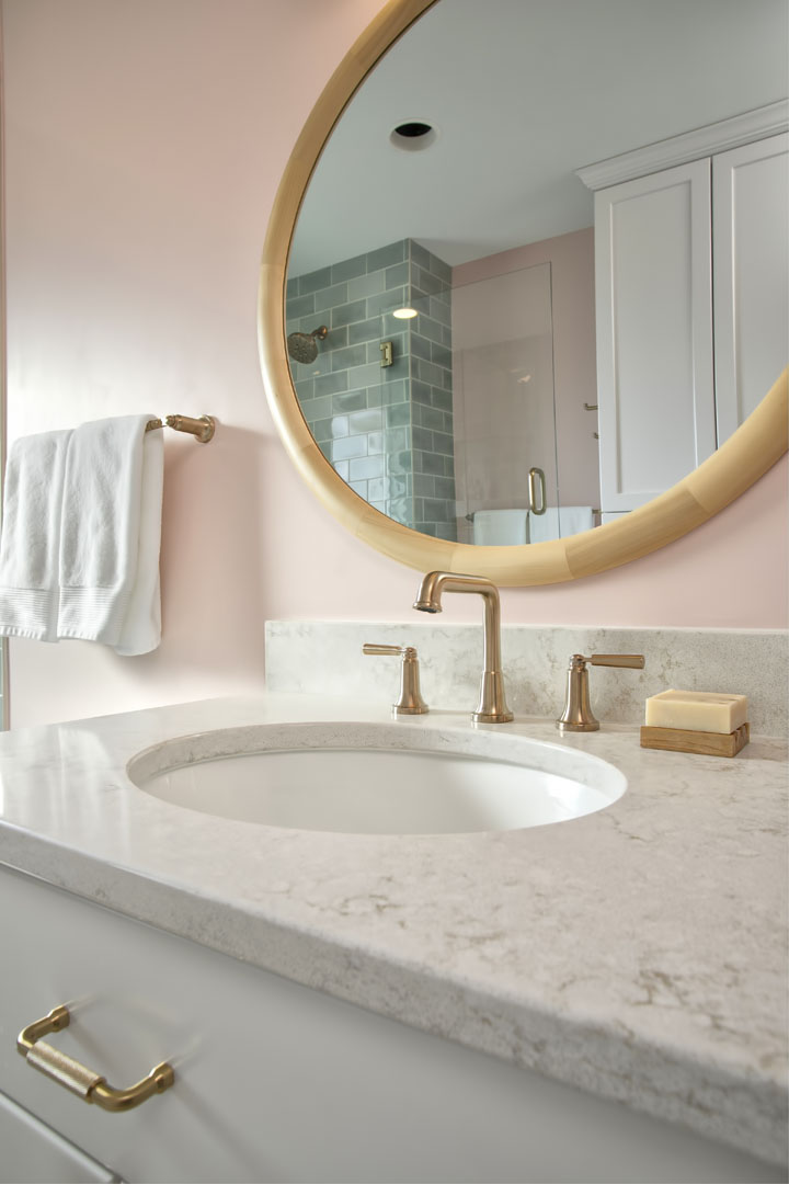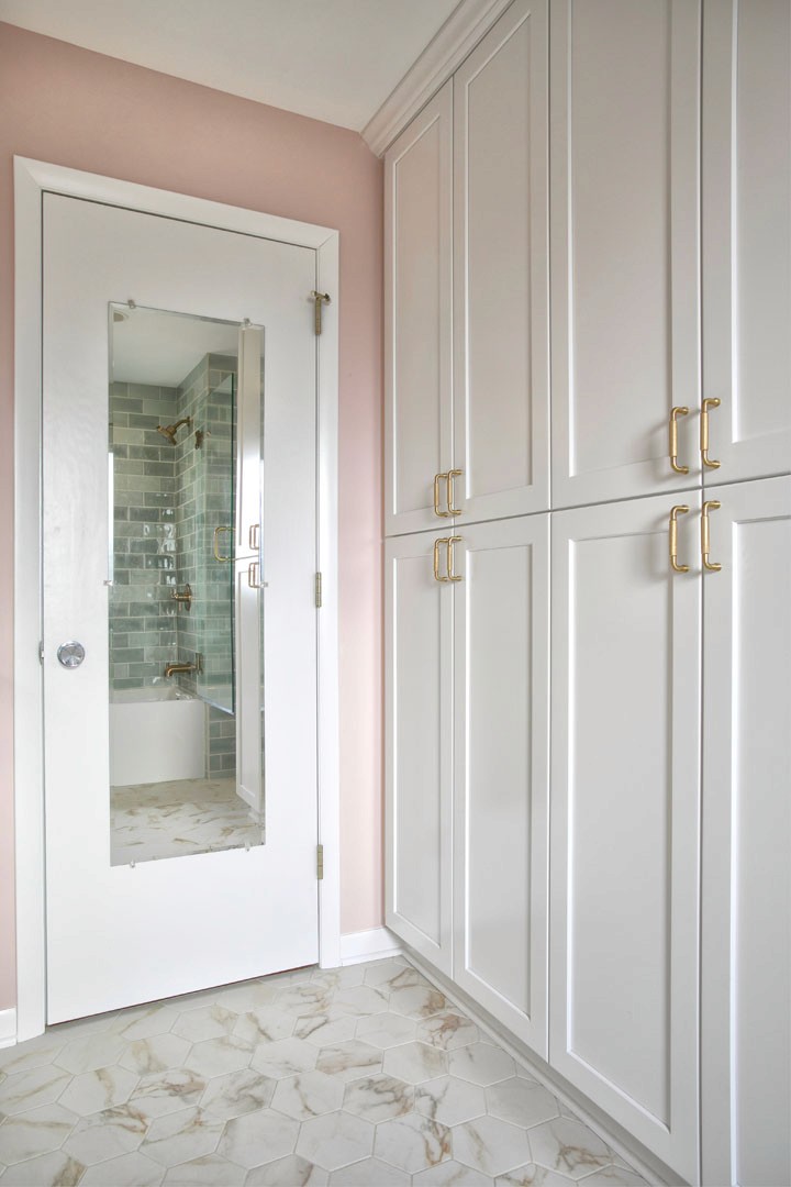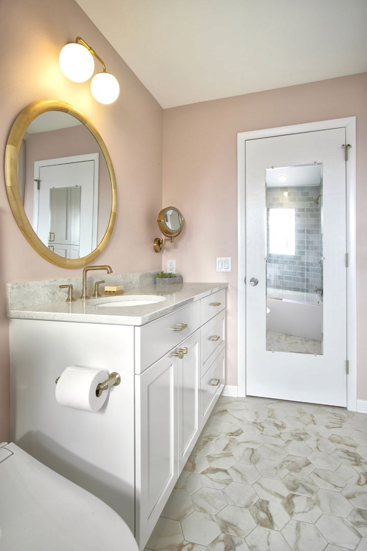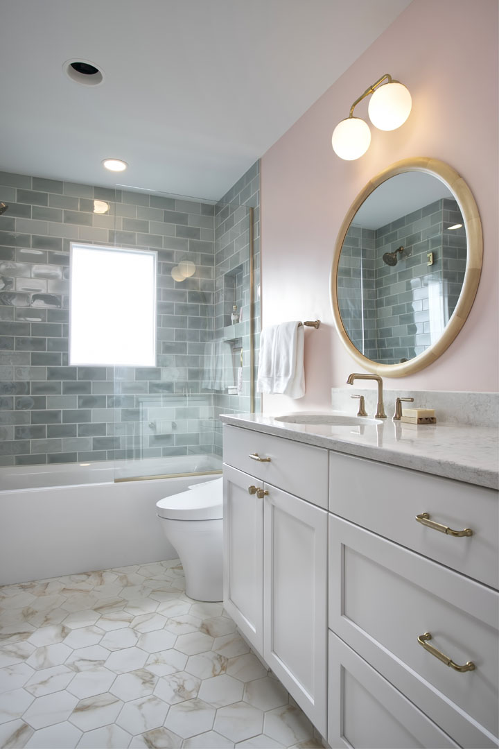 This outdated, dark and compartmentalized bathroom needed an update. The original layout separated a vanity and linen closet area from the sink, toilet and tub/shower. The wall between the spaces was removed to create one large open bathroom. The entire space was reconfigured to maximize space for a tub/shower, ample vanity, countertop, and storage and to create a much more open feel. A new window filters bright light throughout the bathroom, and a light color palette creates a fresh and calming feeling in the space. Watery blue green tile, blush pink walls, brushed brass fixtures, and marble accents create a luxury finished space.