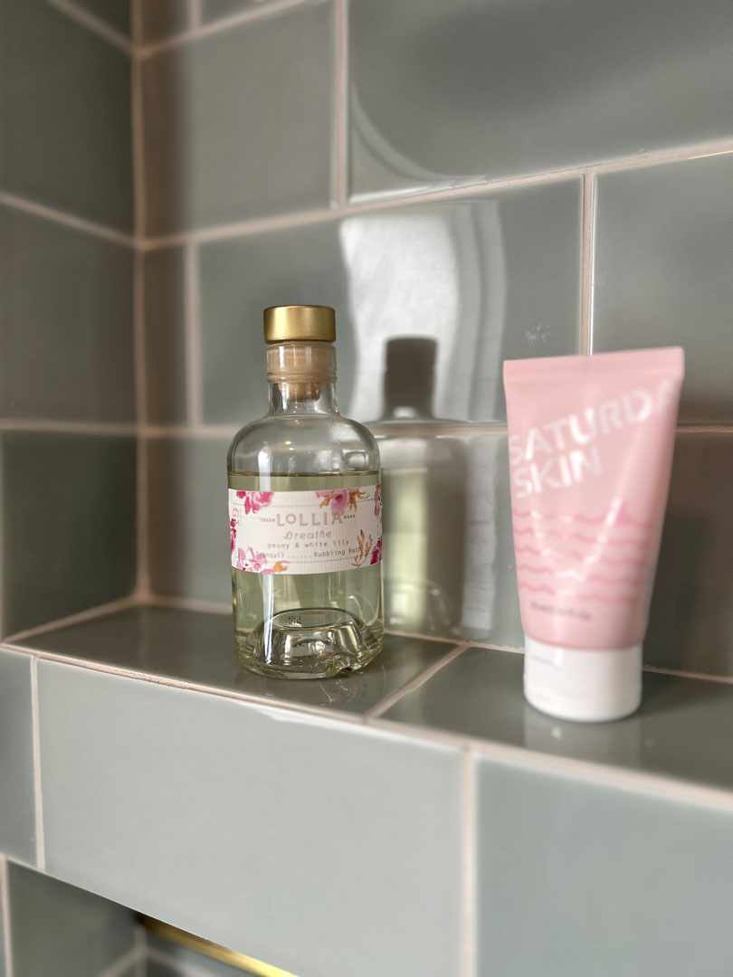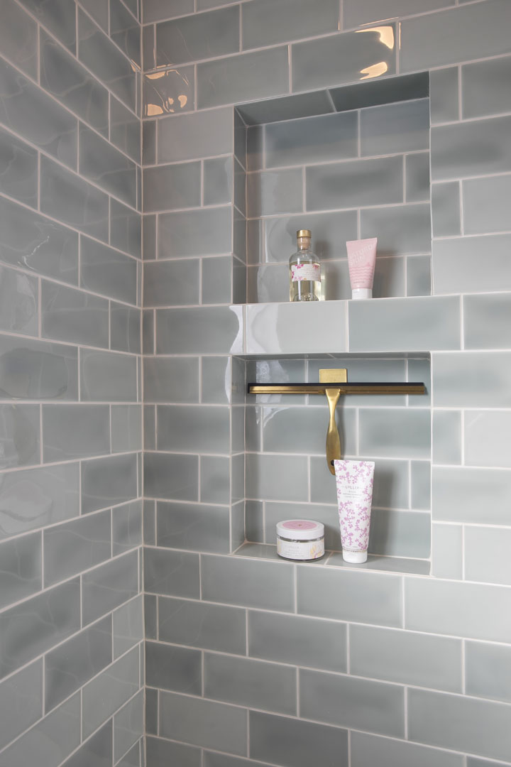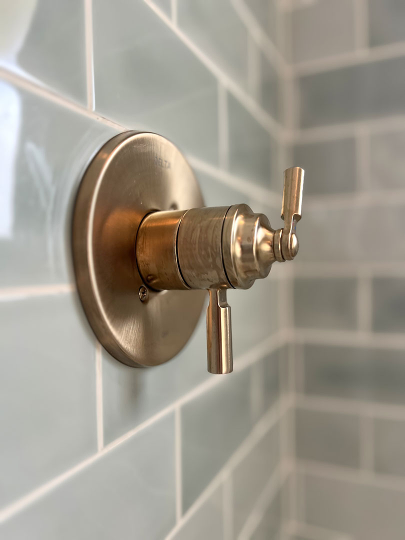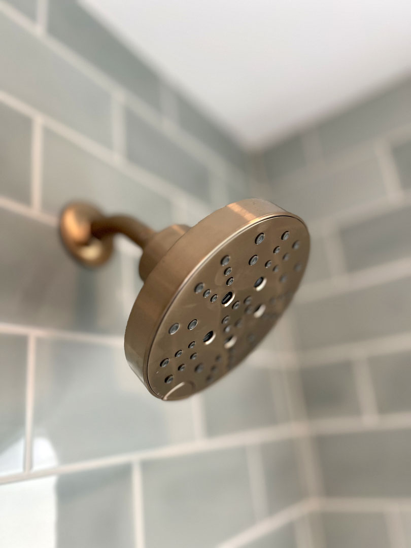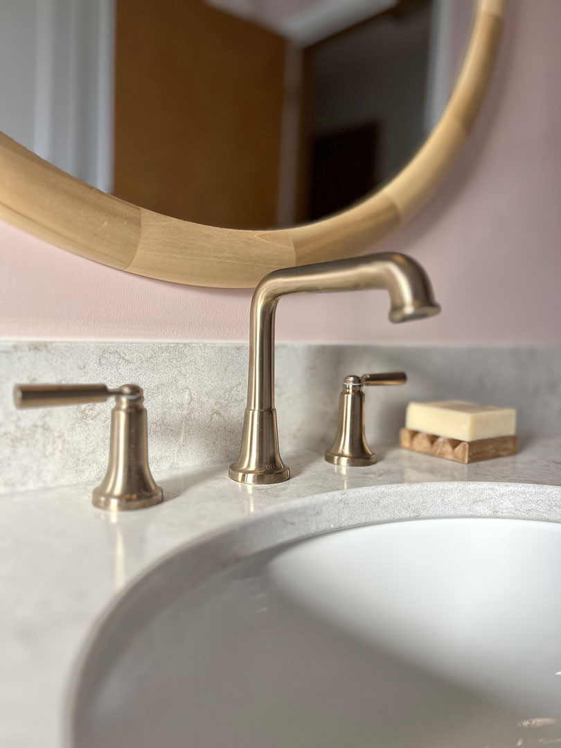 This outdated, dark and compartmentalized bathroom needed an update. The original layout separated a vanity and linen closet area from the sink, toilet and tub/shower. The wall between the spaces was removed to create one large open bathroom. The entire space was reconfigured to maximize space for a tub/shower, ample vanity, countertop, and storage and to create a much more open feel. A new window filters bright light throughout the bathroom, and a light color palette creates a fresh and calming feeling in the space. Watery blue green tile, blush pink walls, brushed brass fixtures, and marble accents create a luxury finished space.