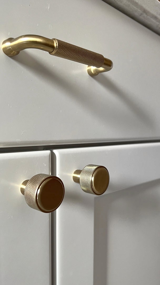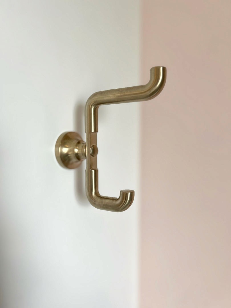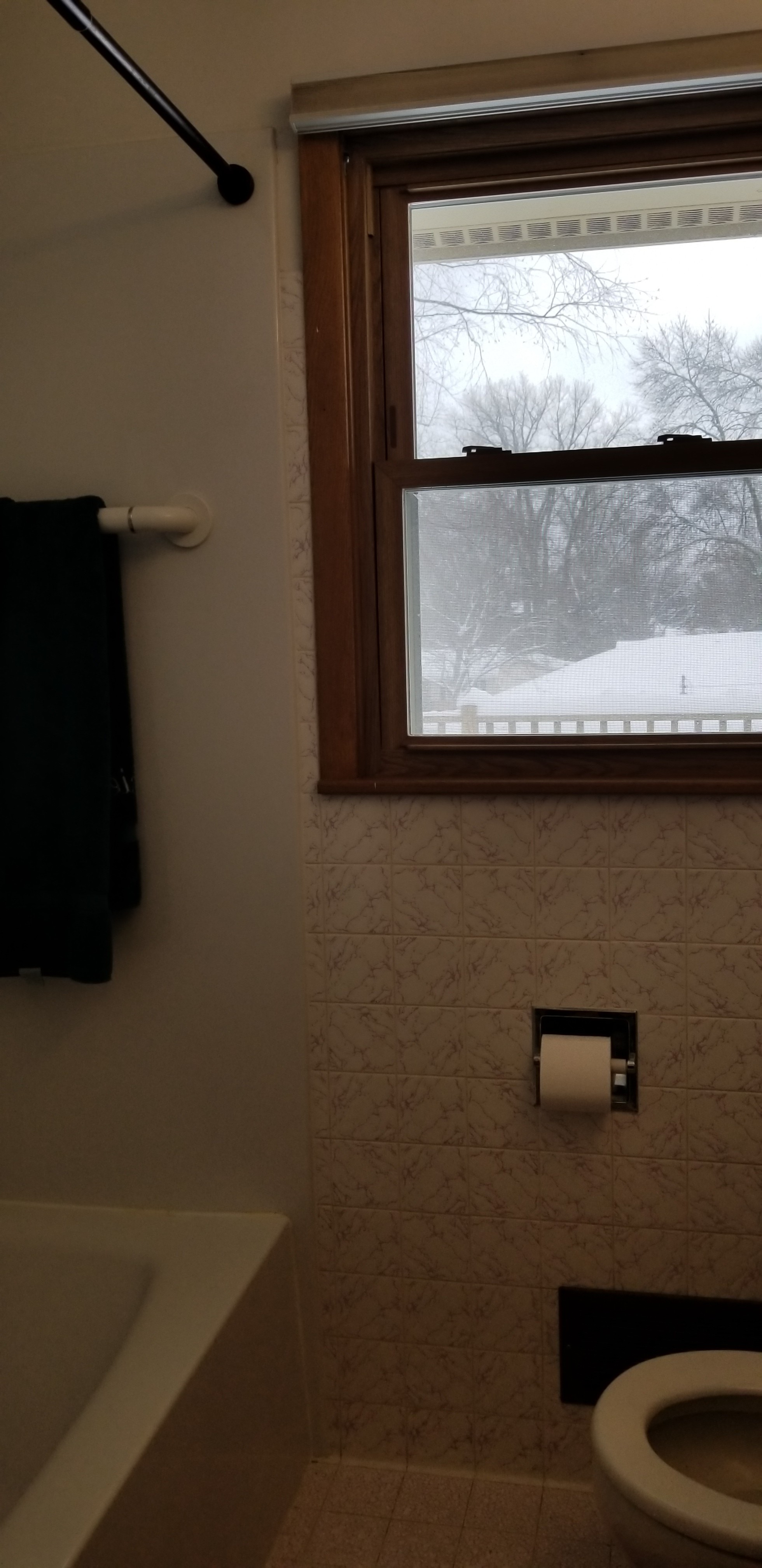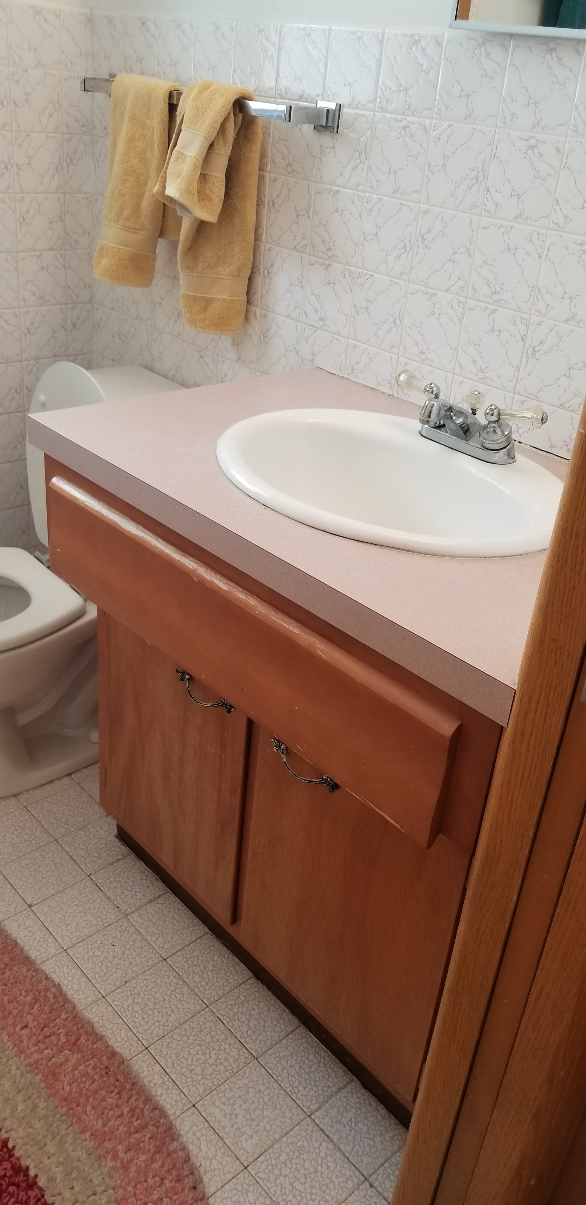 This outdated, dark and compartmentalized bathroom needed an update. The original layout separated a vanity and linen closet area from the sink, toilet and tub/shower. The wall between the spaces was removed to create one large open bathroom. The entire space was reconfigured to maximize space for a tub/shower, ample vanity, countertop, and storage and to create a much more open feel. A new window filters bright light throughout the bathroom, and a light color palette creates a fresh and calming feeling in the space. Watery blue green tile, blush pink walls, brushed brass fixtures, and marble accents create a luxury finished space.