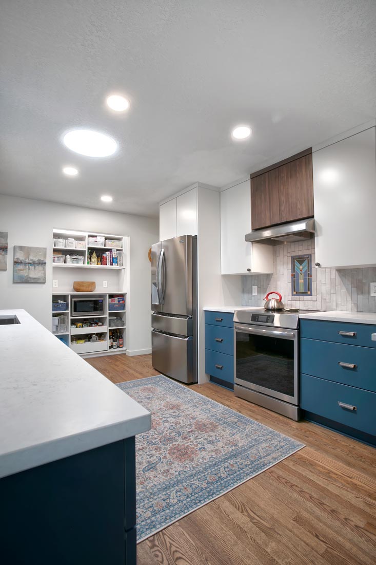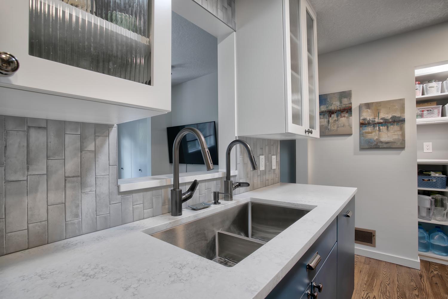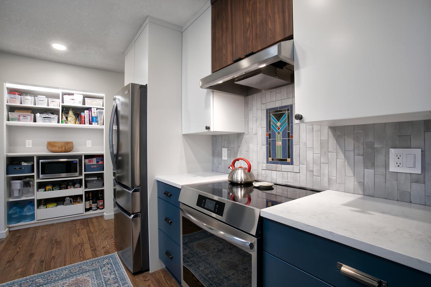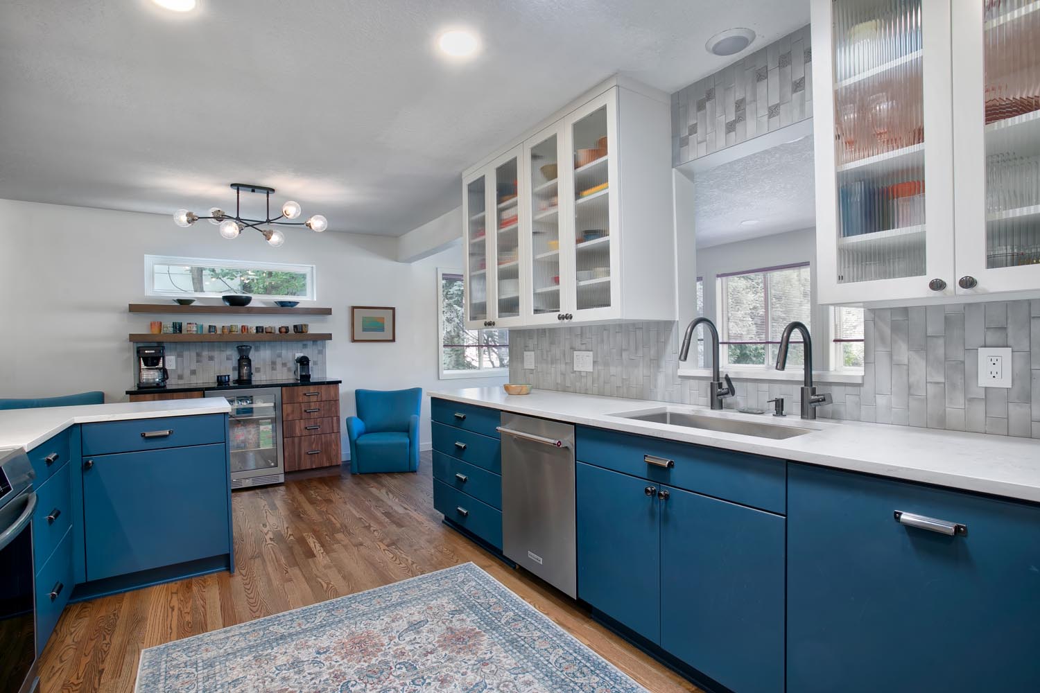 The kitchen remodel captured more of the available space, expanding the countertops and cabinetry. Reconfiguring the layout a bit has gone a long way to allow for more cooks to be in the kitchen at one time. Another big change is the updated selections and fixtures. Navy blue, white and stained cabinetry mix together providing eye catching contrast. Tile backsplash was installed that incorporates locally hand made tile. The varying color and tile play well together and help speak to the client’s personalities.
