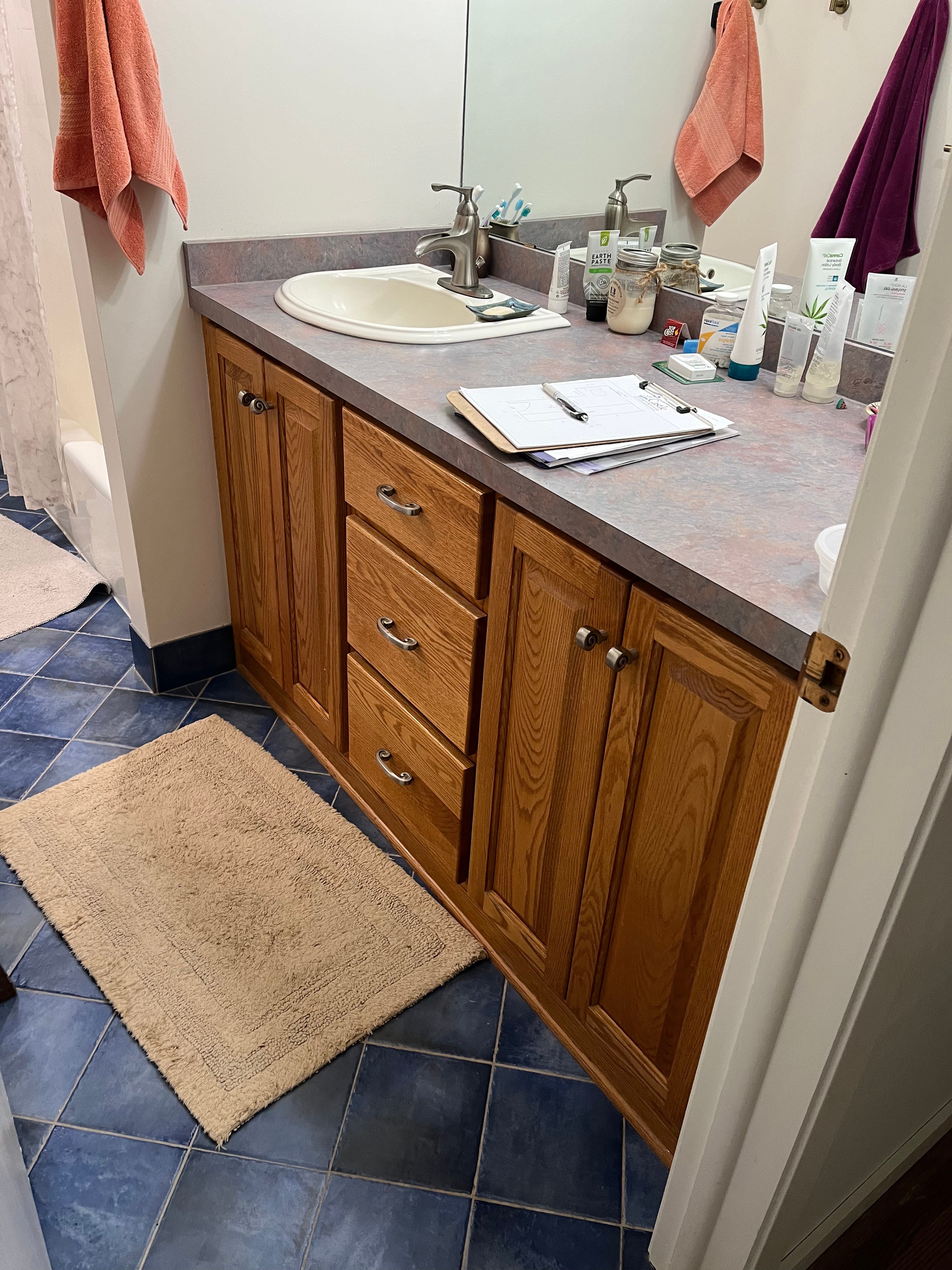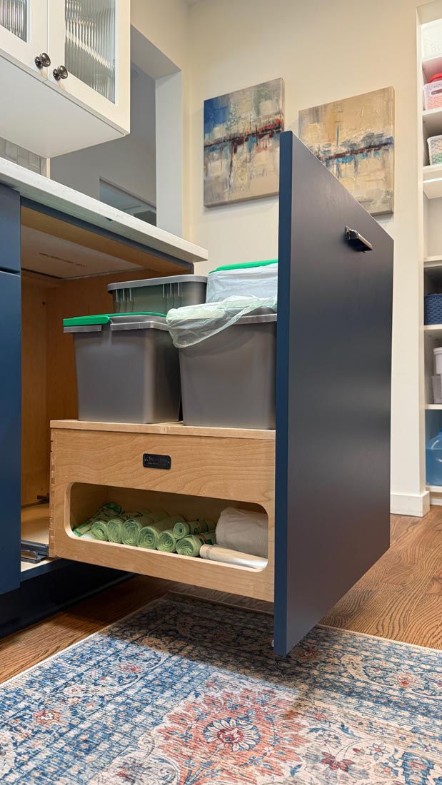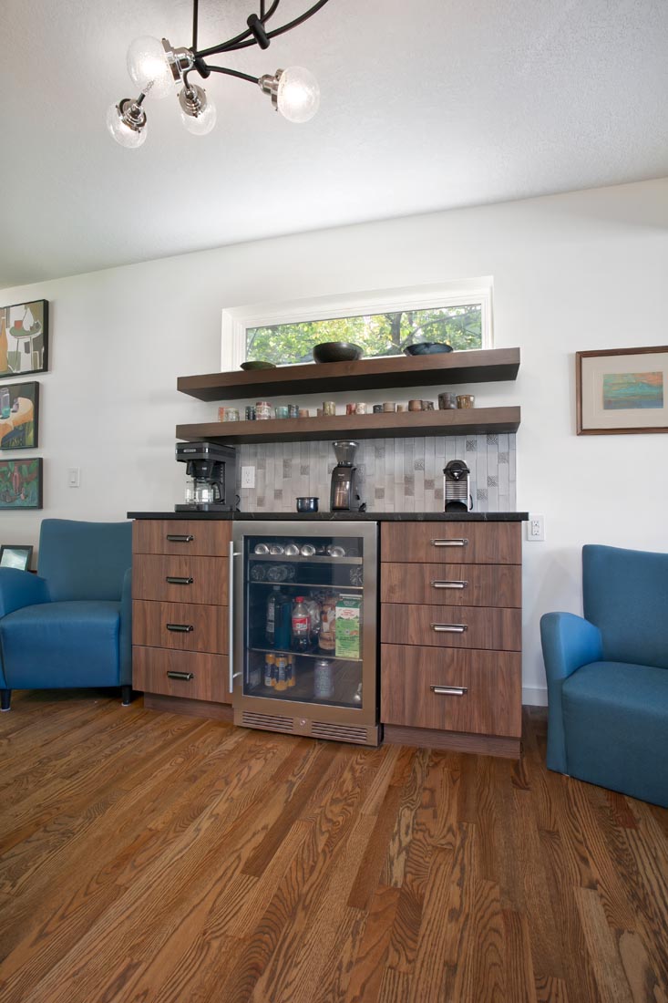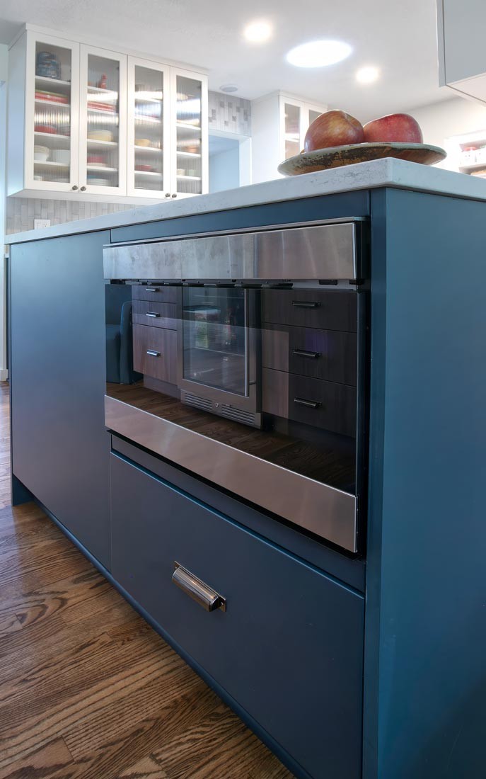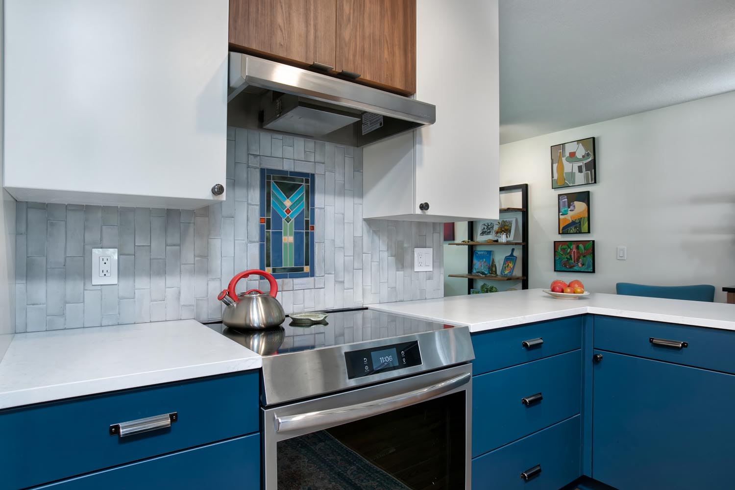 The kitchen remodel captured more of the available space, expanding the countertops and cabinetry. Reconfiguring the layout a bit has gone a long way to allow for more cooks to be in the kitchen at one time. Another big change is the updated selections and fixtures. Navy blue, white and stained cabinetry mix together providing eye catching contrast. Tile backsplash was installed that incorporates locally hand made tile. The varying color and tile play well together and help speak to the client’s personalities.