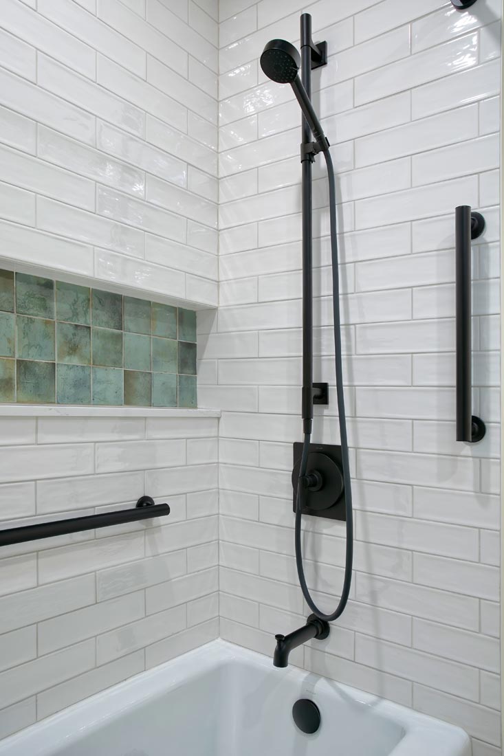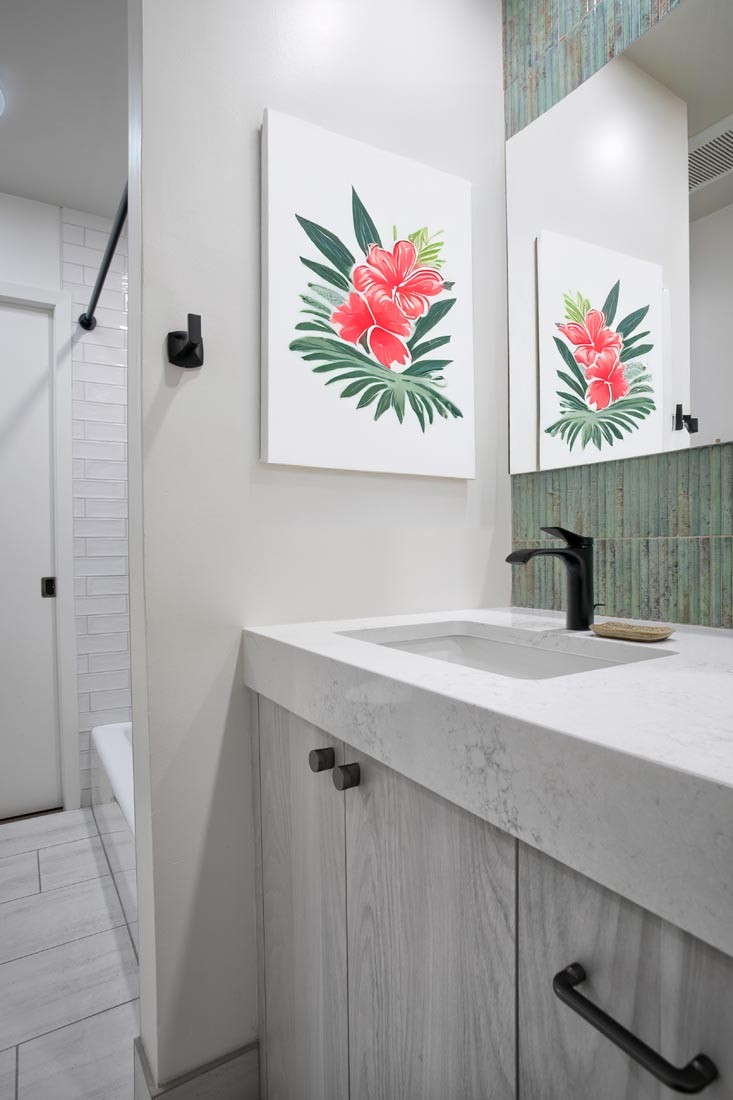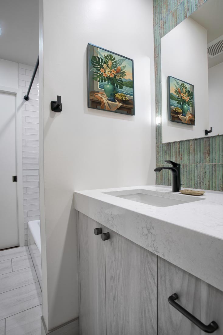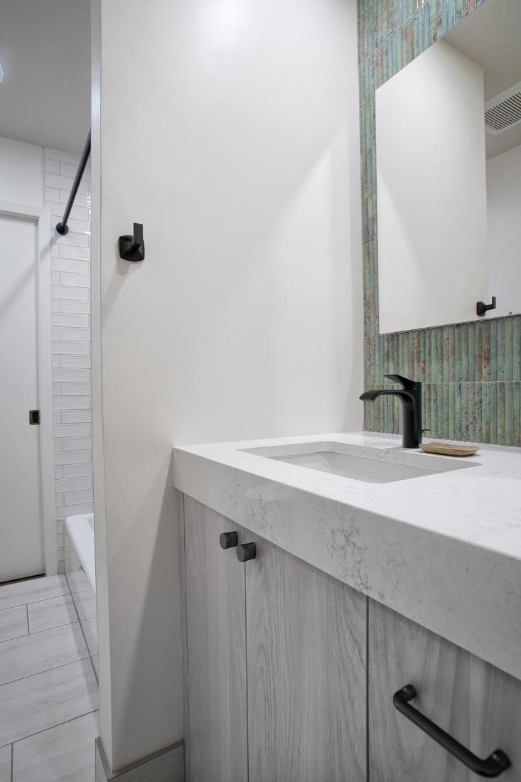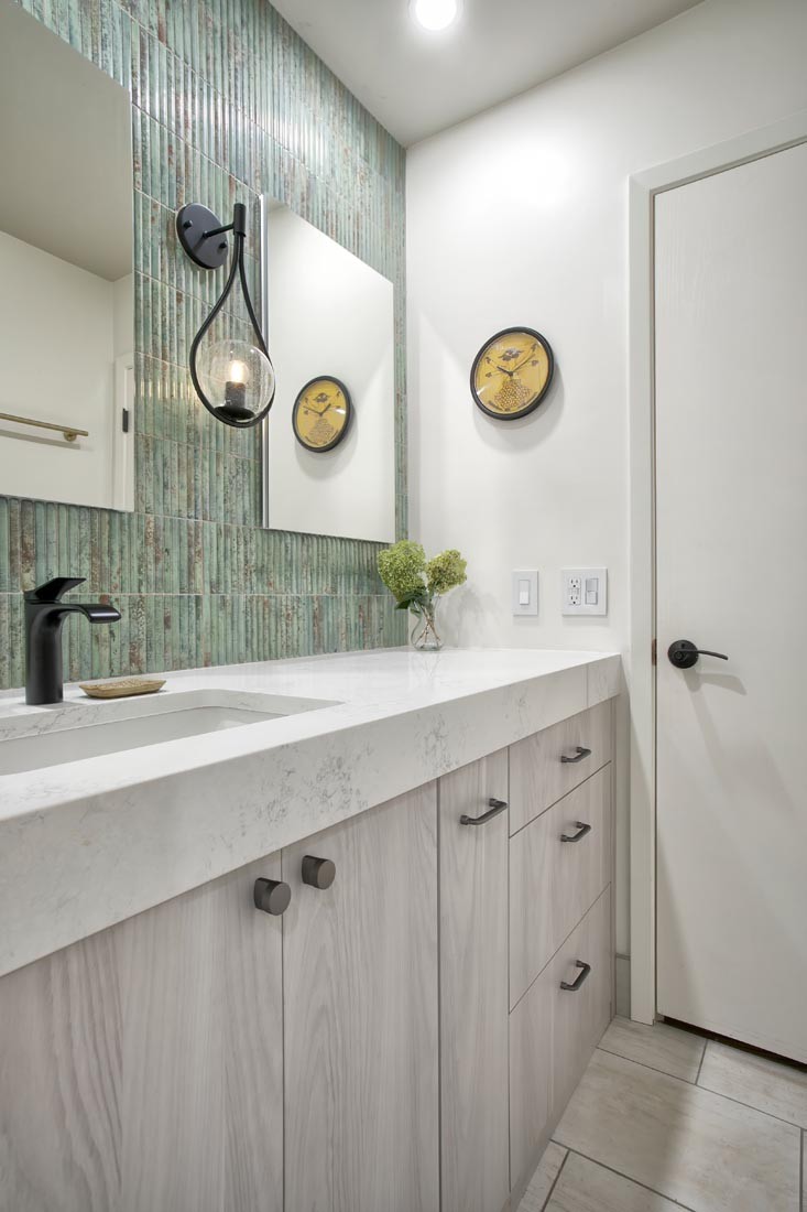 All cabinetry installed by Castle is from Crystal Cabinetry. The handmade tile is from Clay Squared. All countertops are Corian Quartz.