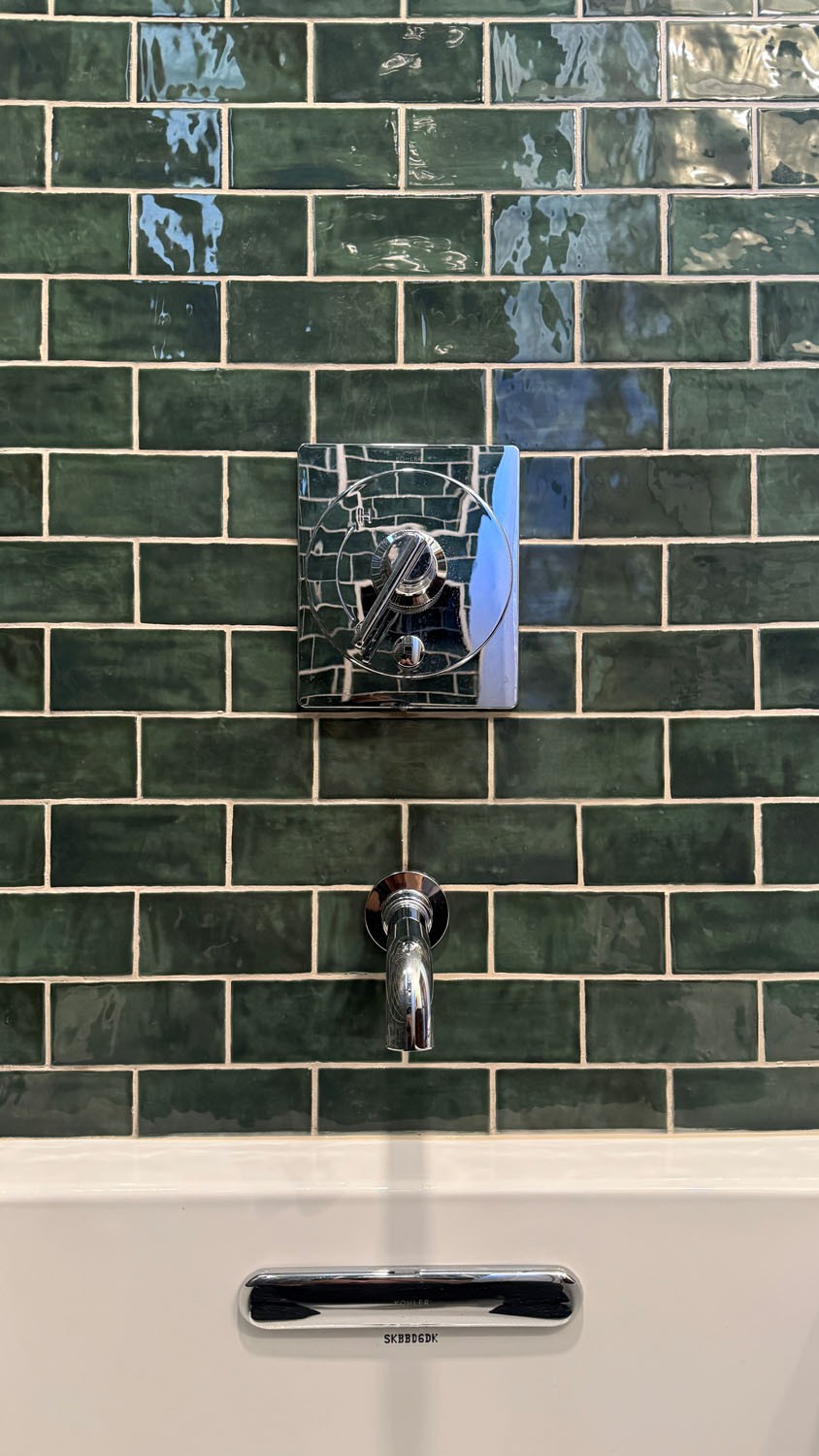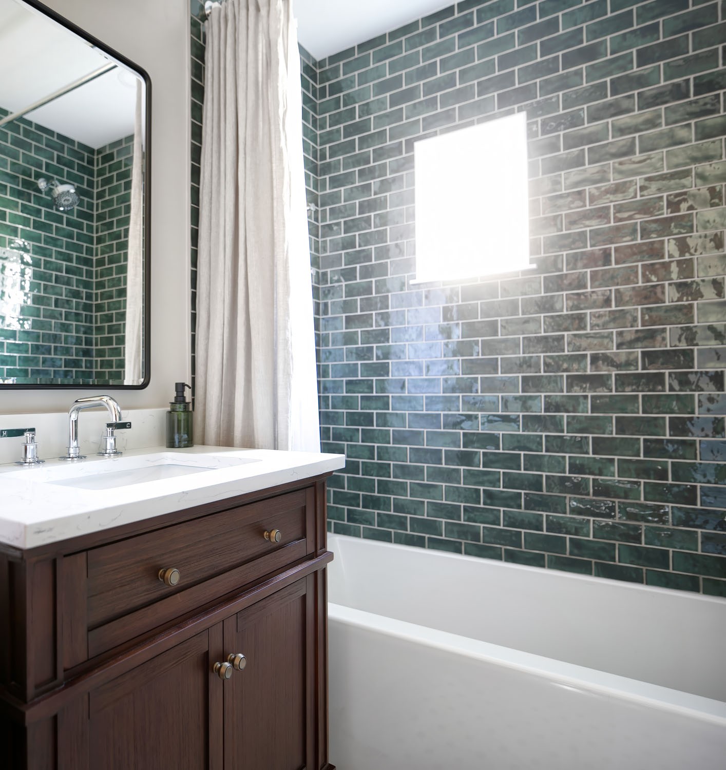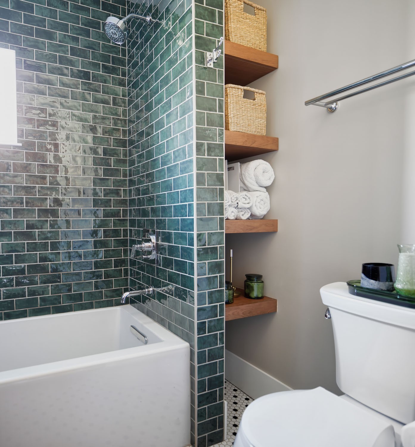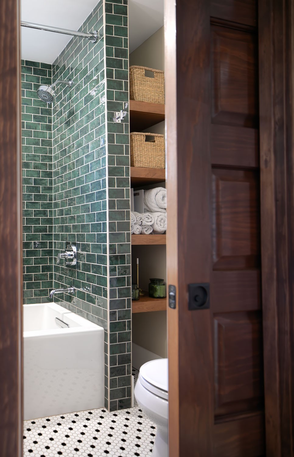 A nightmare in the form of a leaky old shower allowed this young couple to create the bathroom of their dreams in their new (old) home. A layout reconfiguration was in order to maximize storage capability and to be able to add a tub into the space. While the bathroom footprint is small, it is packed full of storage with a nice sized vanity, medicine cabinet, open shelves and storage niches in the shower. The bathroom door was converted to a pocket door to save space as well. Beautiful emerald green tiles, rich and warm wood tones and classic finishes in black white and chrome compliment the traditional character of their home.