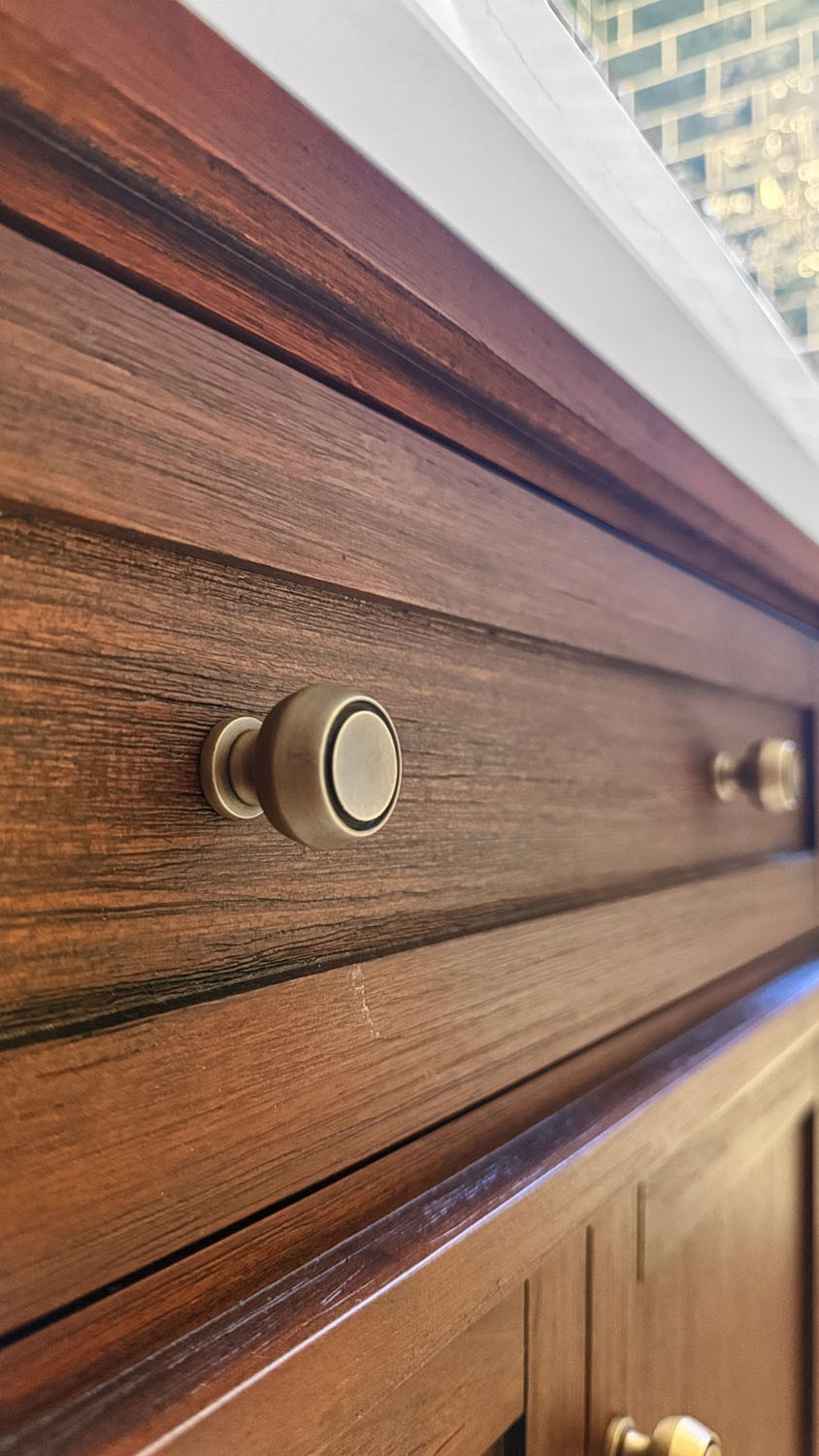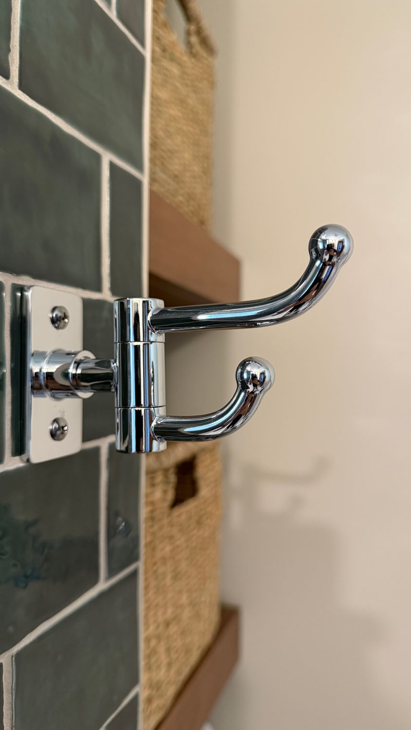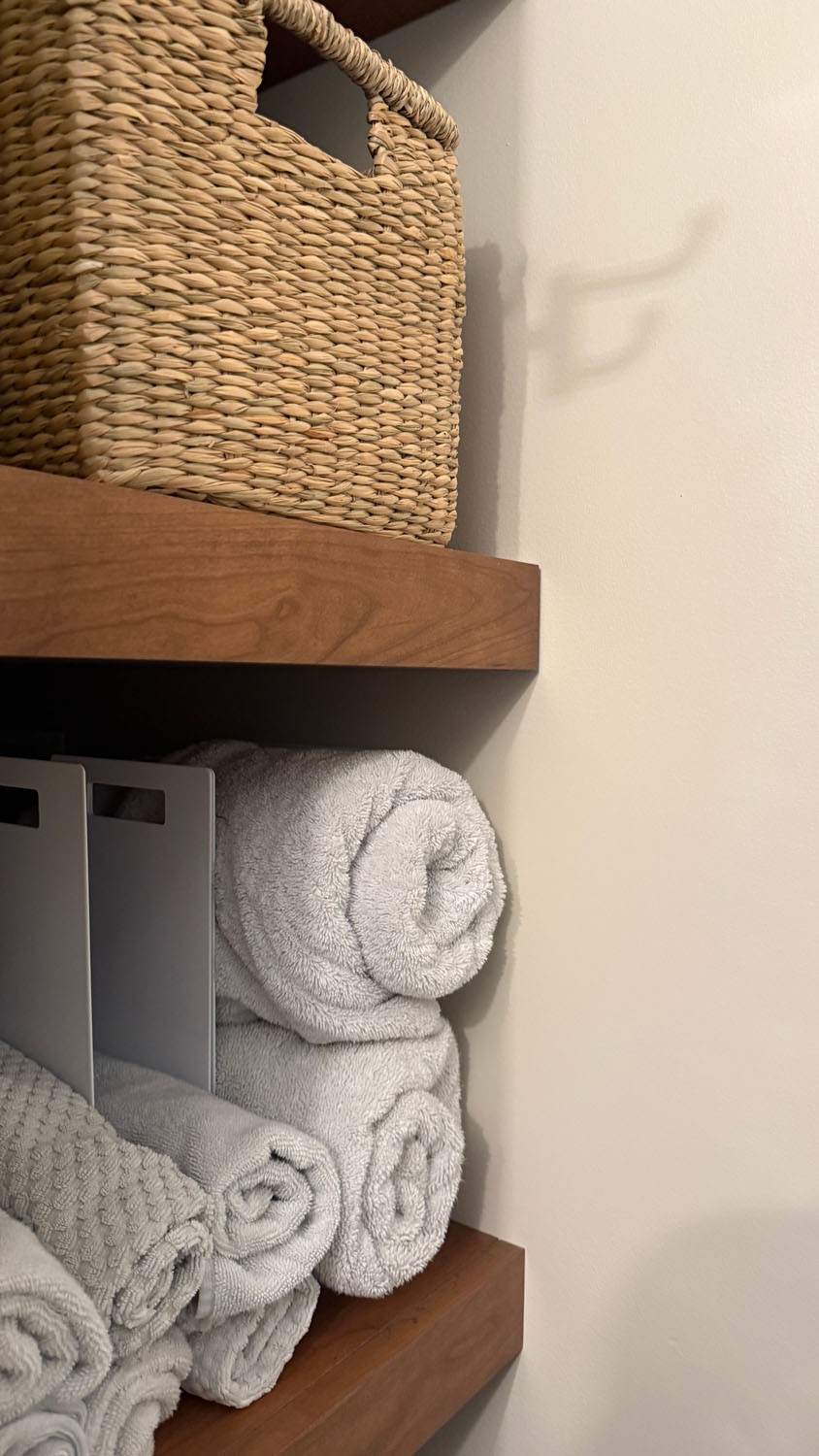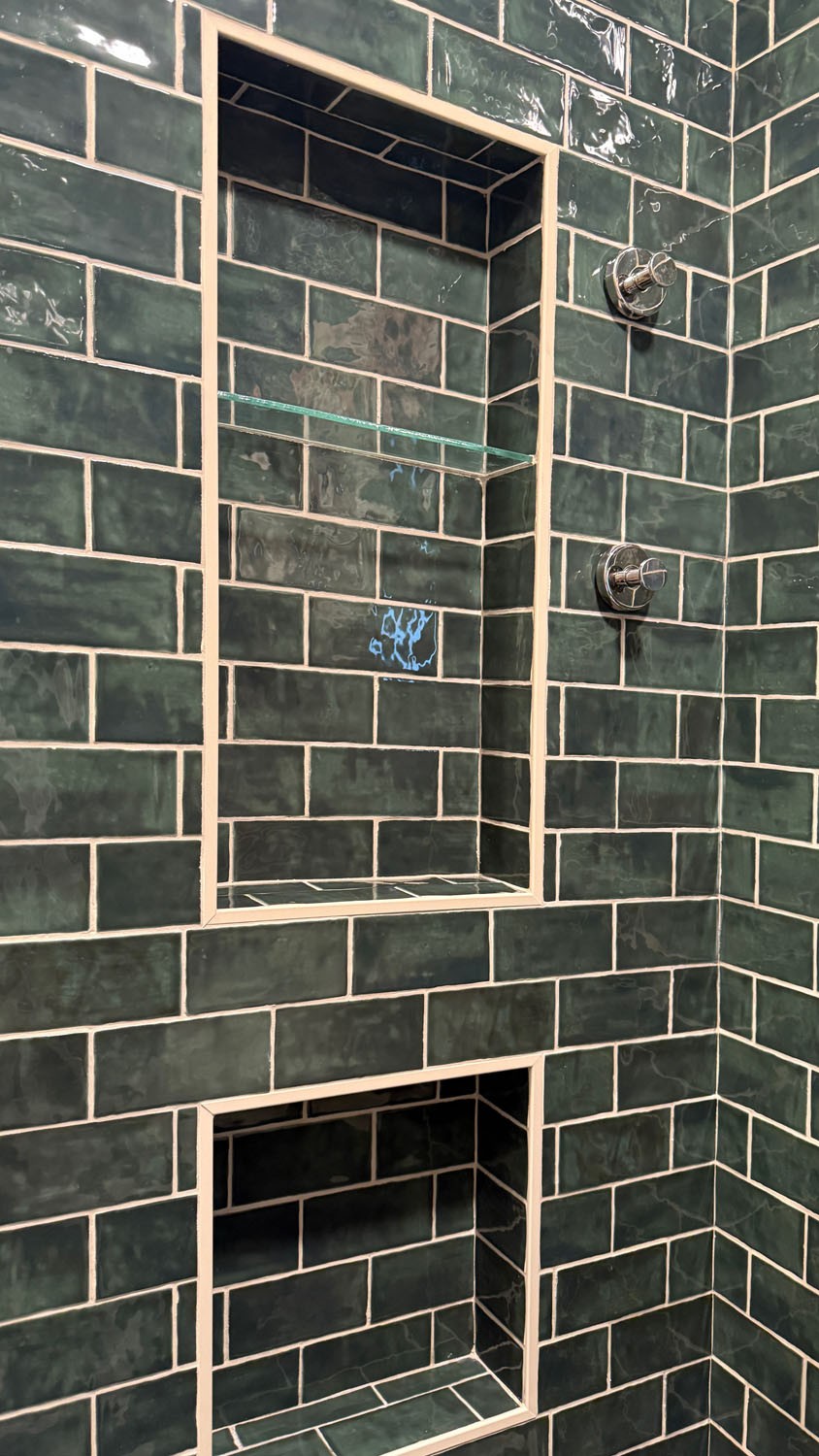 A nightmare in the form of a leaky old shower allowed this young couple to create the bathroom of their dreams in their new (old) home. A layout reconfiguration was in order to maximize storage capability and to be able to add a tub into the space. While the bathroom footprint is small, it is packed full of storage with a nice sized vanity, medicine cabinet, open shelves and storage niches in the shower. The bathroom door was converted to a pocket door to save space as well. Beautiful emerald green tiles, rich and warm wood tones and classic finishes in black white and chrome compliment the traditional character of their home.